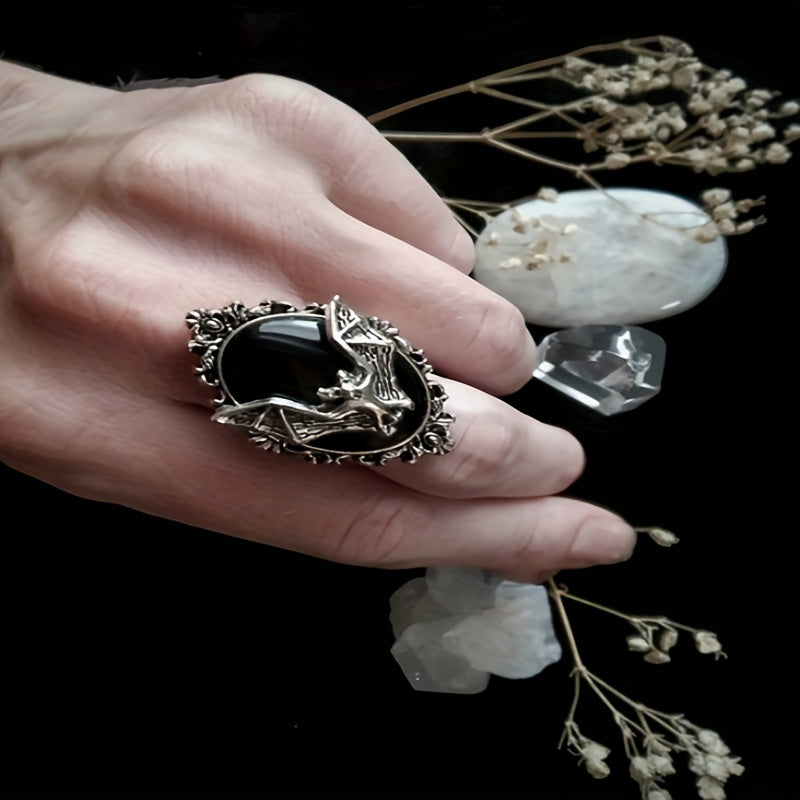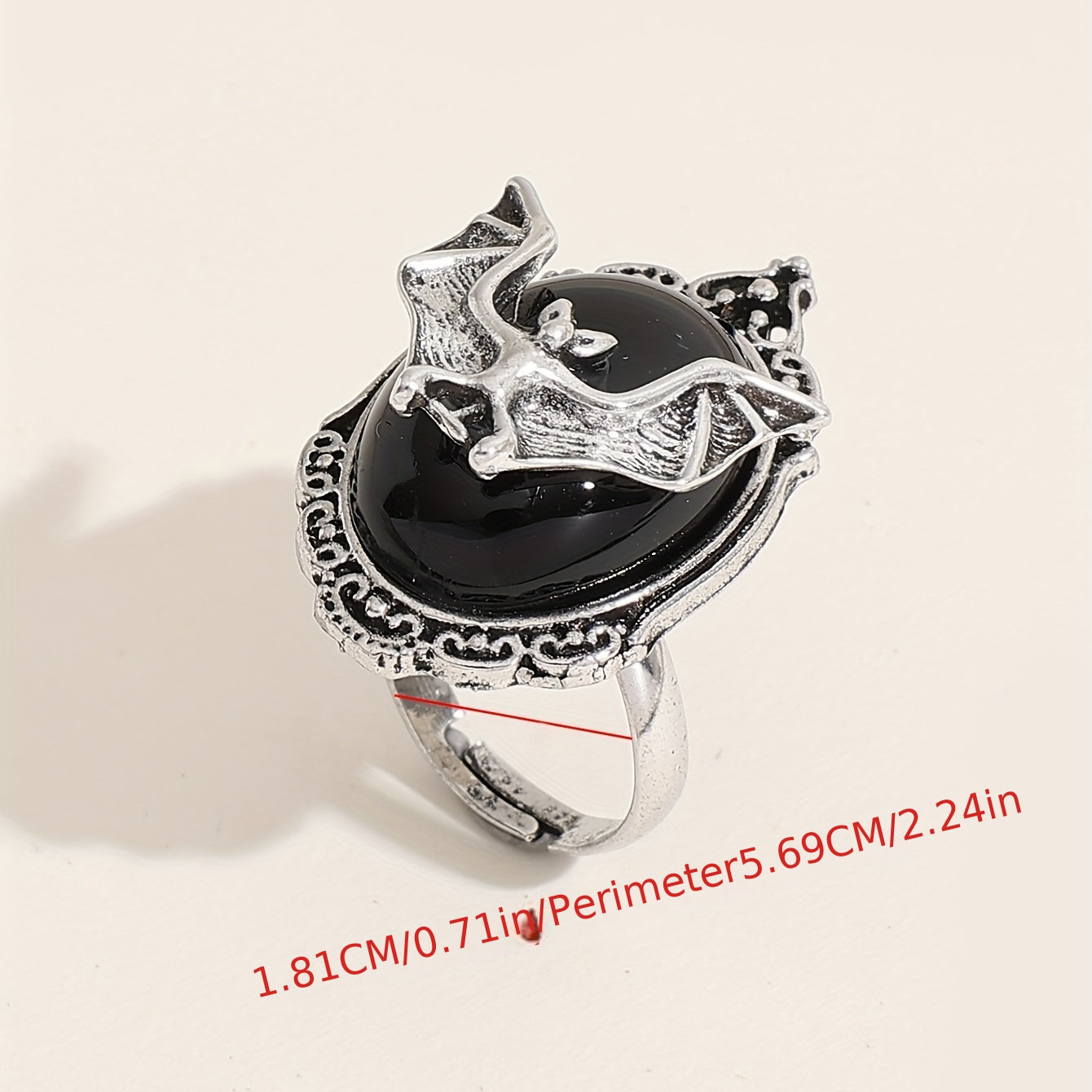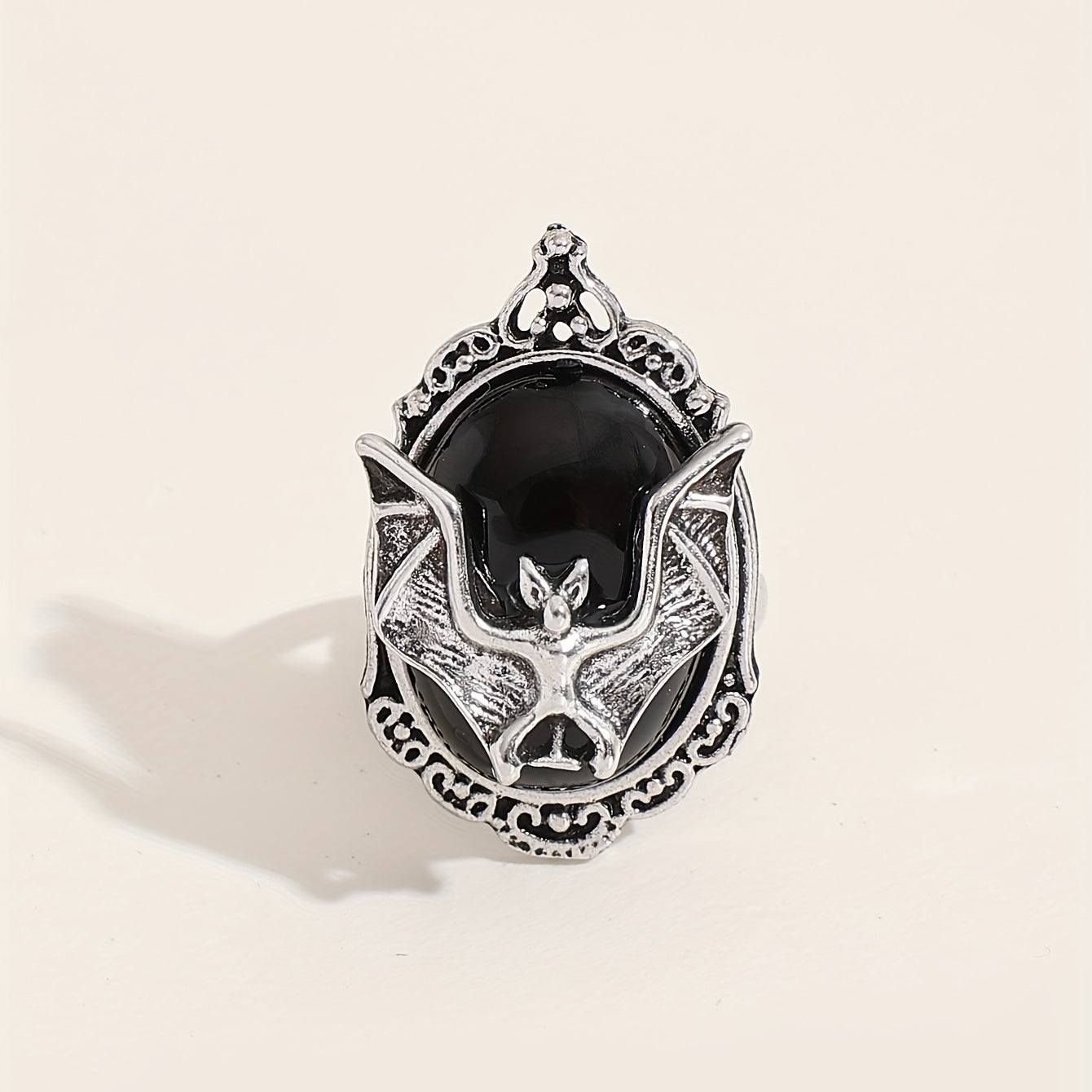 Add a spooky touch to your Halloween outfit with this bat ring featuring a faux gemstone. Perfect for Halloween parties or themed events.