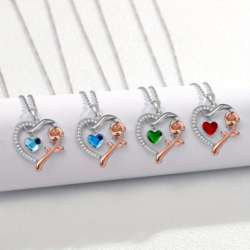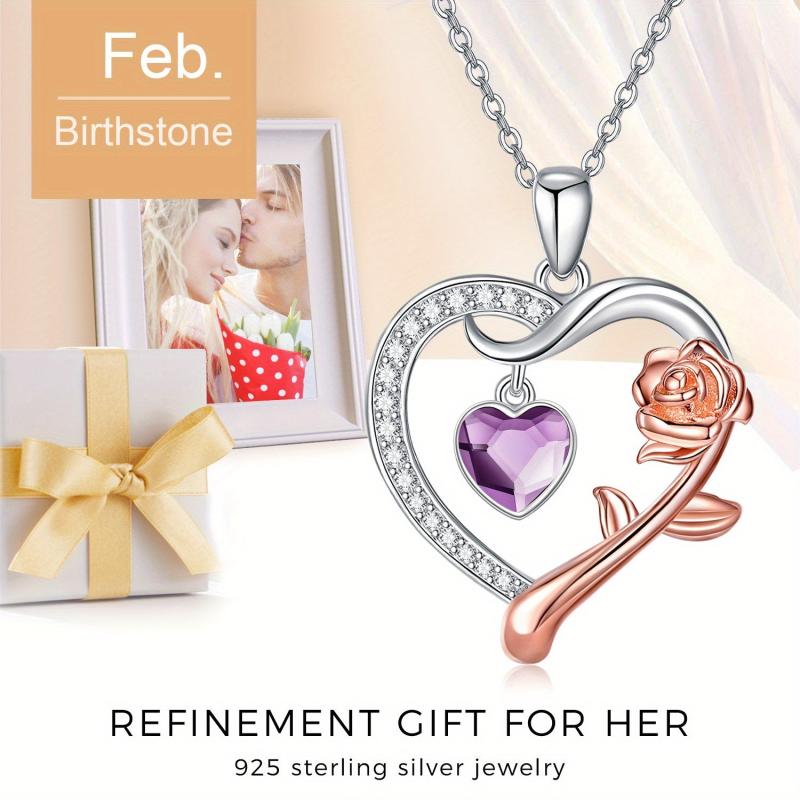This elegant necklace features a heart-shaped rose gold pendant with a February birthstone and sparkling cubic zirconia. Made of silvery 925 sterling silver, this necklace is a perfect gift for any occasion.