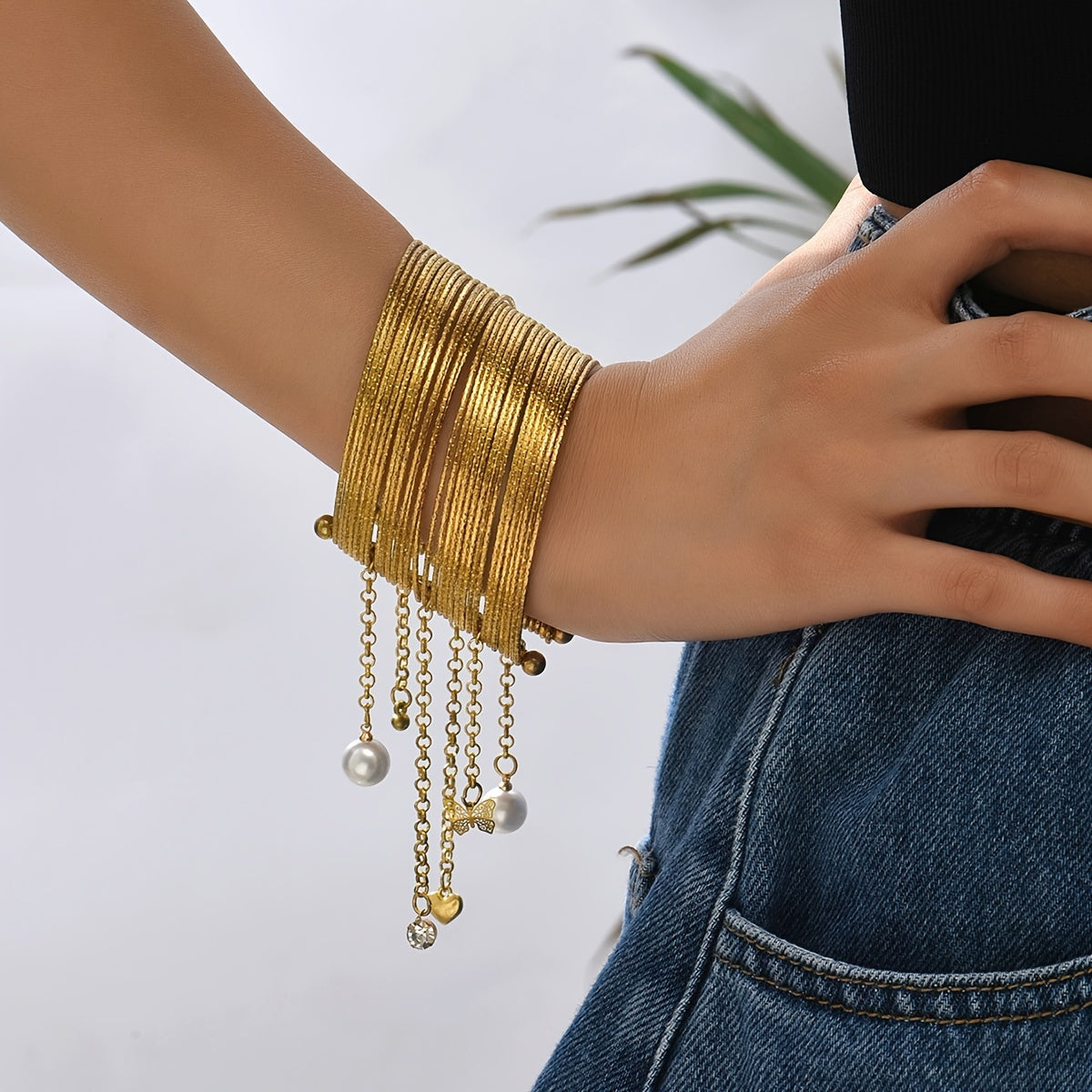 This elegant hollow chain pendant bangle bracelet is a versatile piece of hand jewelry that complements any clothing. It is delicately crafted with 14K gold plating for a luxurious look.
