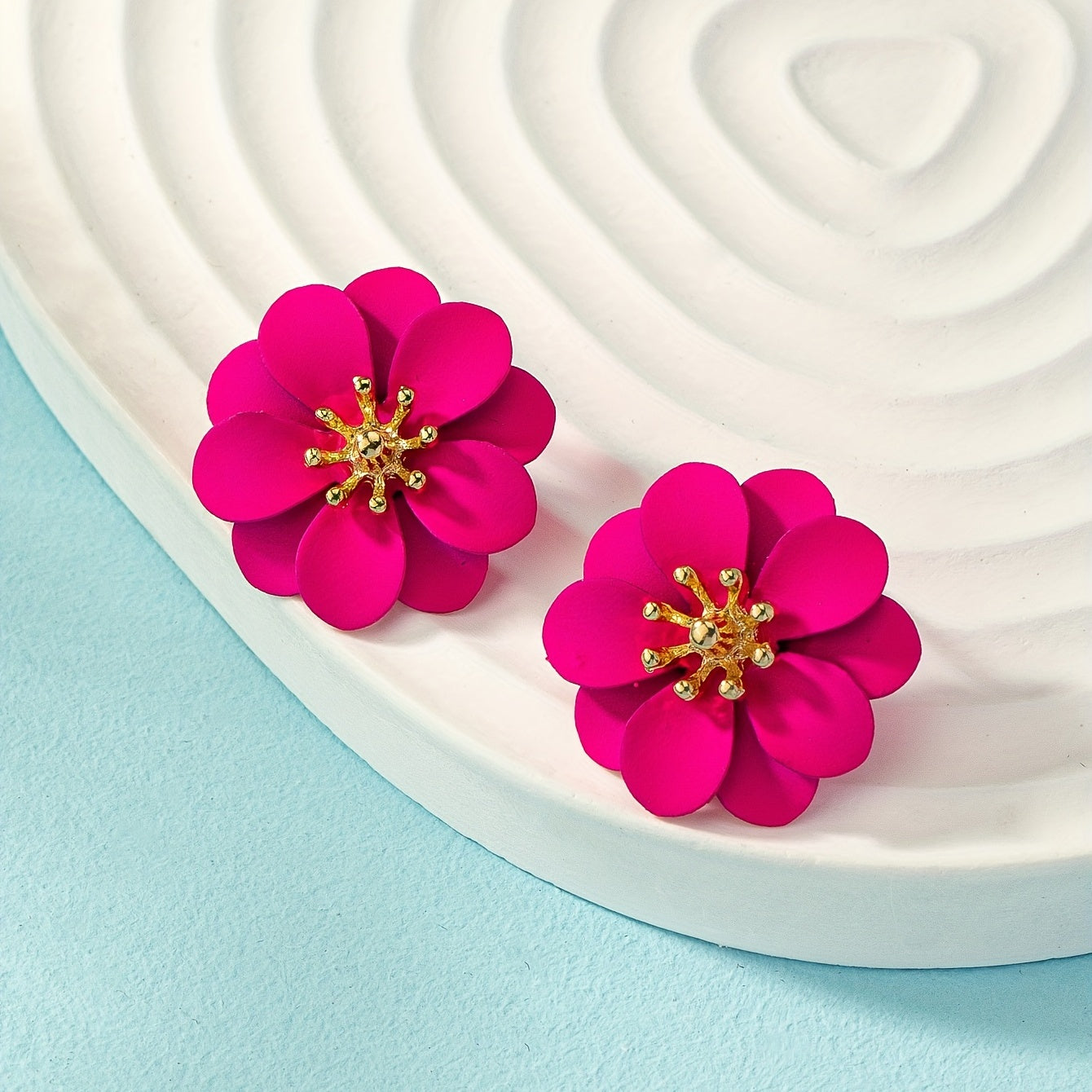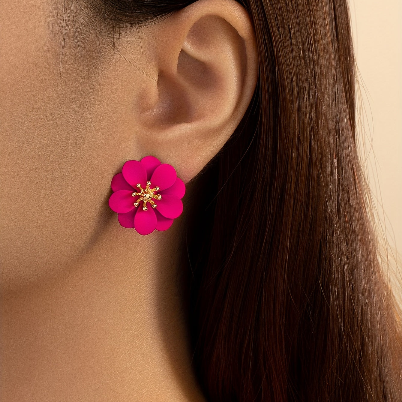 Add a pop of color to your outfit with these delicate hot pink flower stud earrings. Perfect for vocation style, these earrings are made of high-quality alloy with 18K gold plating, making them a great gift for any female.