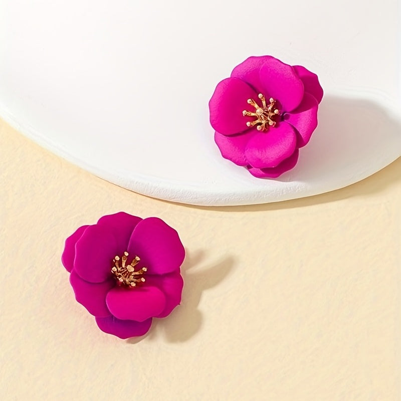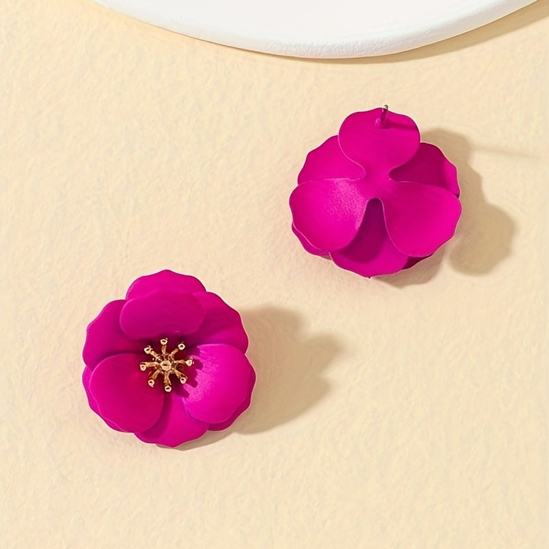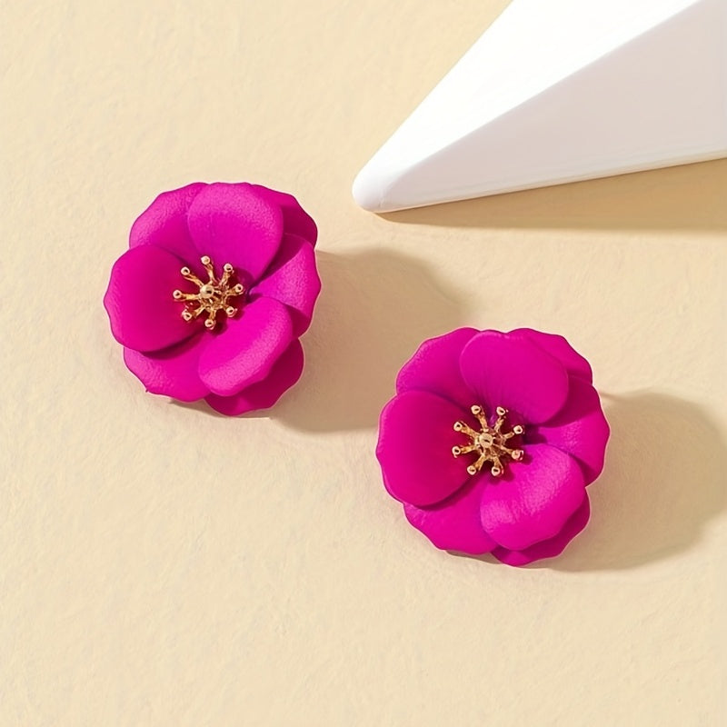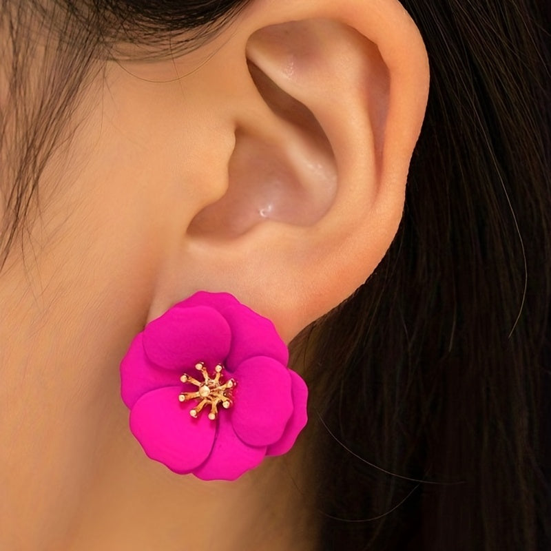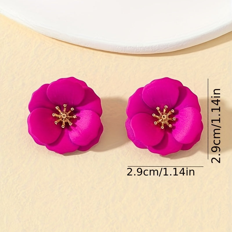 Hot Pink Flower Stud Earrings Bohemian Style Alloy Jewelry
