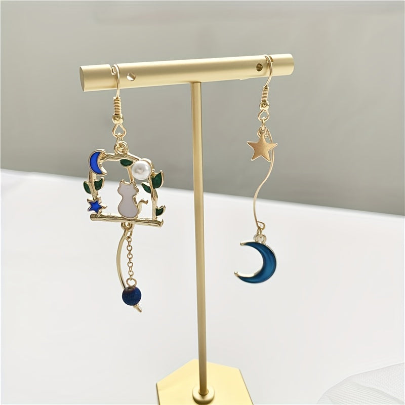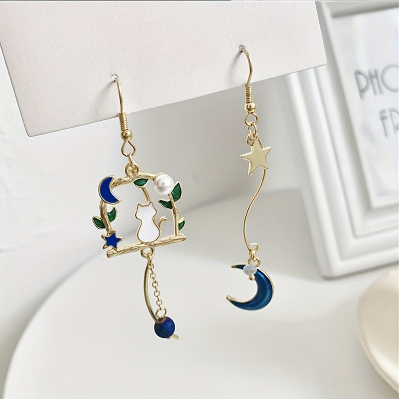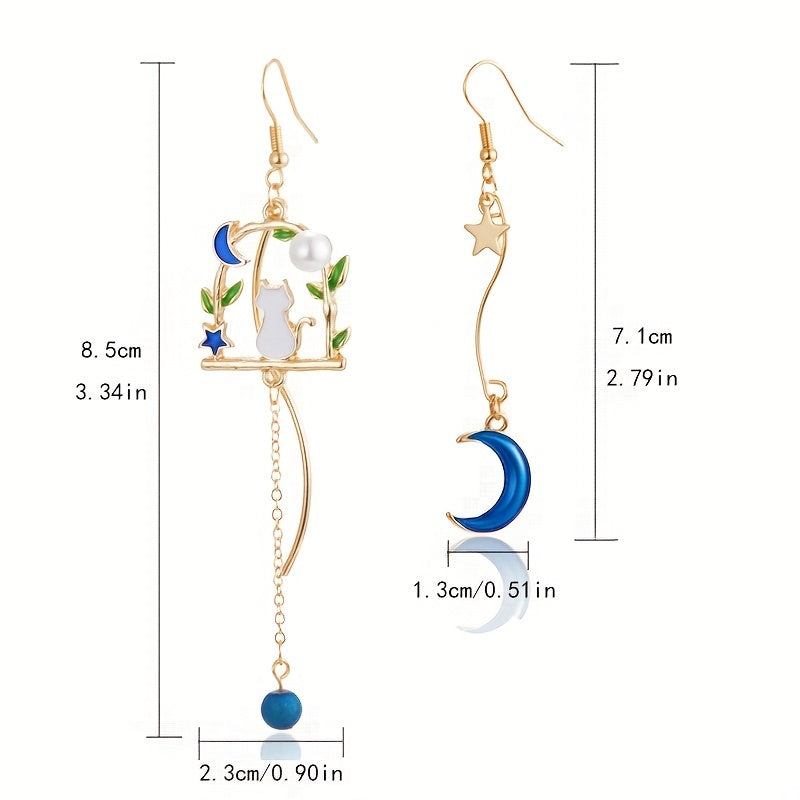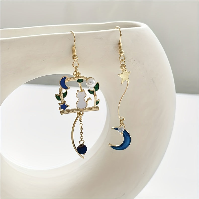 Add a touch of whimsical charm with these asymmetrical tassel earrings featuring adorable kitten, moon, star, and leaf designs.