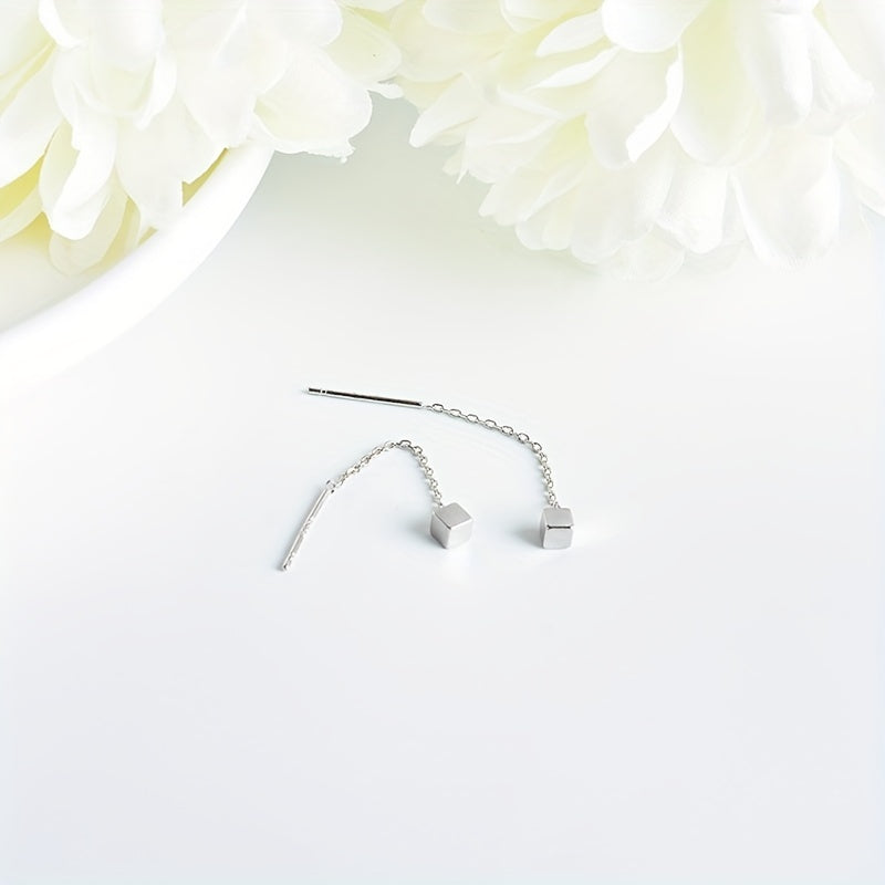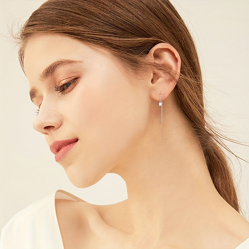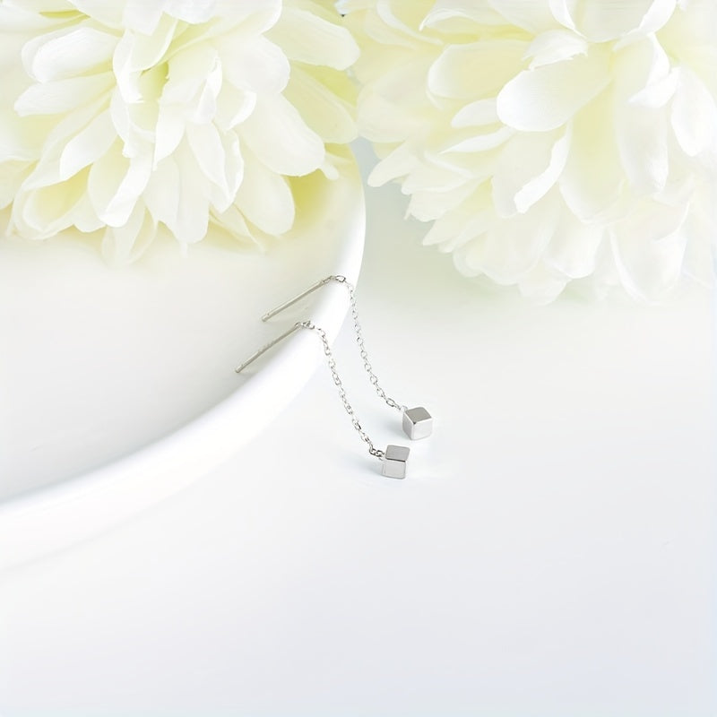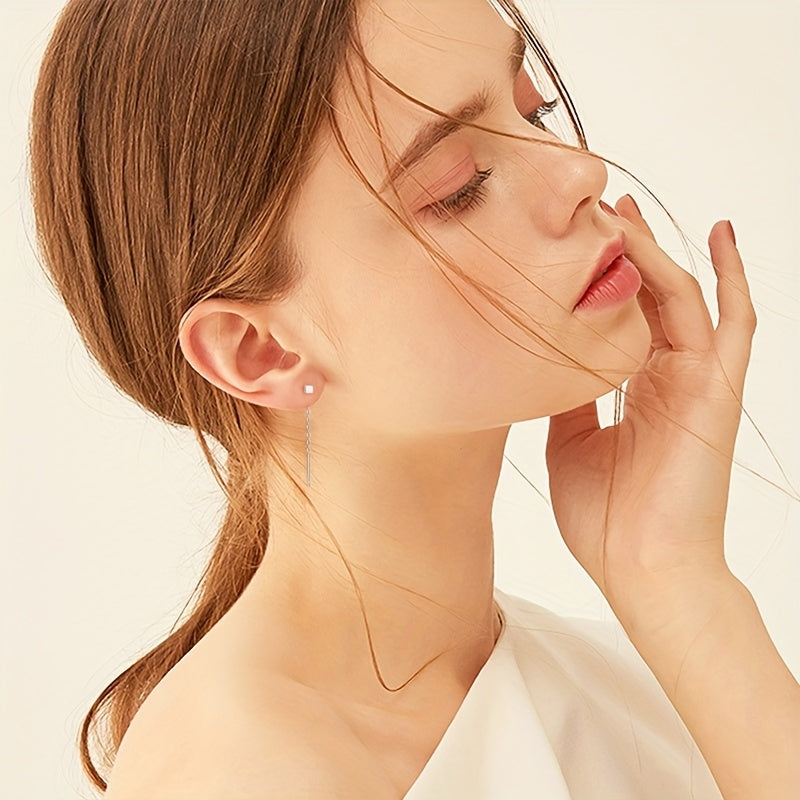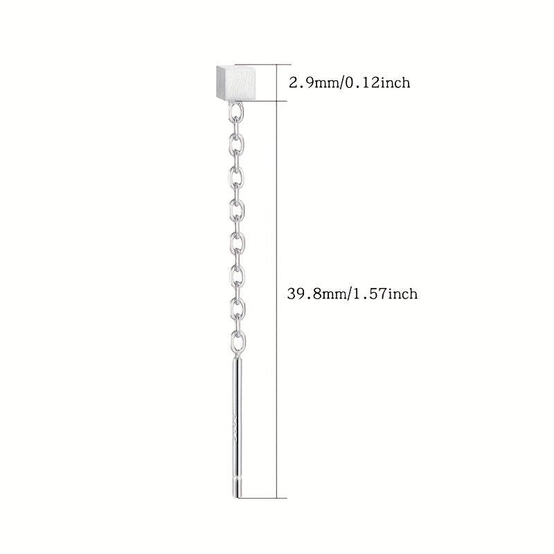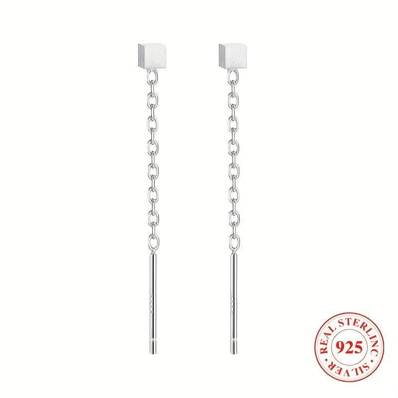 These silvery dangle earrings feature a minimalist design with a long chain. Made of sterling 925 silver, these earrings make a perfect gift for a female.