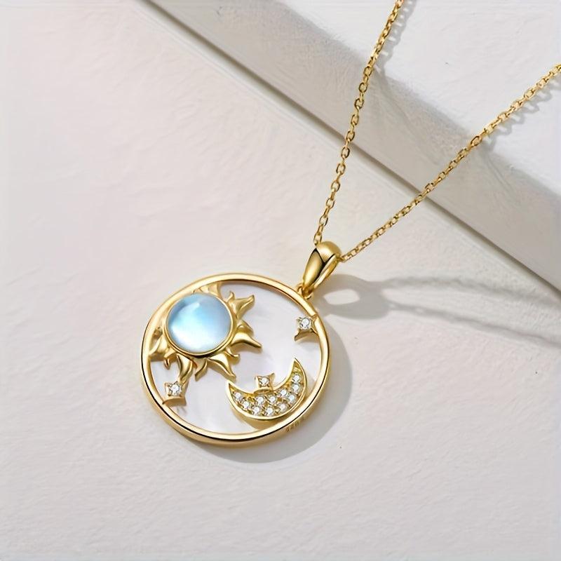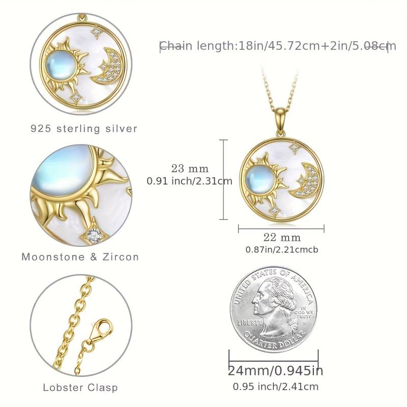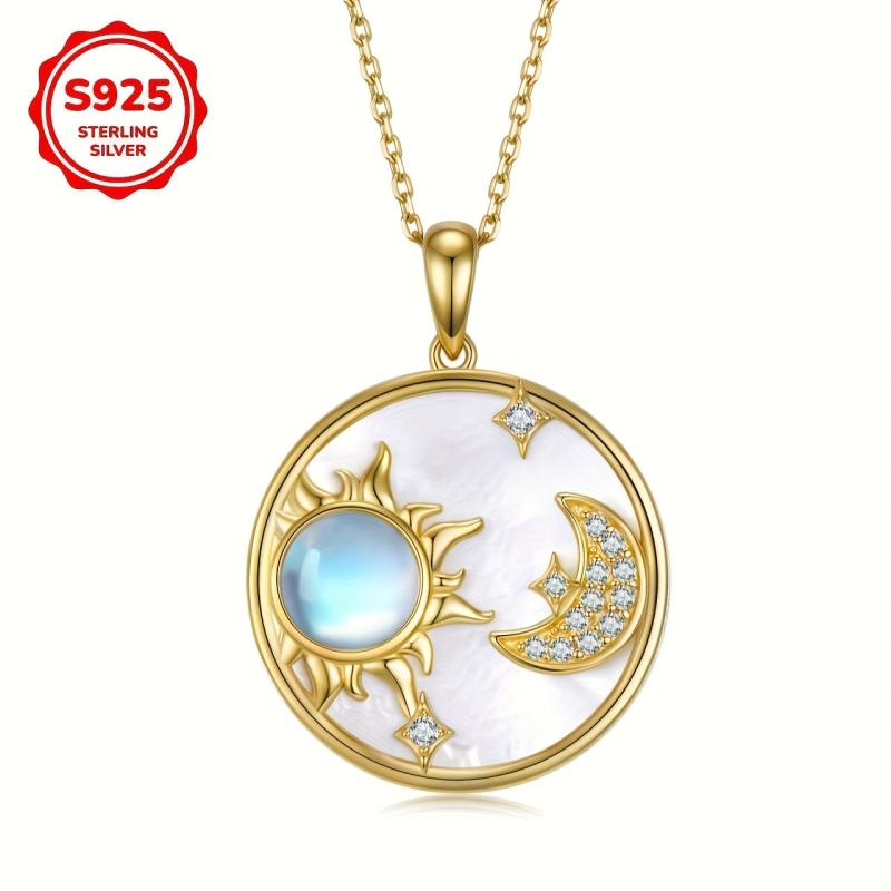 This elegant pendant necklace features a combination of moonstone, lily shell, and sun, moon, and star charms. Made of hypoallergenic S925 silver, it weighs 5g and is perfect for gifting to your girlfriend.