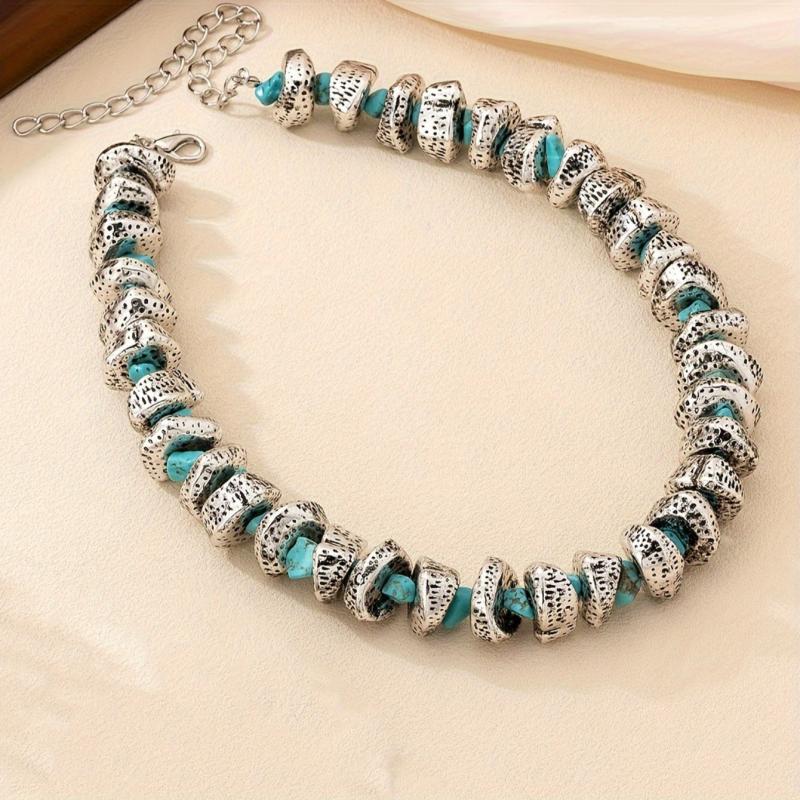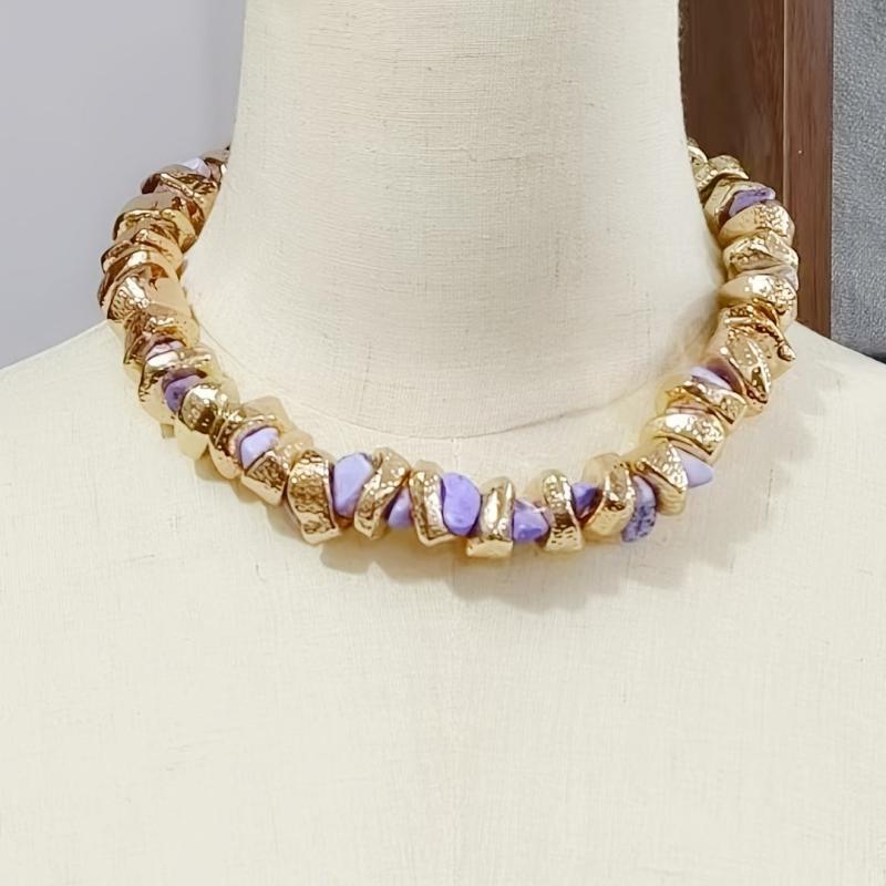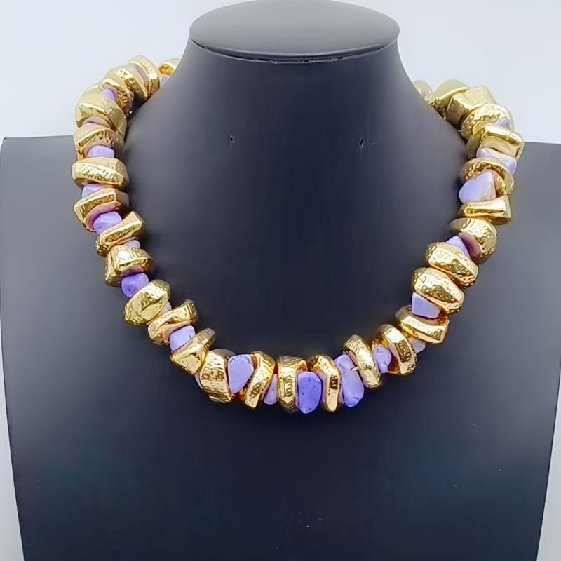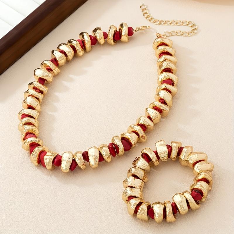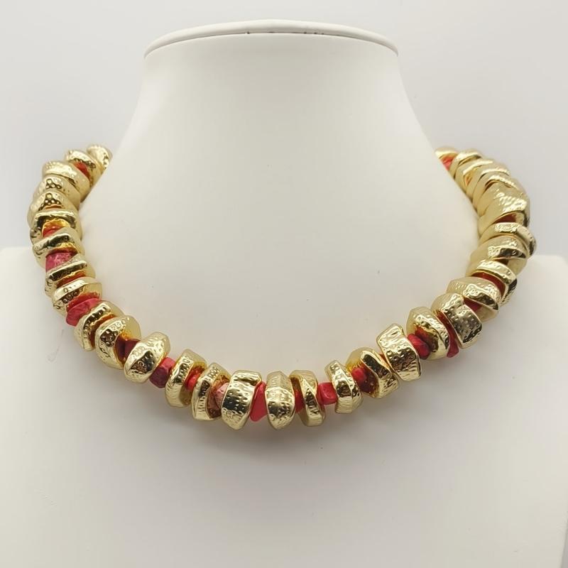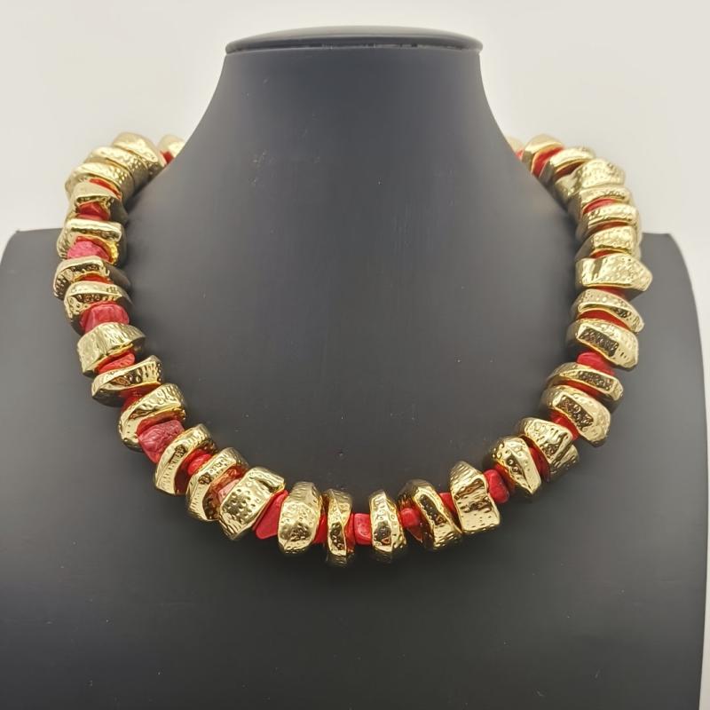 This bohemian necklace features irregular stone beads with red and golden accents. It is a layered statement piece that adds a vintage touch to your look.
