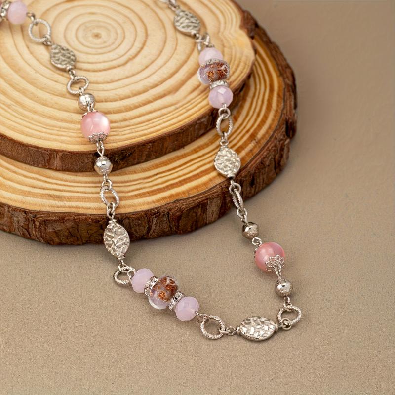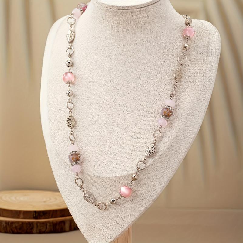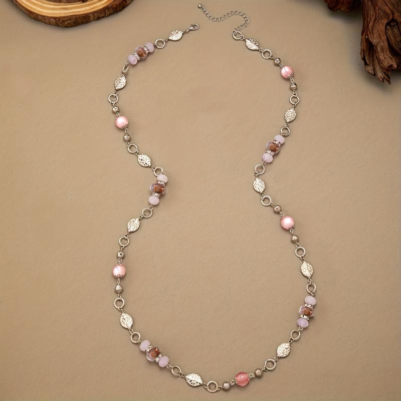 Elevate your style with this pink beaded geometric bohemian long necklace that adds a trendy touch to any outfit.