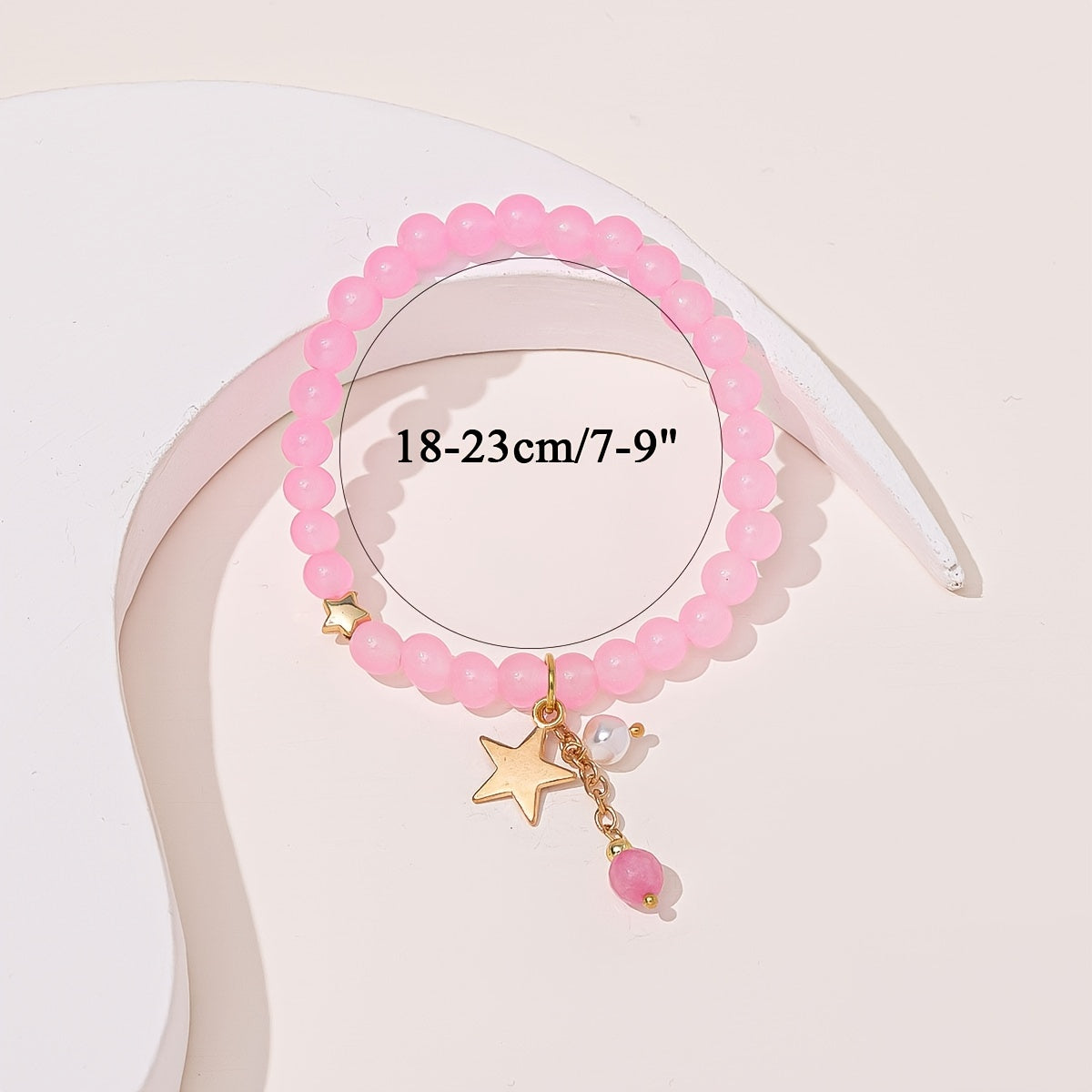 Pink Crystal Beaded Bracelet Star Shape Pendant Stretchable Bracelet