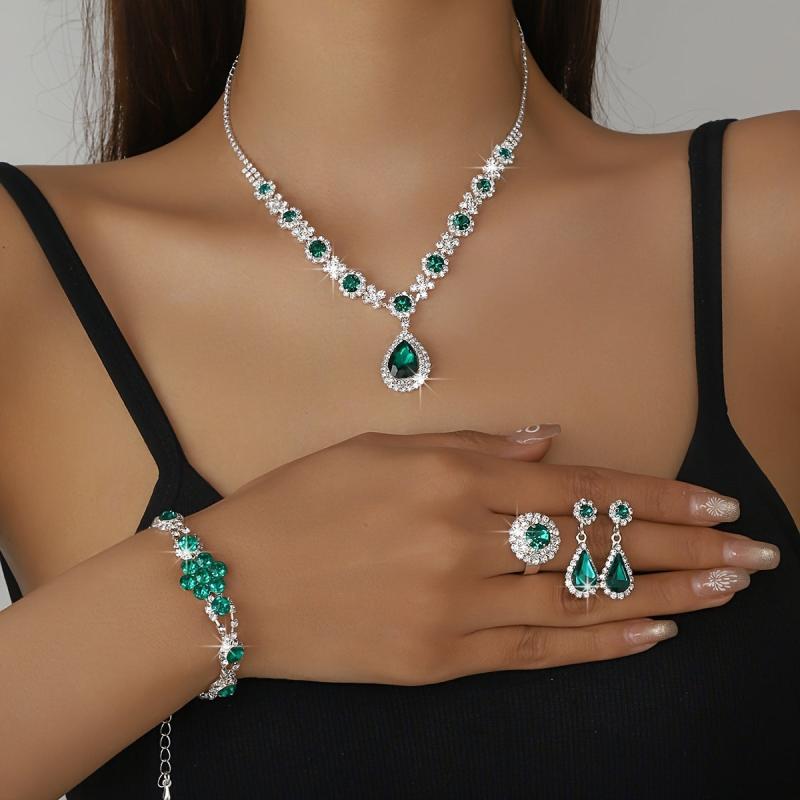 Complete your formal look with this stunning 4-piece set that includes a necklace, bracelet, earrings, and ring. Featuring a delicate flower drop design and rhinestone embellishments, this set is perfect for weddings, photography, and other special occasions.