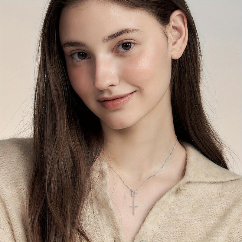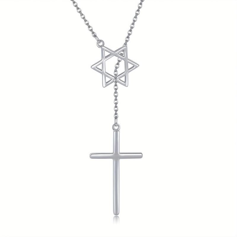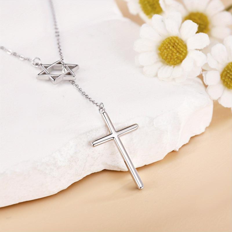 This stunning necklace features a cross and Star of David layered pendant, crafted in sterling silver. Perfect cross jewellery for women.