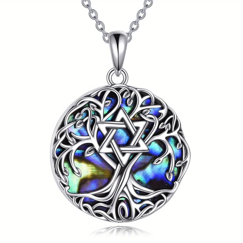 This stunning Tree of Life necklace features a Star of David design adorned with abalone shell, perfect for both women and men.
