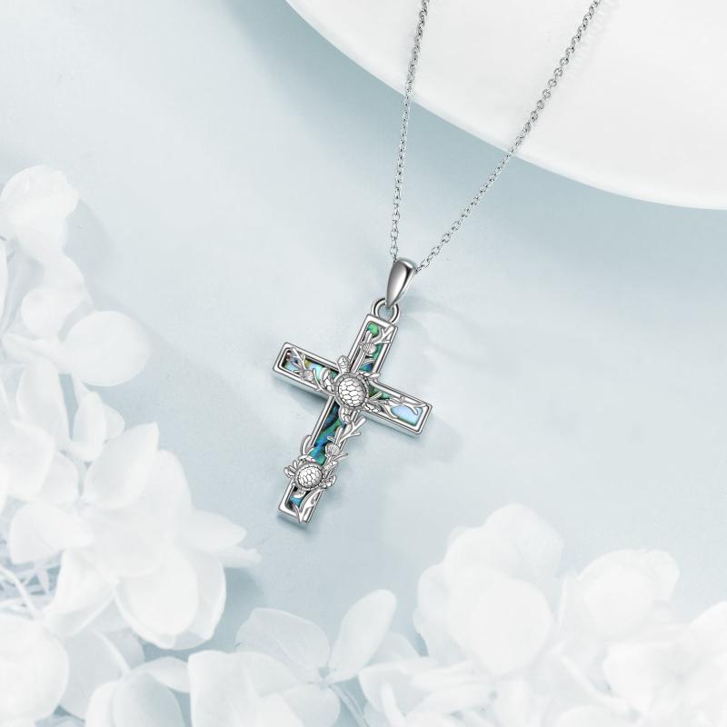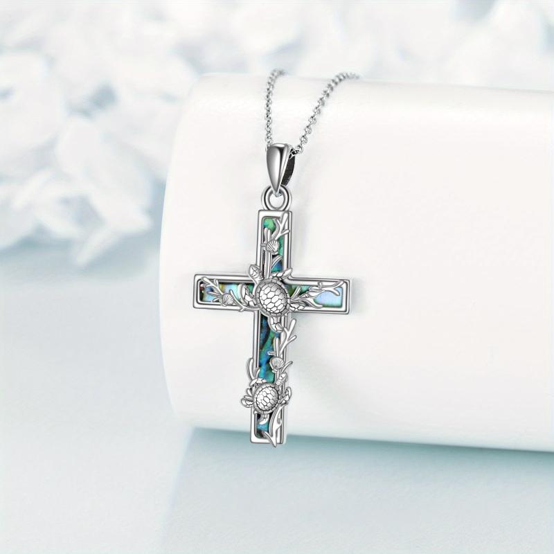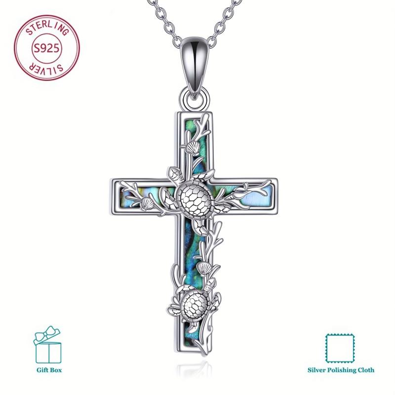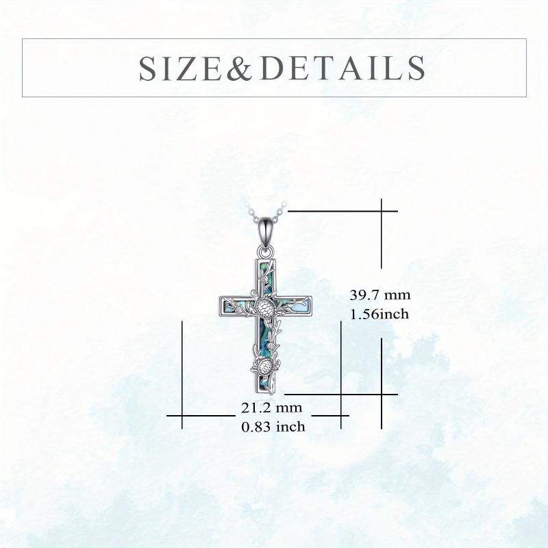 This stunning sterling silver cross pendant features a sea turtle design with beautiful abalone shell inlay. Perfect for those who love the ocean and a great gift for a baptism or Christian event.