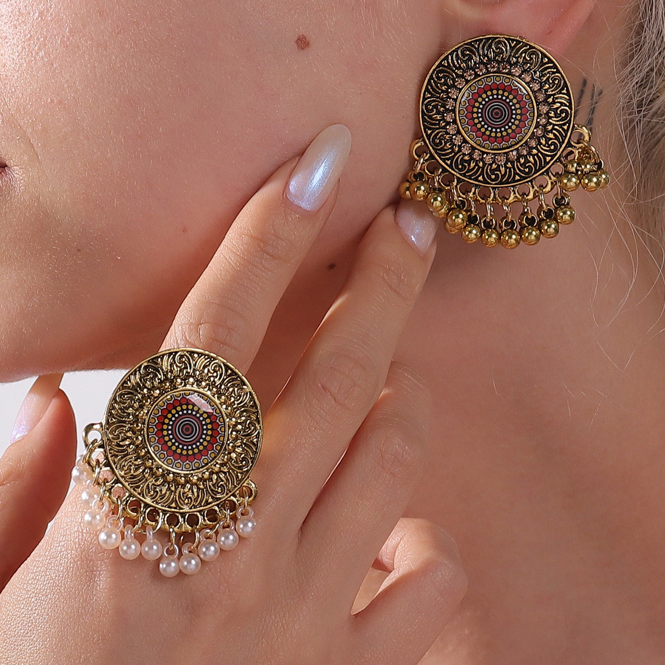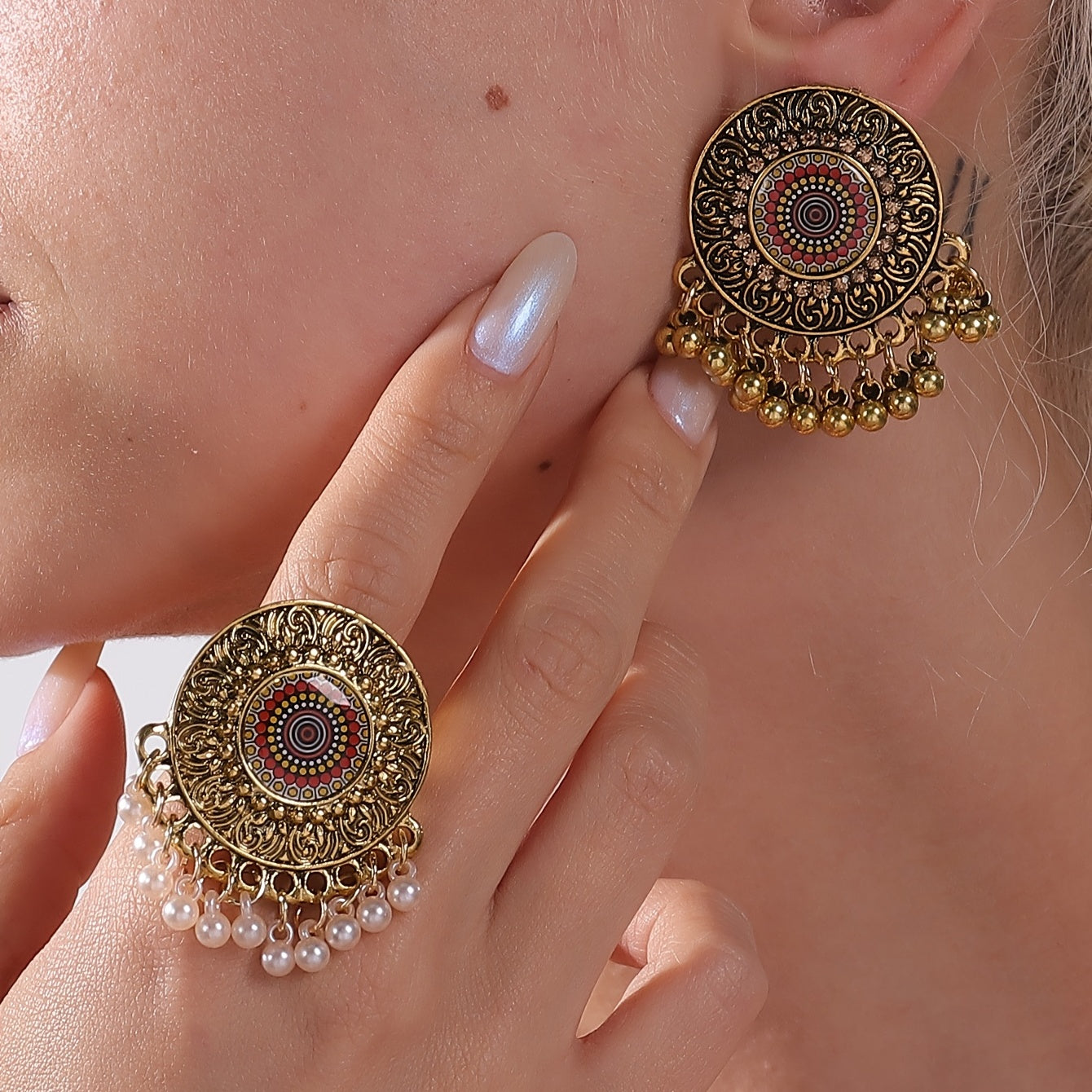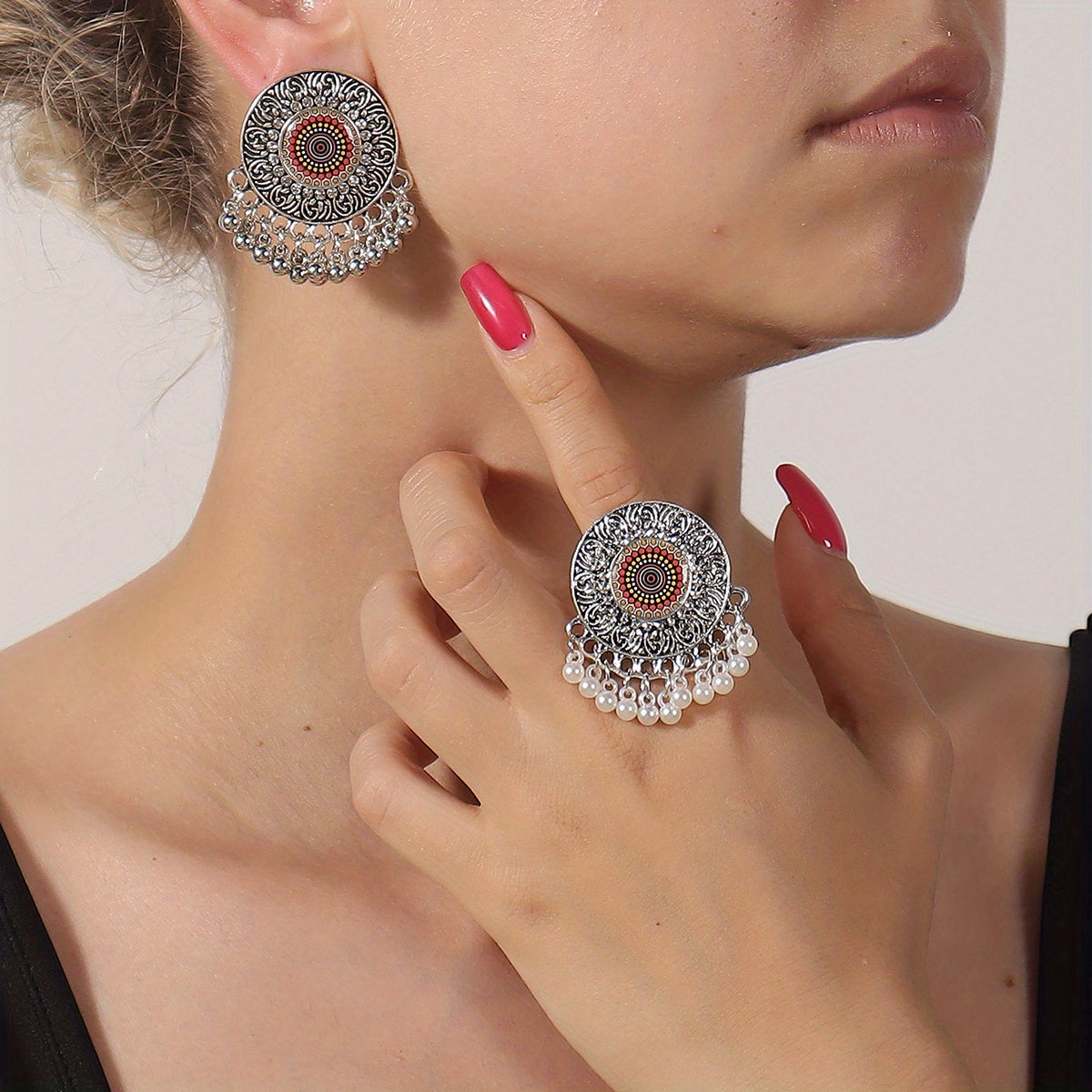 Make a statement with this exaggerated jewelry set inspired by vintage court style. The set includes large round drop earrings and a matching ring.