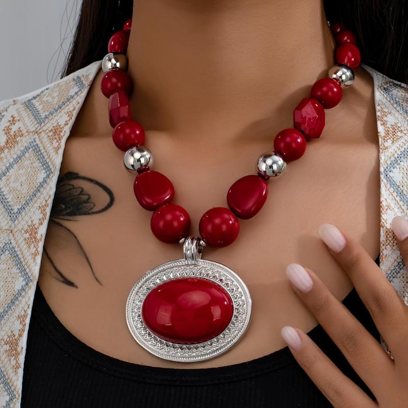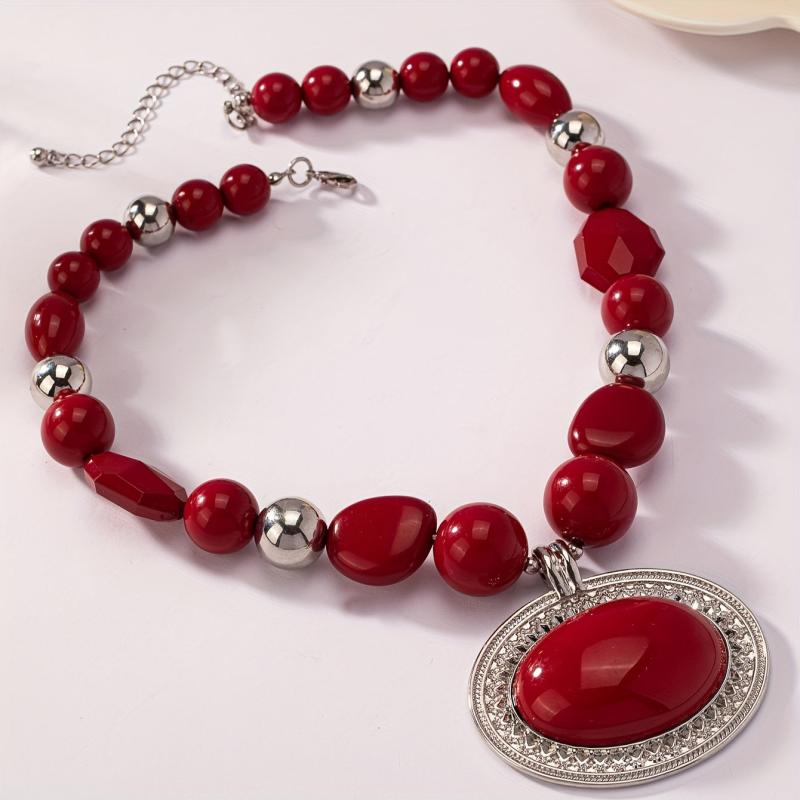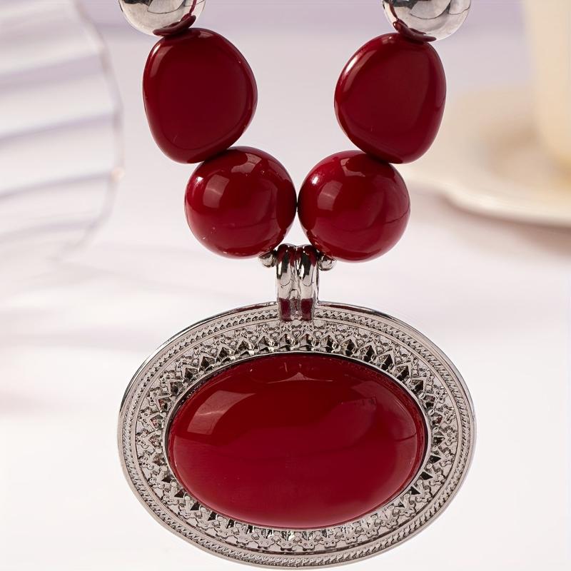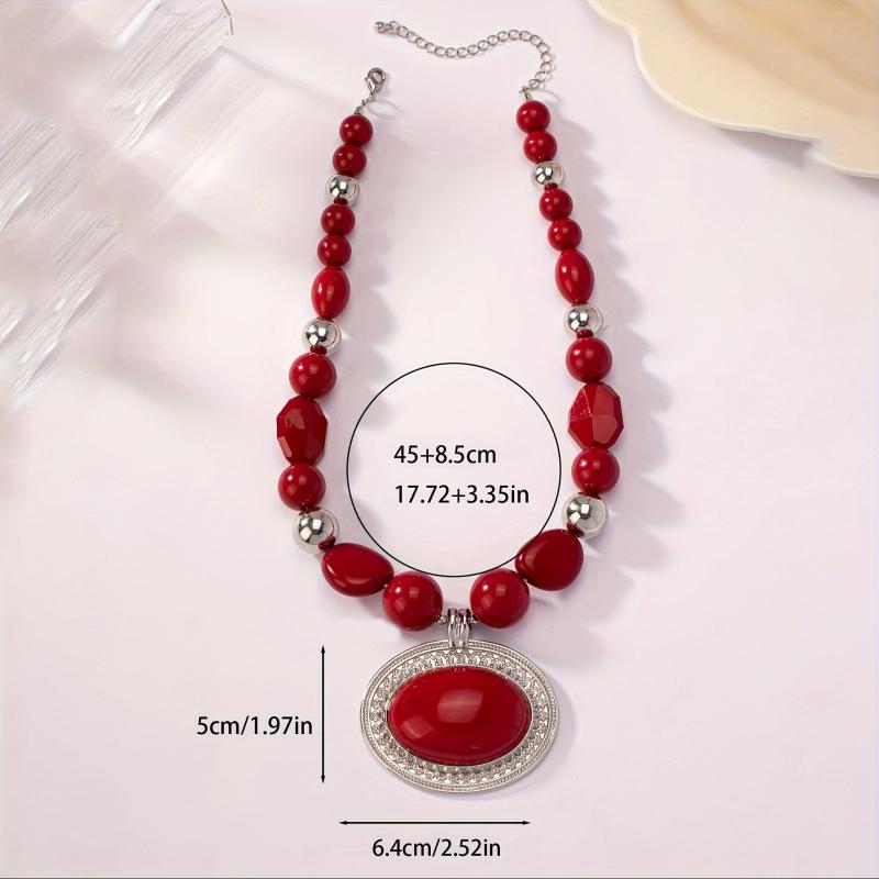 Make a statement with this bold red bead necklace featuring a metallic oval pendant. Perfect for daily wear or vacation outfits year-round.