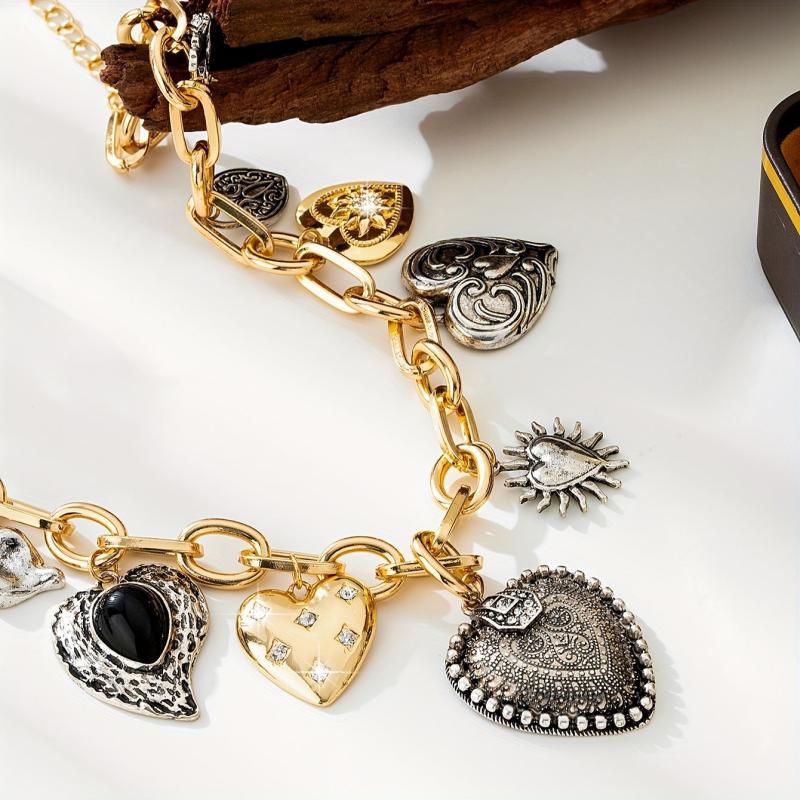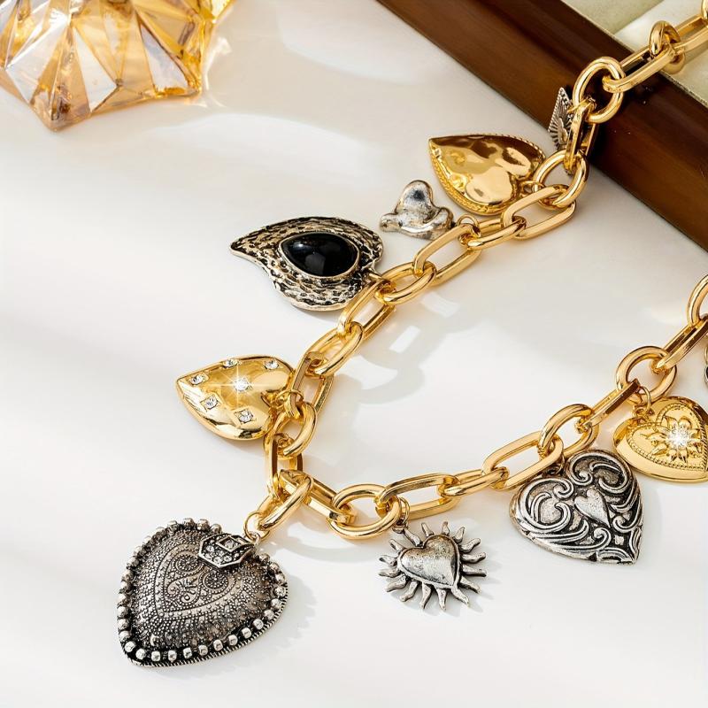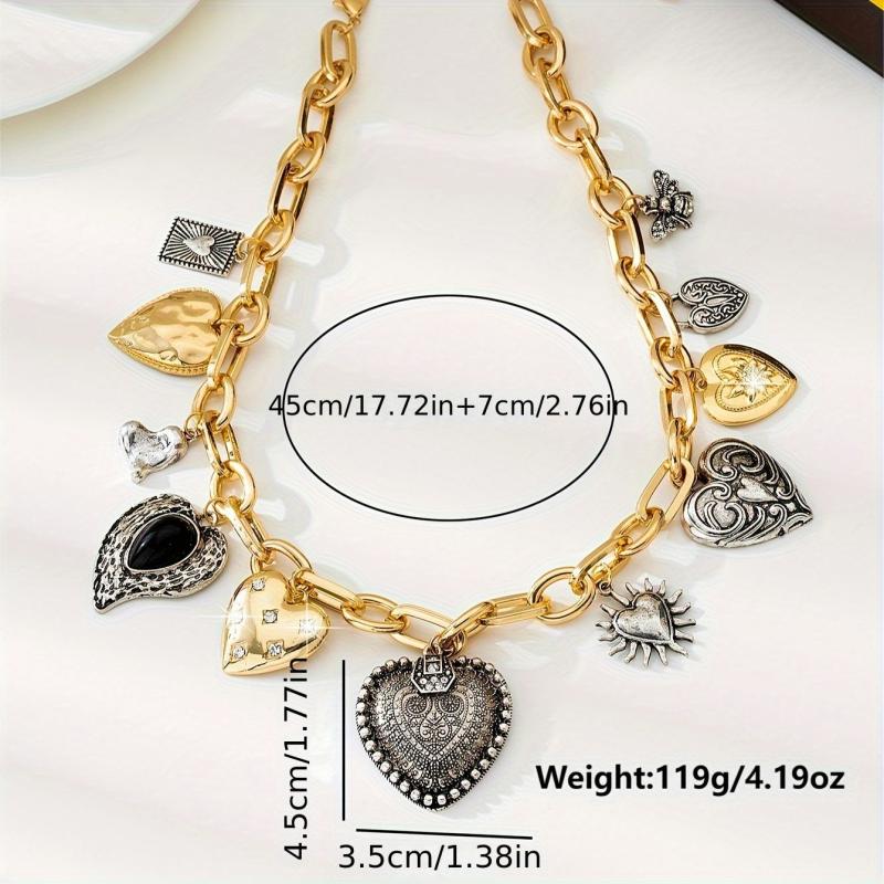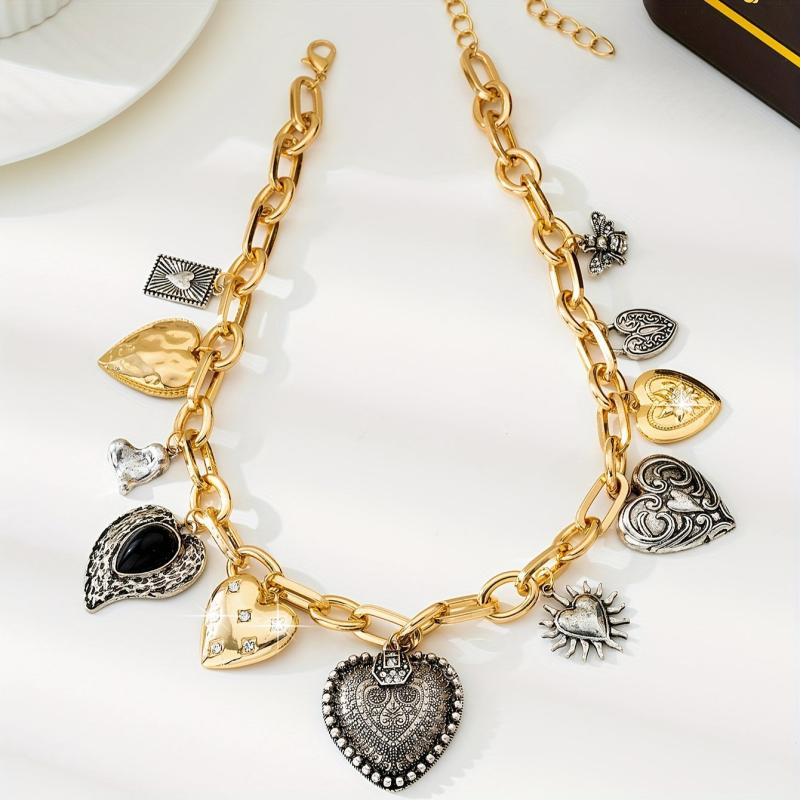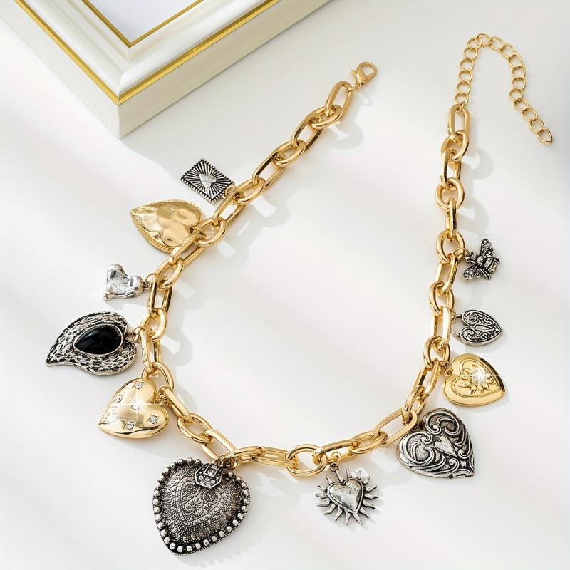 Elevate your style with this vintage hip hop necklace featuring a rhinestone heart pendant, layered chain, and mixed heart charms. Perfect for everyday wear or as a thoughtful gift for women.