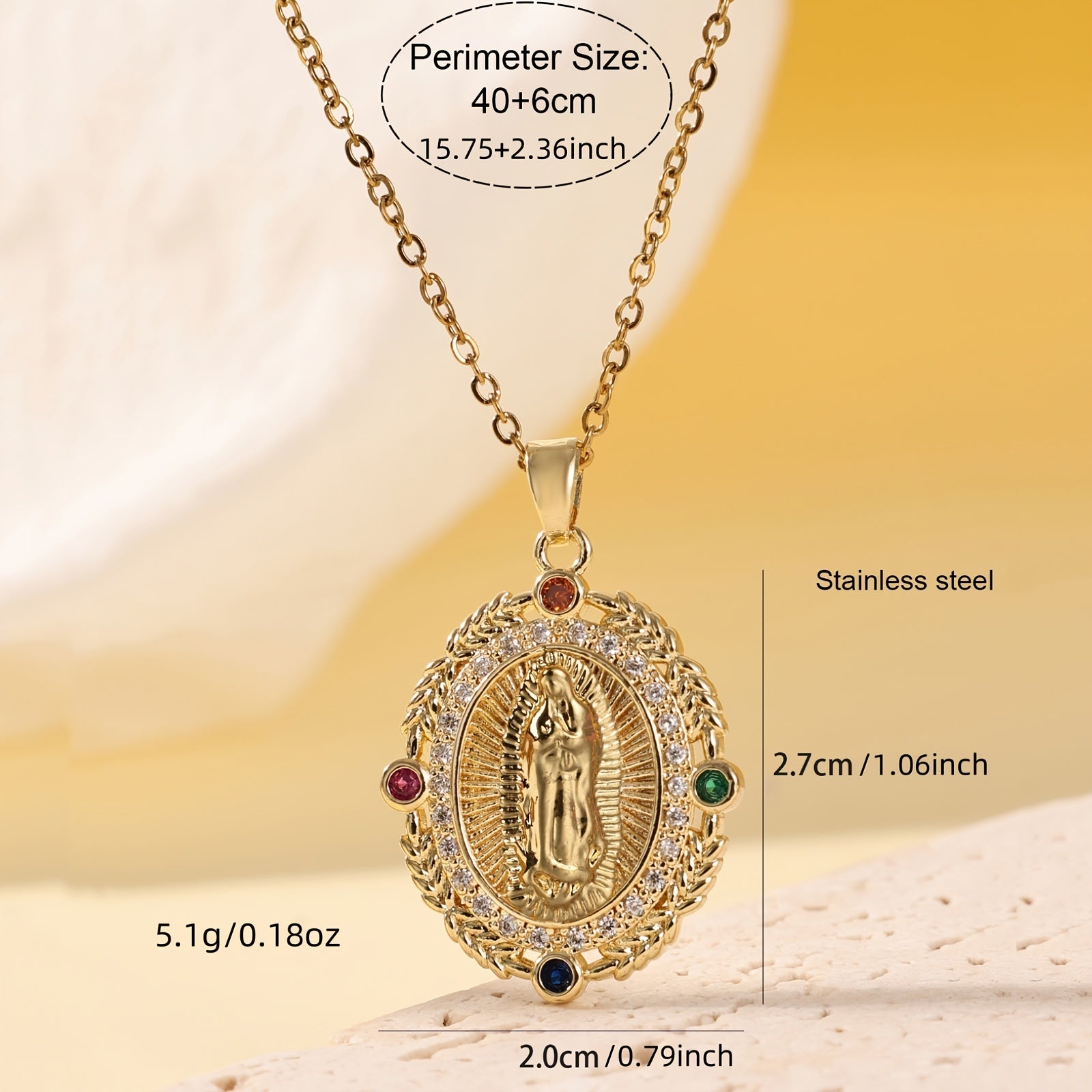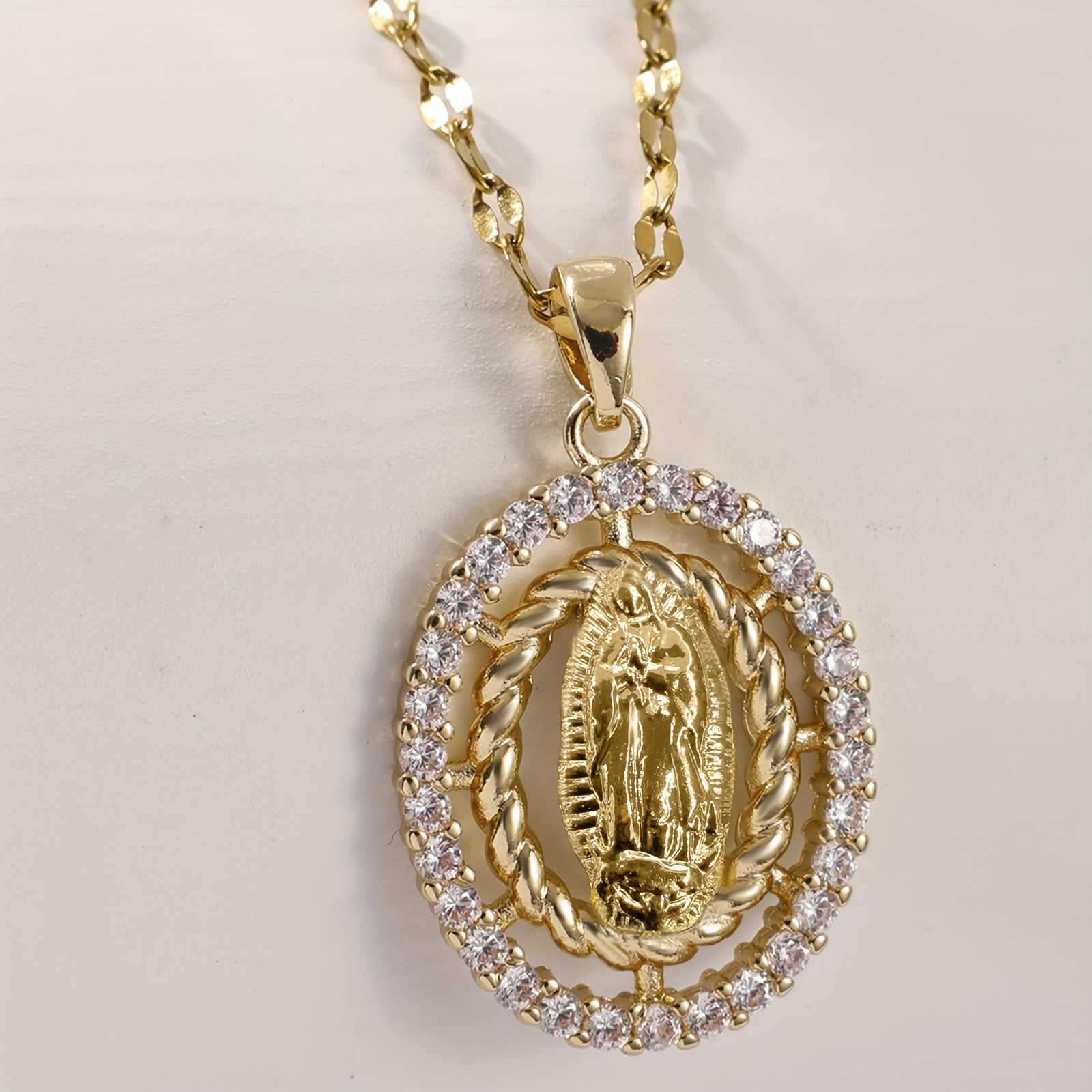 Elegant 18K gold-plated alloy necklace featuring a beautiful oval pendant of Virgin Mary with dazzling zirconia inlay, perfect for those seeking religious symbolism in their accessories.