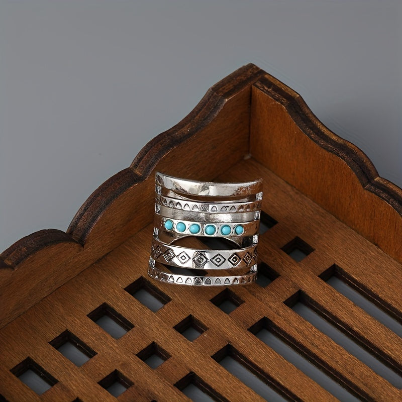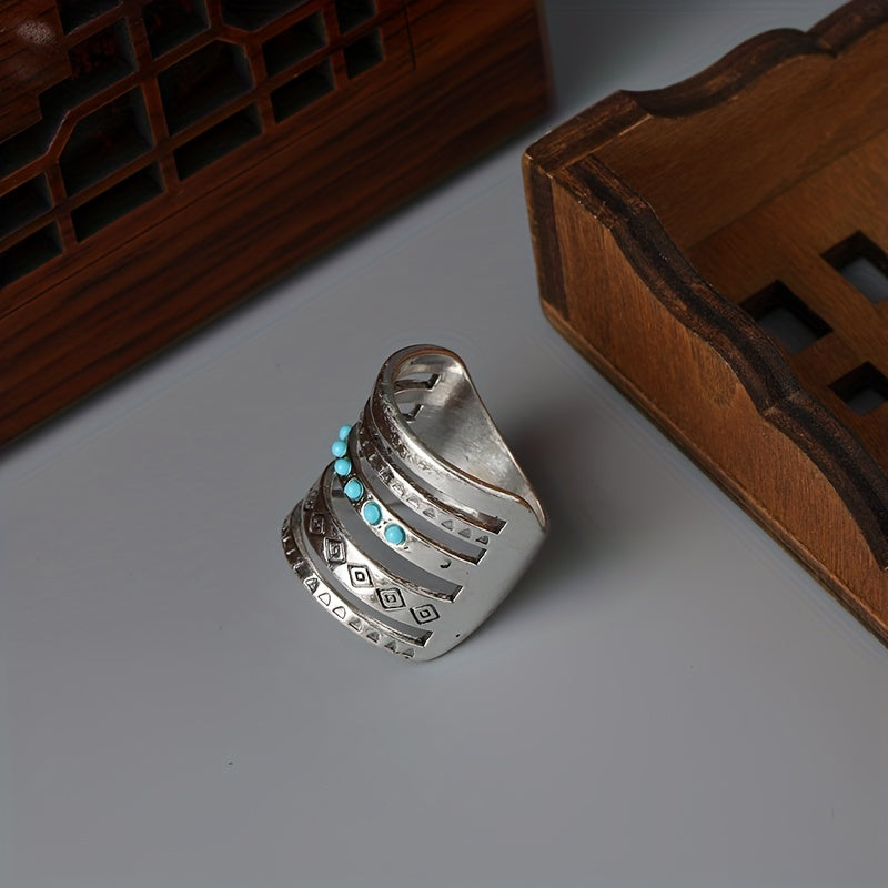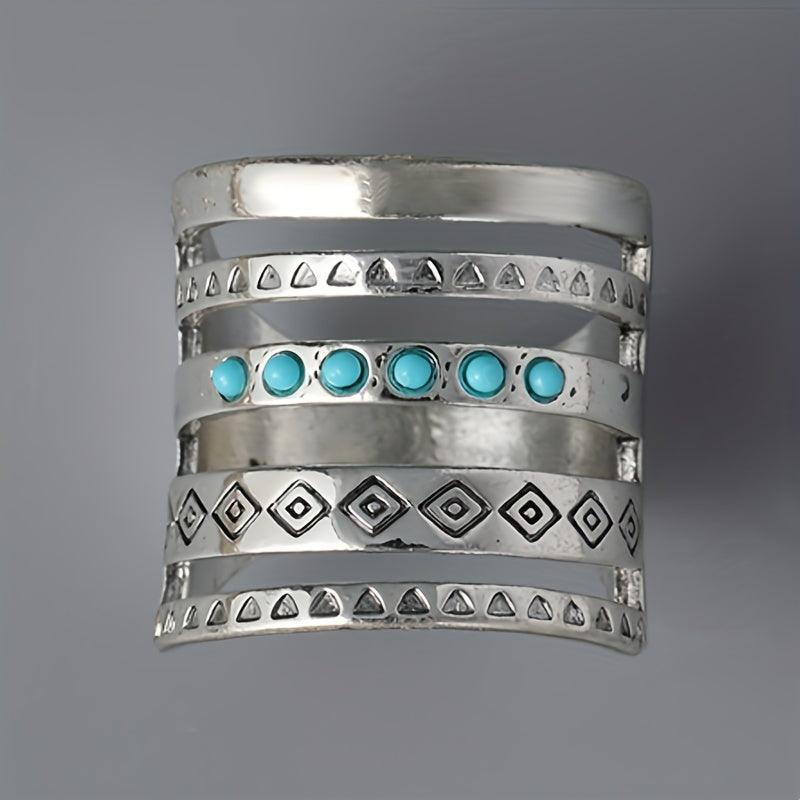 Vintage Wide Ring 925 Silver Plated Turquoise Inlaid Hollow Design