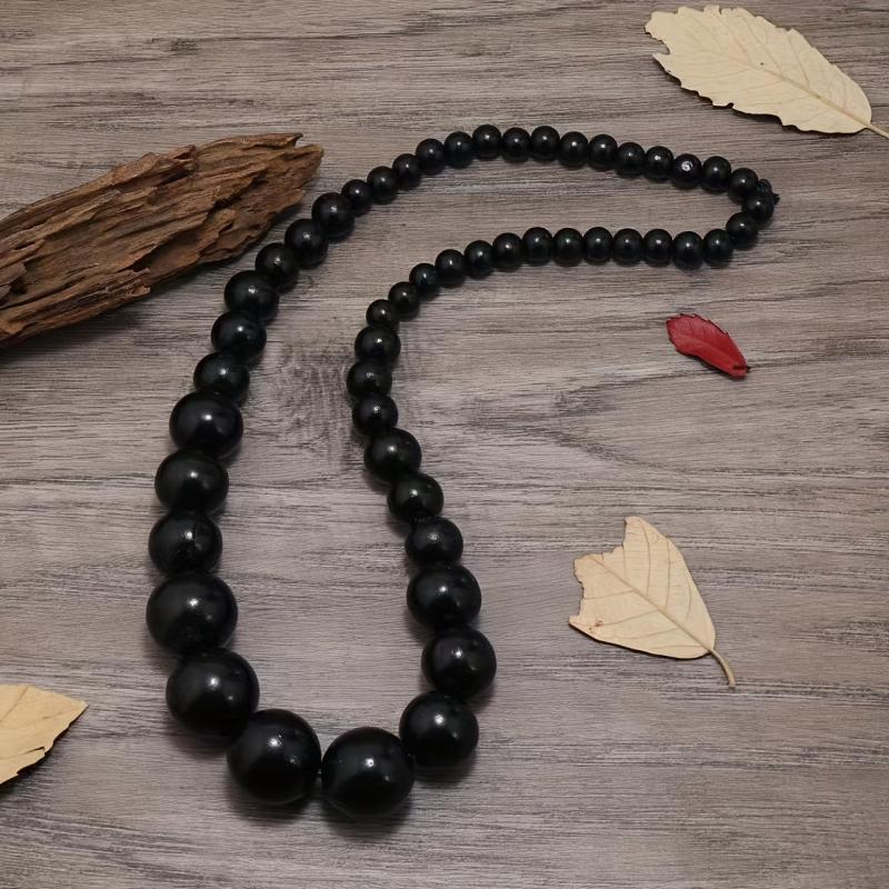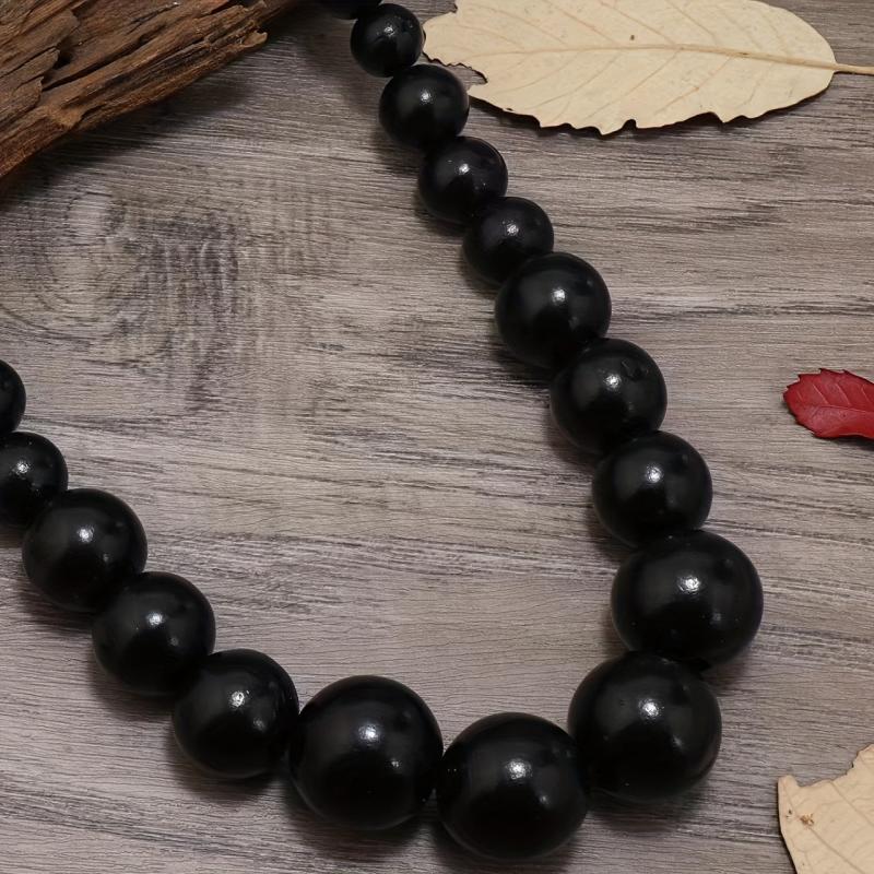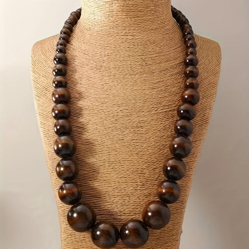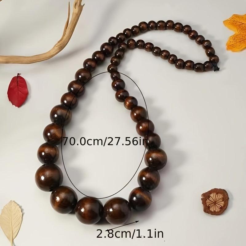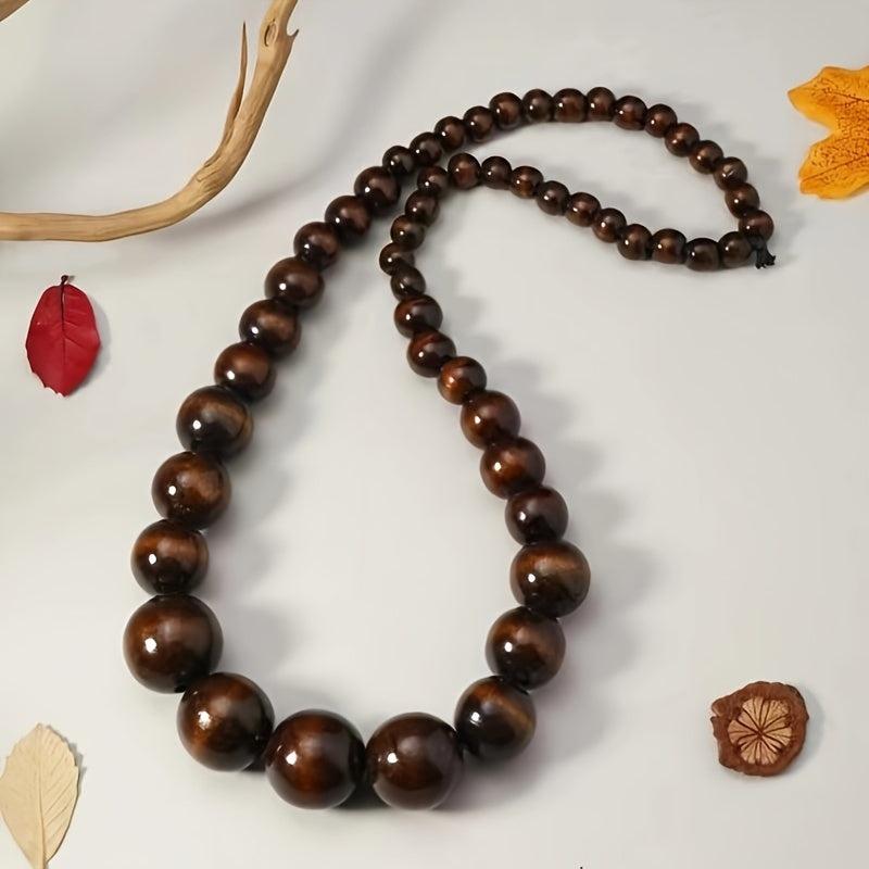 This bohemian vintage wooden bead necklace features natural wood statement beads and is ideal for daily and vacation wear. The versatile design adds a touch of boho chic to any outfit.