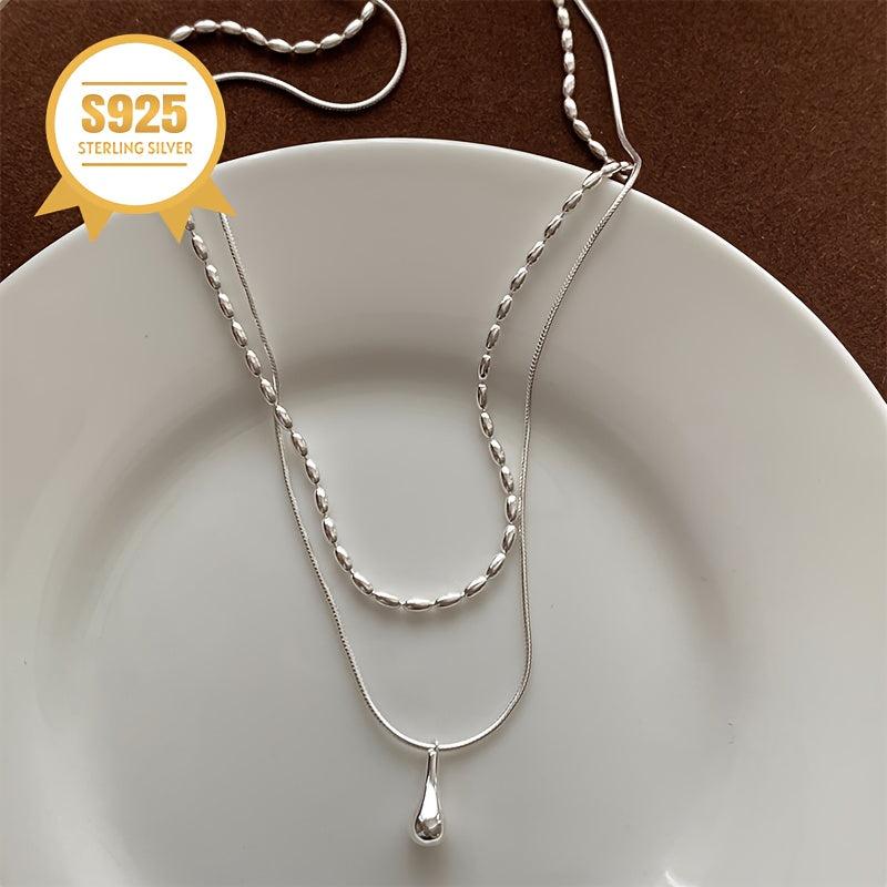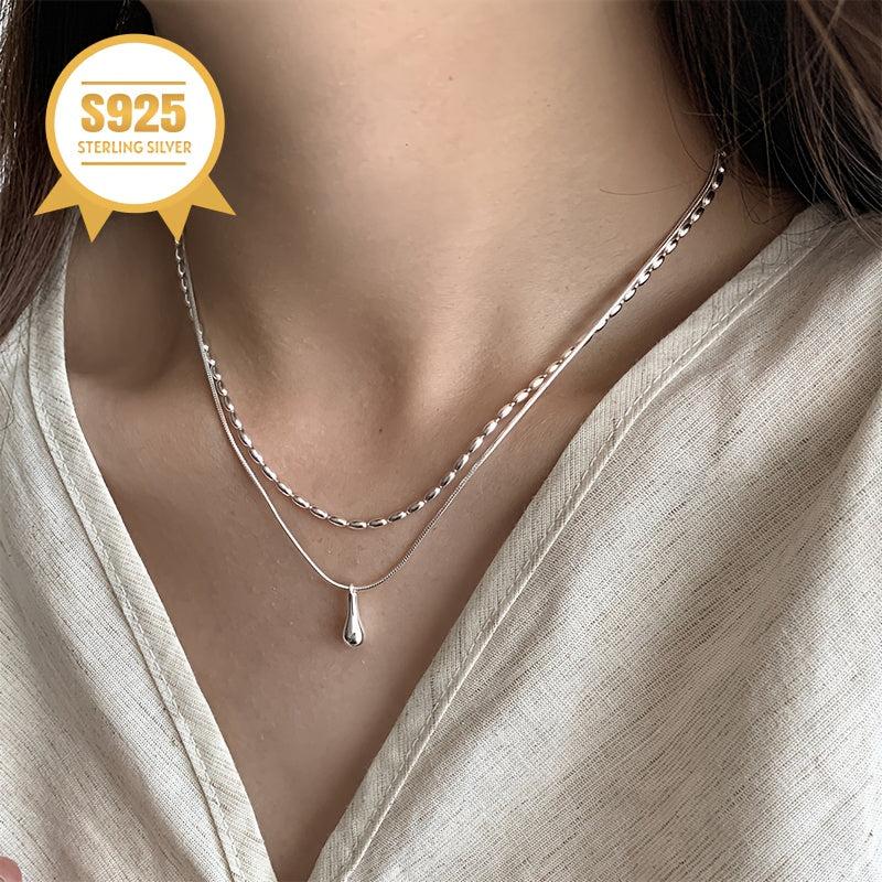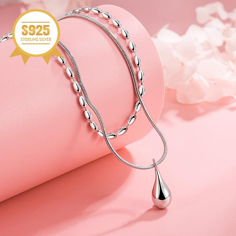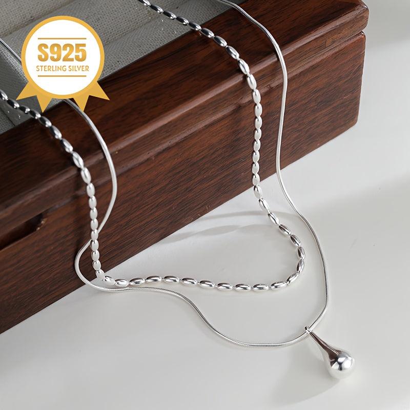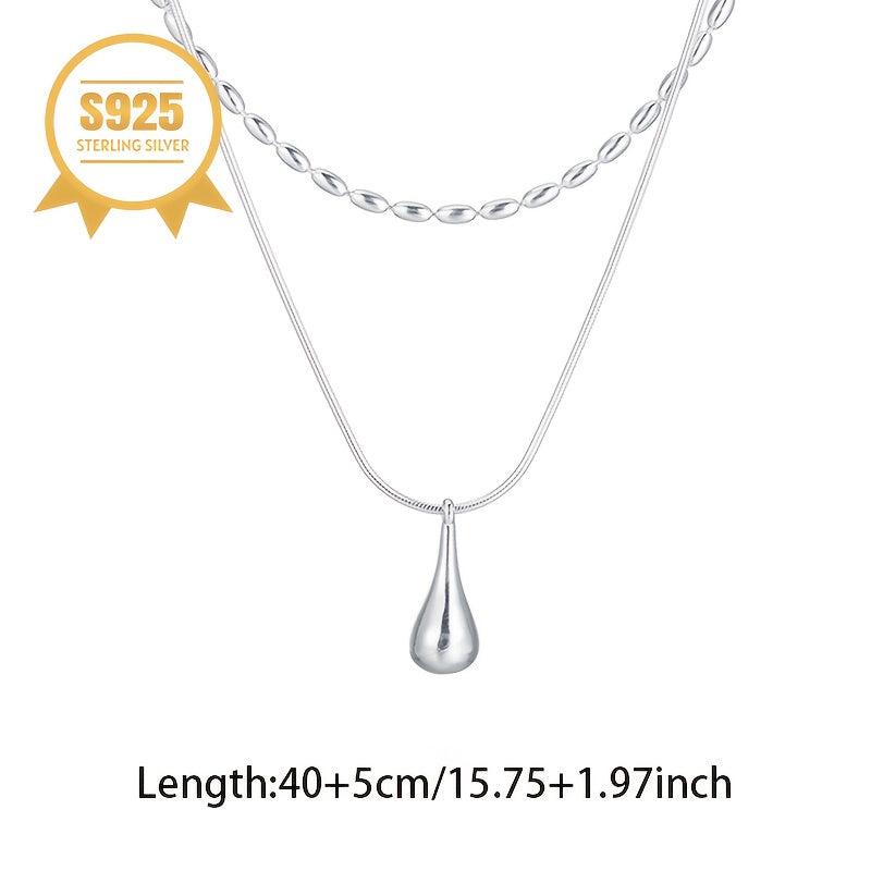 This necklace features a double layer design with a water droplet pendant. It is made of high-quality materials suitable for individuals with low allergies. The chain is delicately crafted with rice grain snake bone detailing, creating a high-end and minimalist look. This versatile piece can be worn for various occasions, adding a touch of elegance to any outfit.