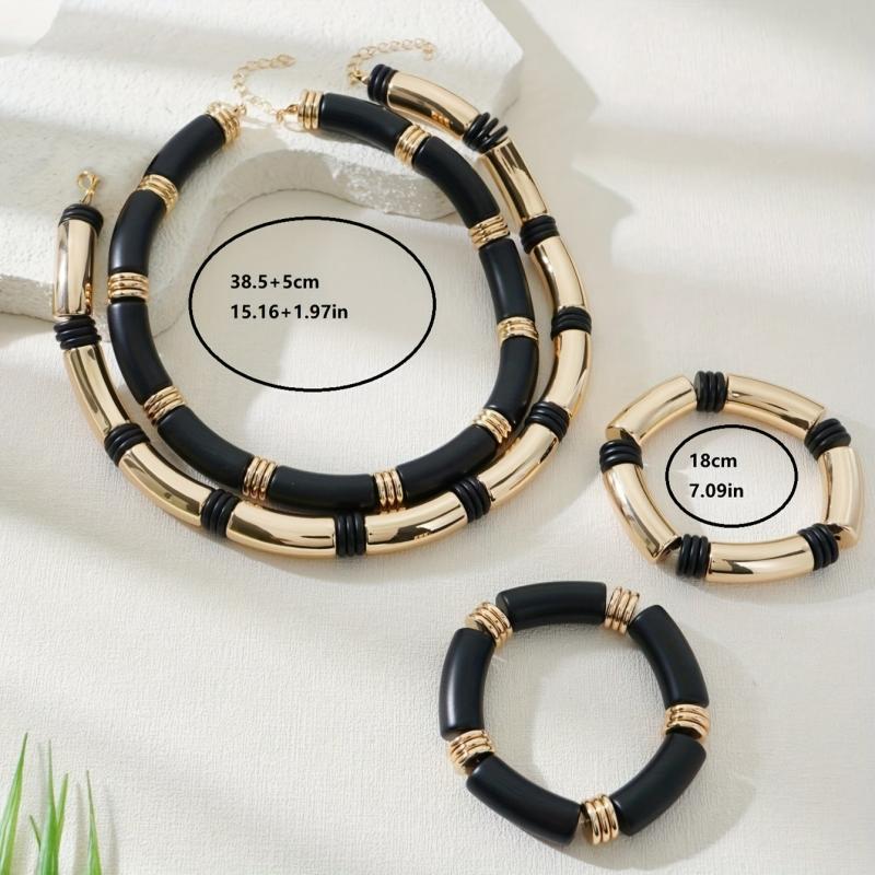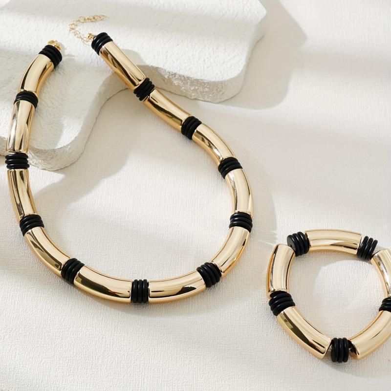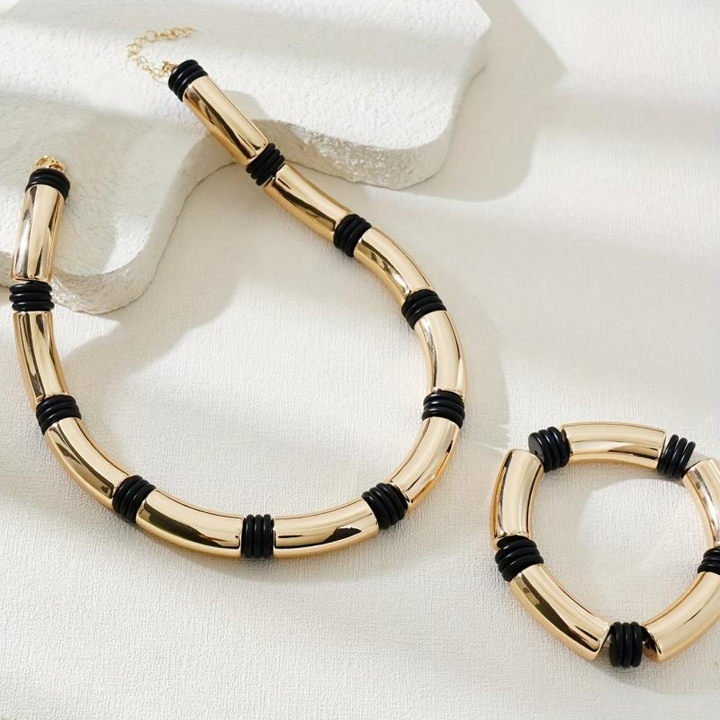 Complete your look with this stylish jewelry set featuring curved cylinder with flat round bead necklace and bracelet. The golden dual-tone accessories add a touch of retro hip-hop style.