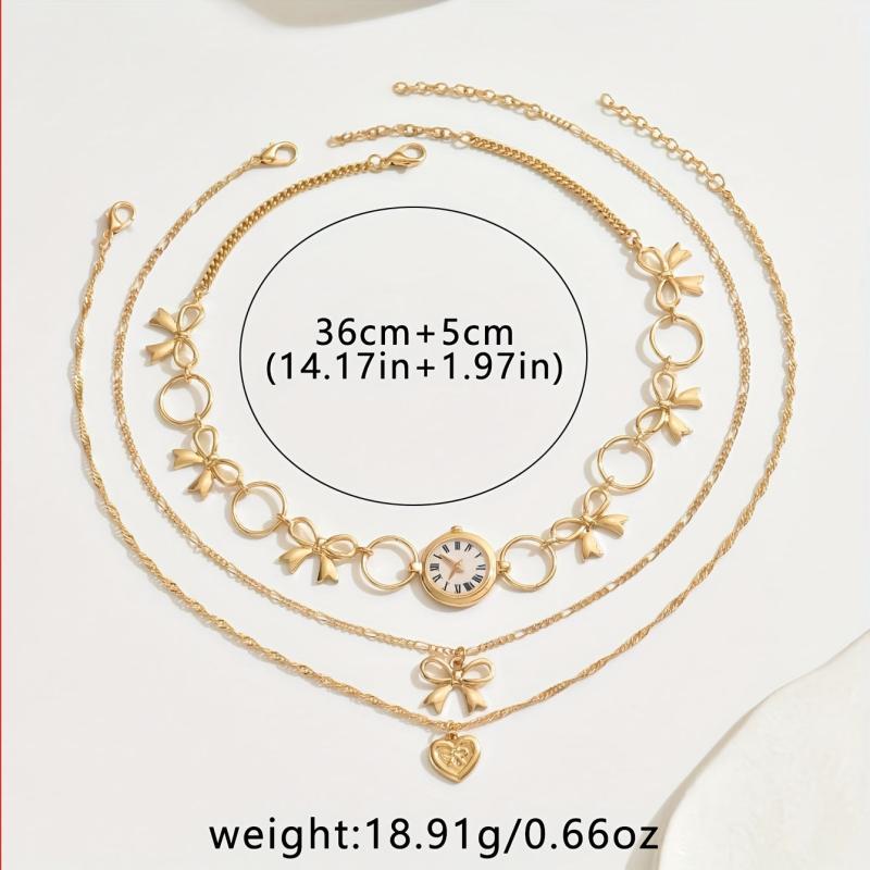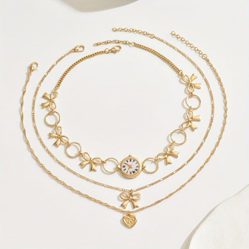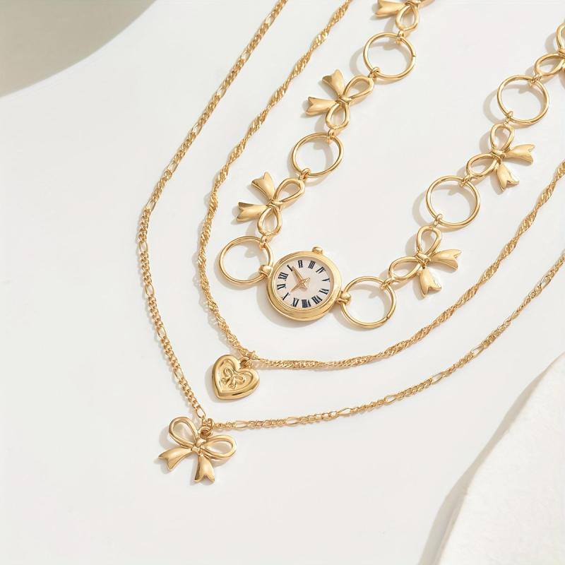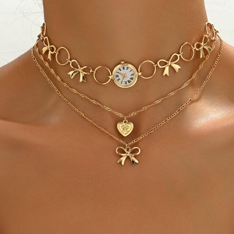 Women's Layer Golden Tone Necklace with Heart Bow & Vintage Clock Pendant