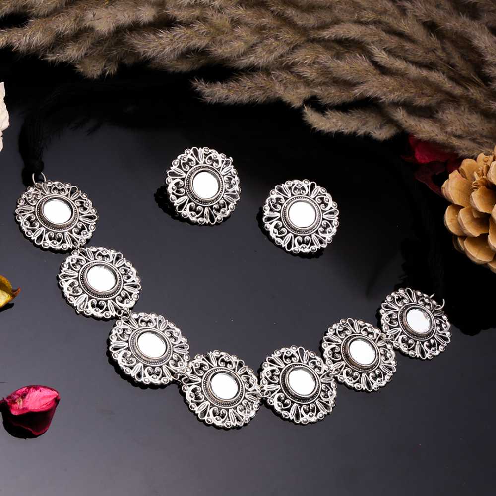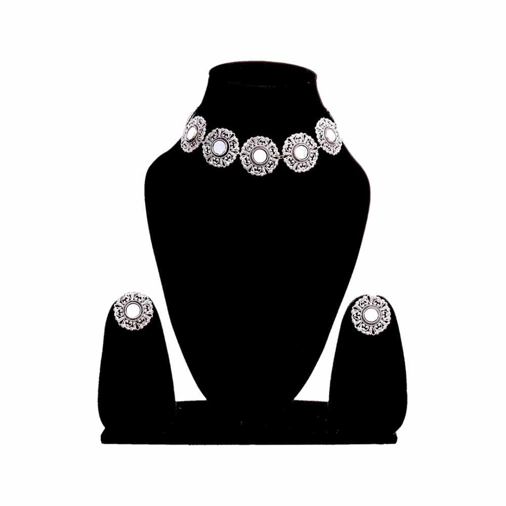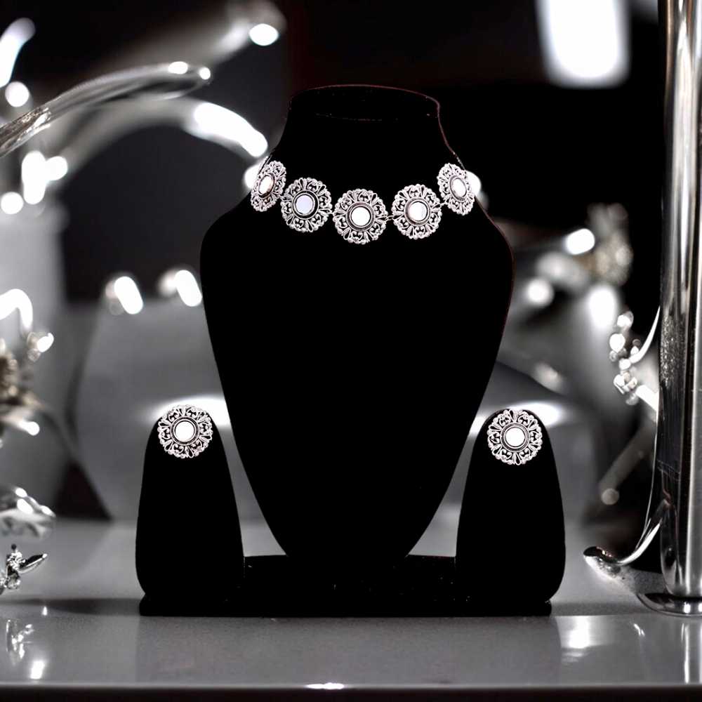 • Product Particulars: Crafted from high quality silver plated oxidised metal, each flower embossed with round mirror. The yoke part of the choker comes with a rope and slide over clasp. The earring secured with push back closures.