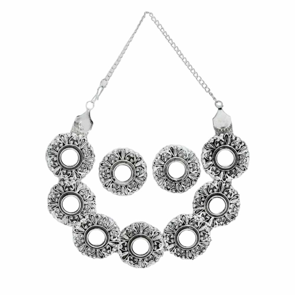Women's Silver Plated Oxidised Floral Motif Mirror Engraved Jewellery Set