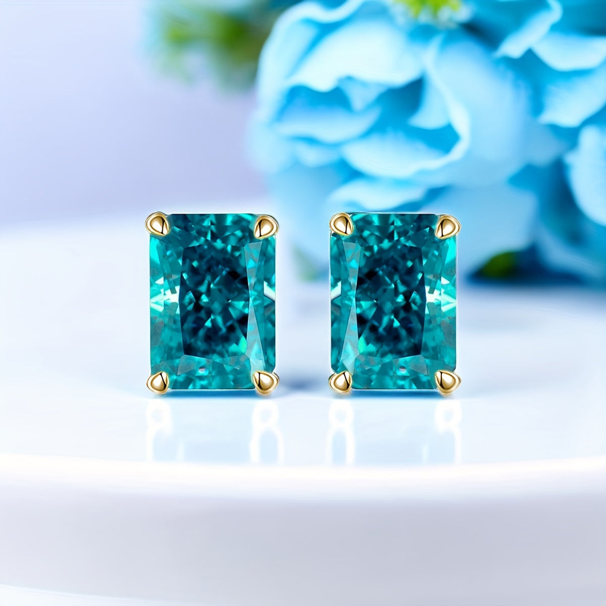 These stunning stud earrings feature 7 carat synthetic cubic zirconia with a bluish ink color. They are crafted in S925 sterling silver and golden fine metals, setting off the 5A good ice cut perfectly.