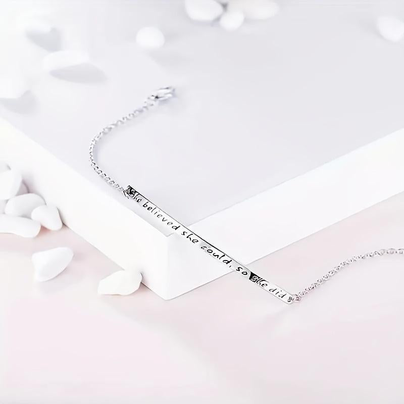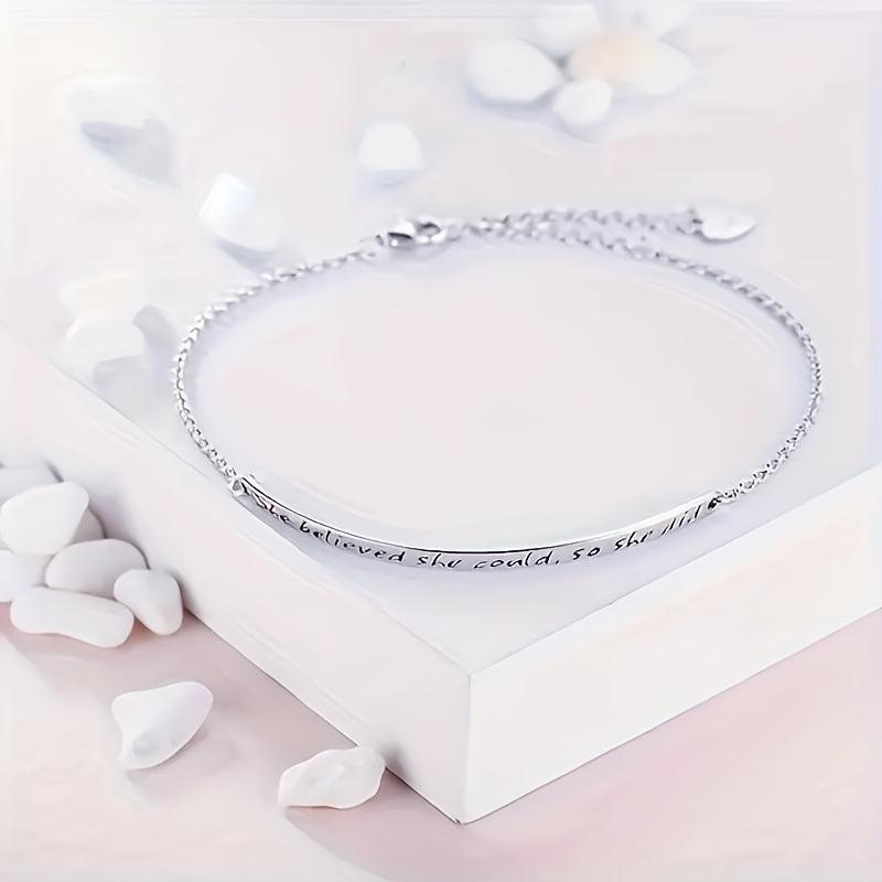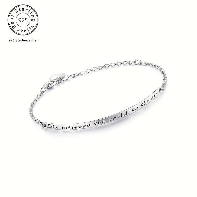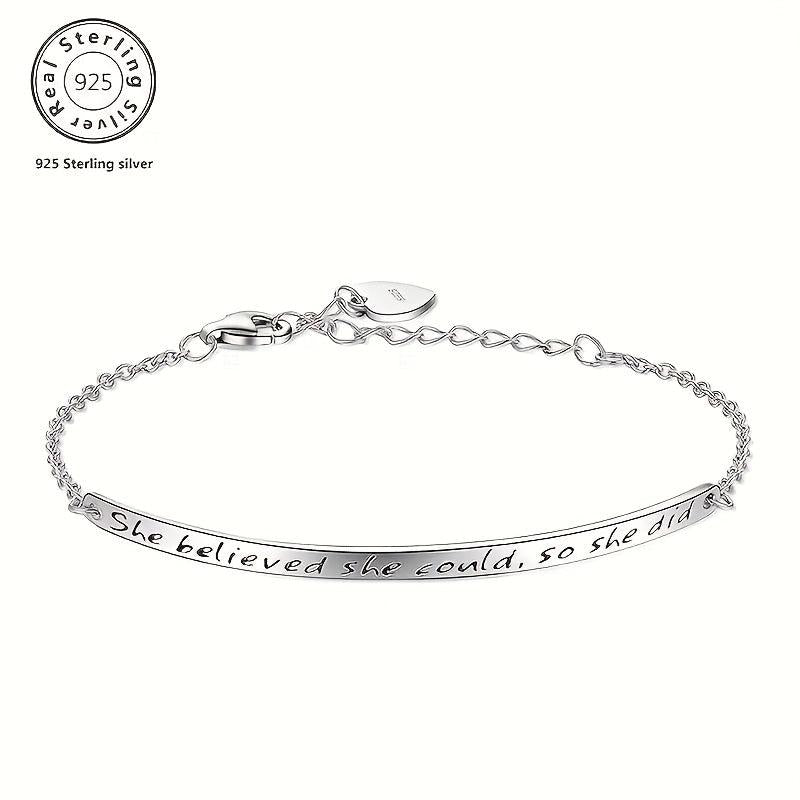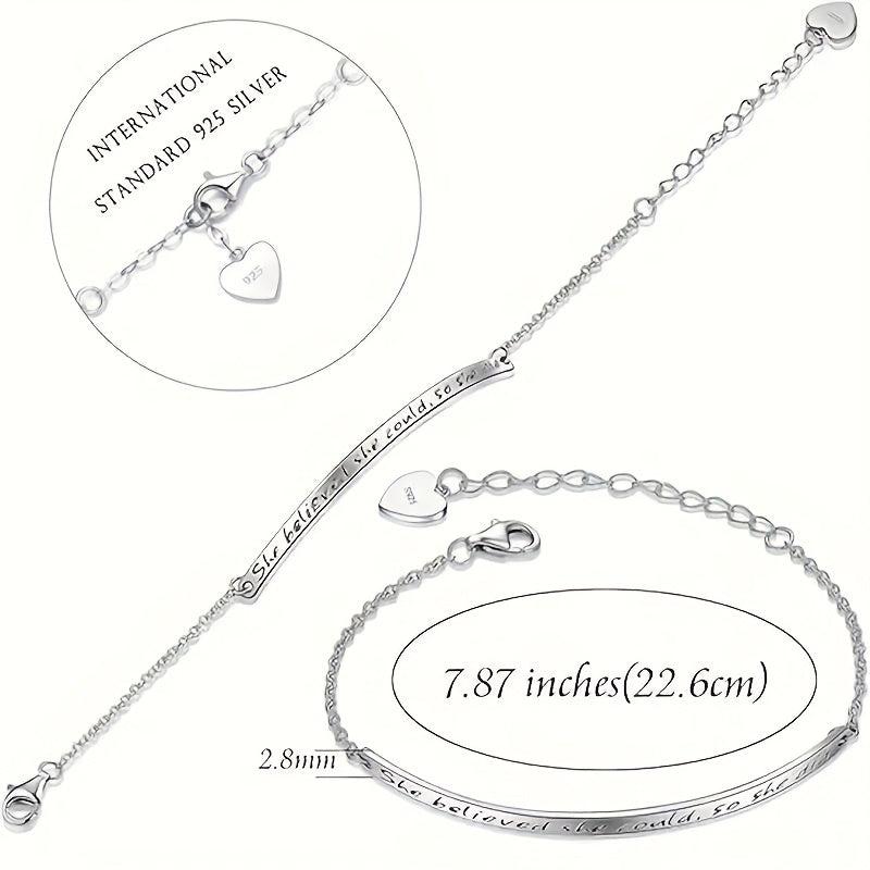 This 925 sterling silver engraved bracelet features an inspirational quote 'She Believed She Could So She Did'. It is perfect for daily wear and gift occasions like Valentine's Day.