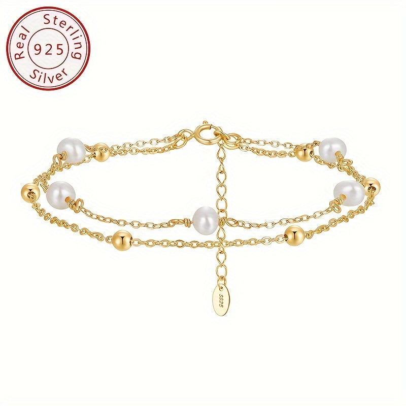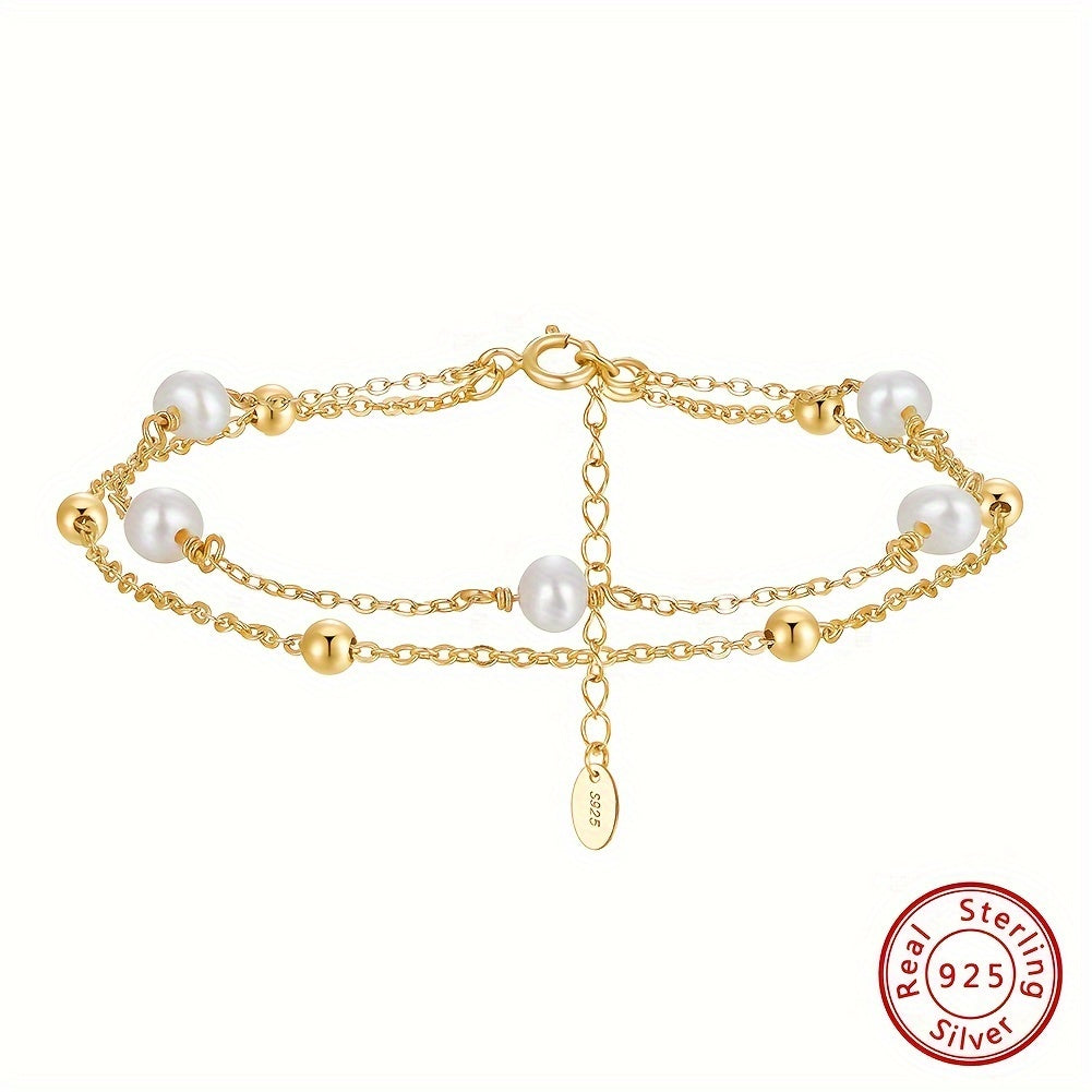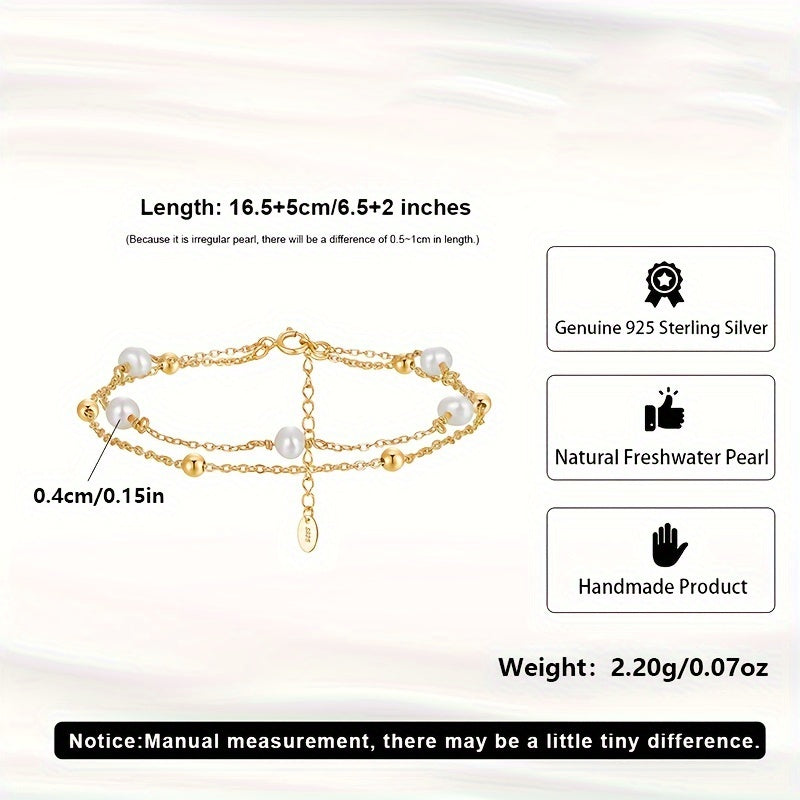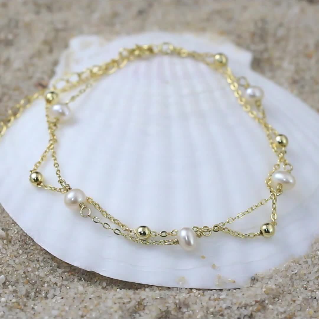 Elegant double layered bracelet featuring natural freshwater pearls and a 14K golden plated two-strand chain. Perfect for daily wear or special occasions.