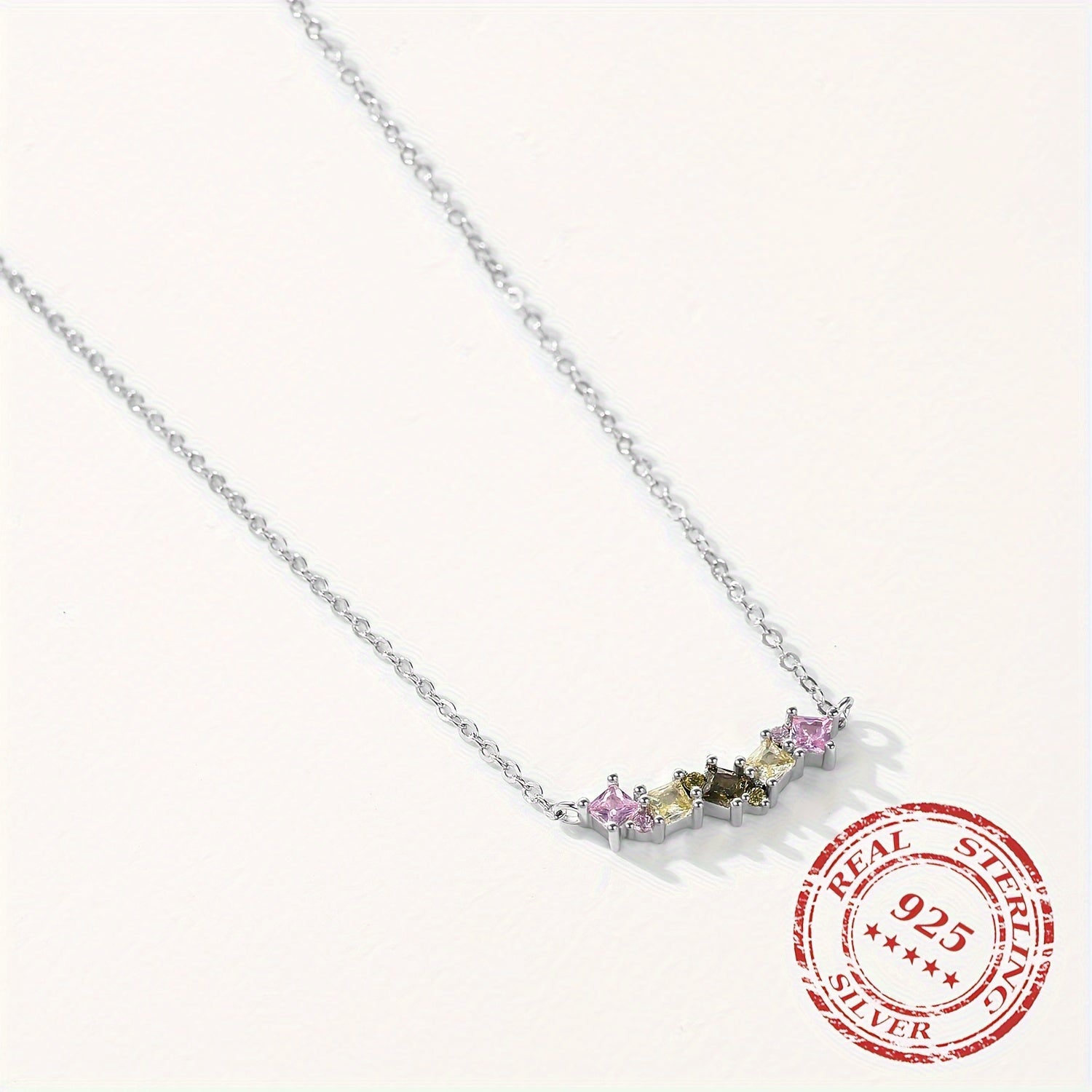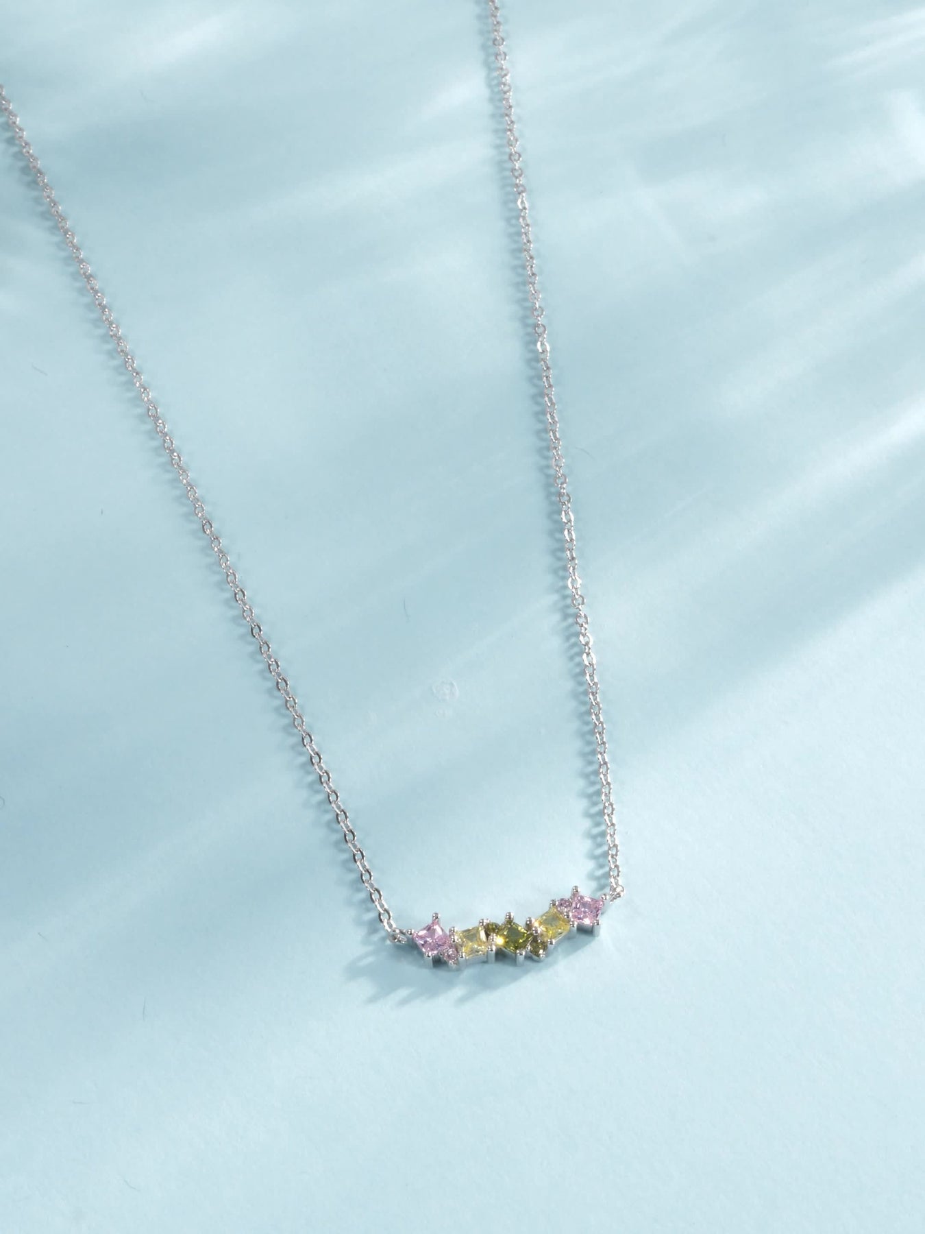 This stunning 925 sterling silver necklace features a vibrant rainbow candy square zirconia pendant on a delicate link chain. Perfect for parties, festivals, or everyday wear. The necklace is rhodium plated for a high-shine finish.