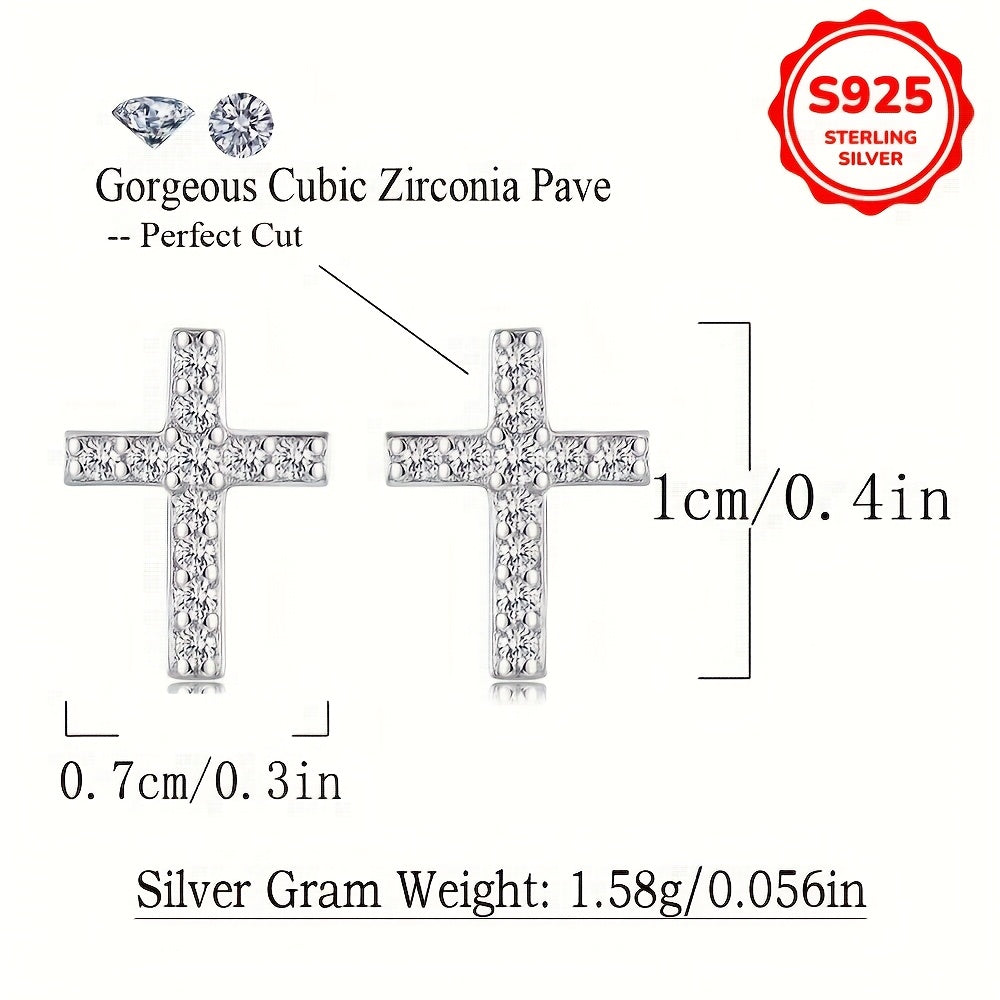 These minimalist stud earrings feature a sparkling cross shape with zirconia inlay. Made of 925 sterling silver, these hypoallergenic earrings are small and perfect for girls, men, and women.