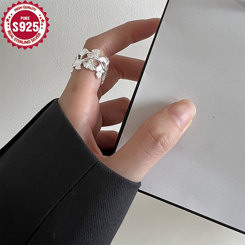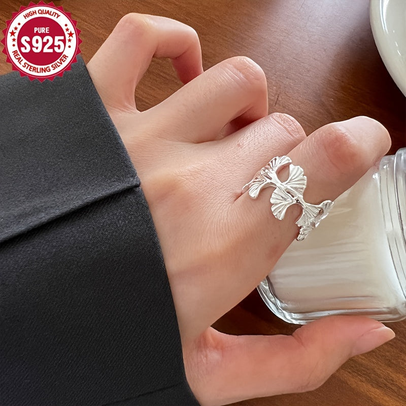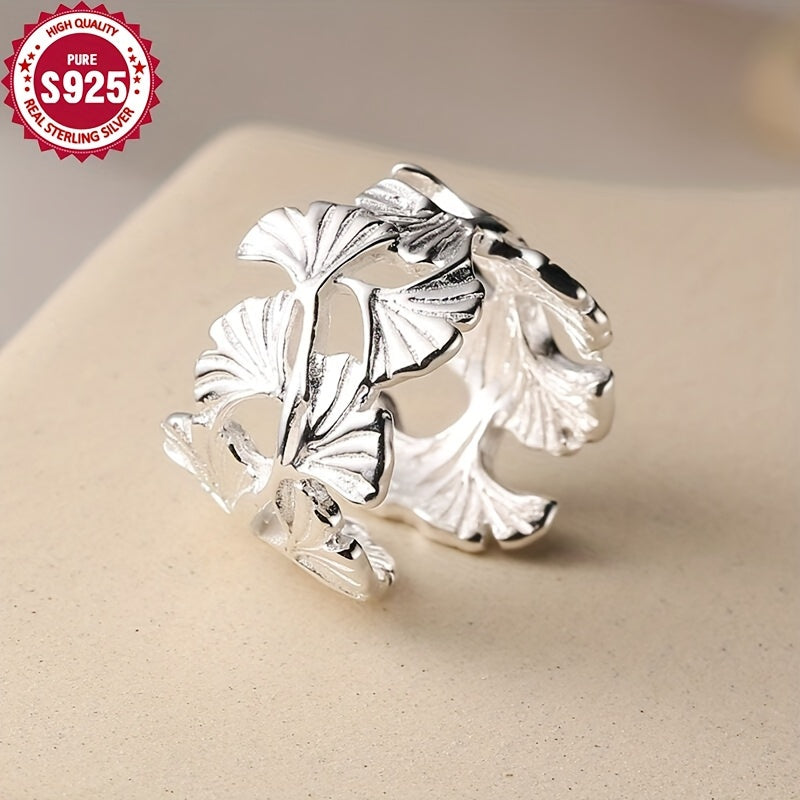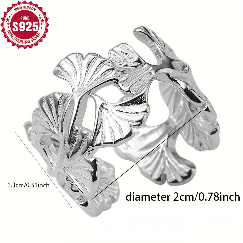 This pure silver ring features a wide ginkgo leaf design, perfect for all occasions and anniversaries.