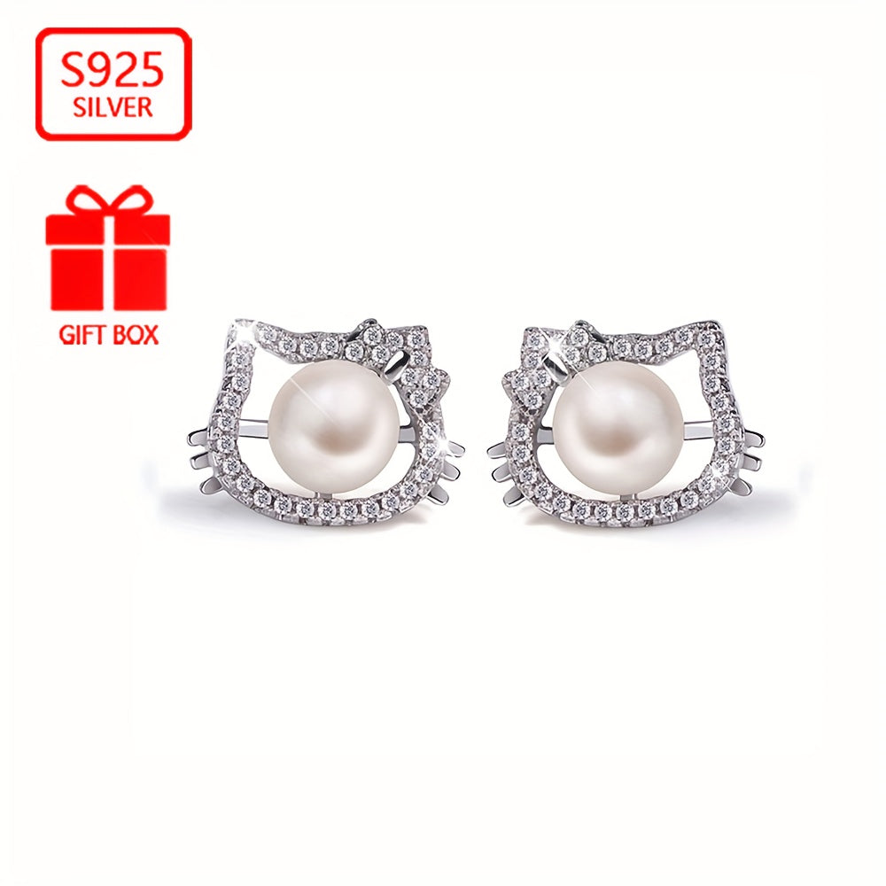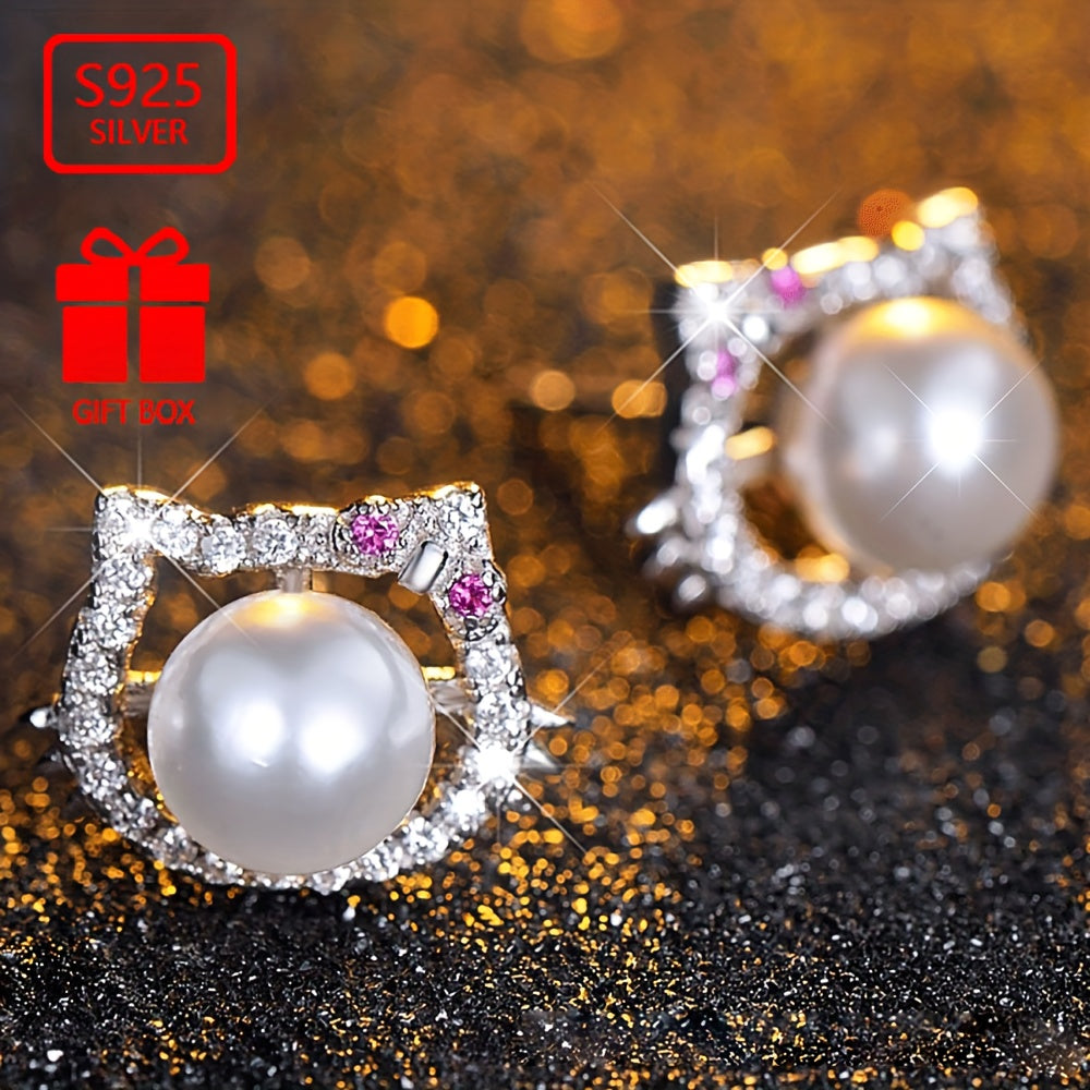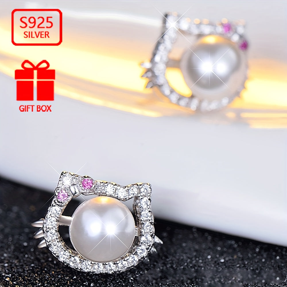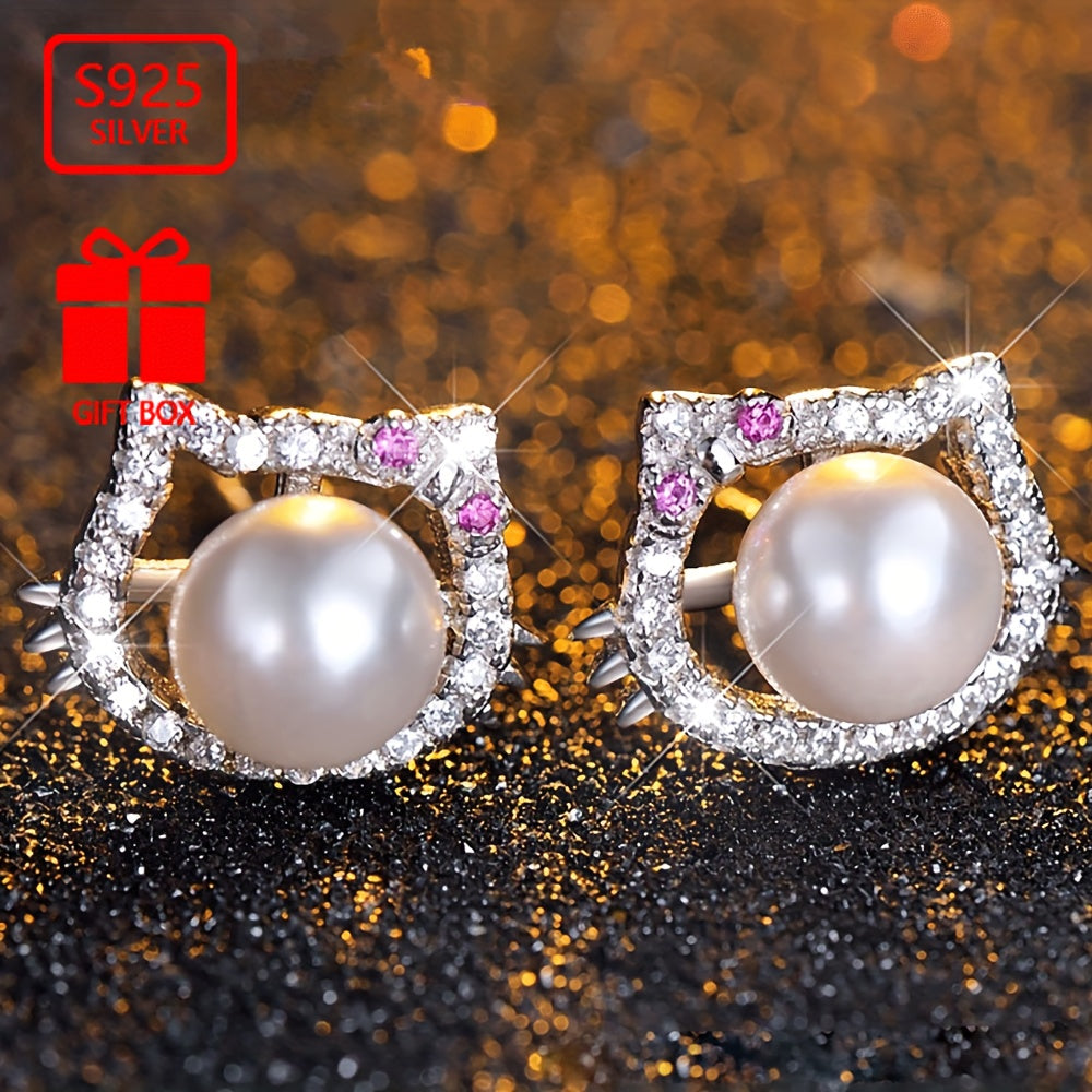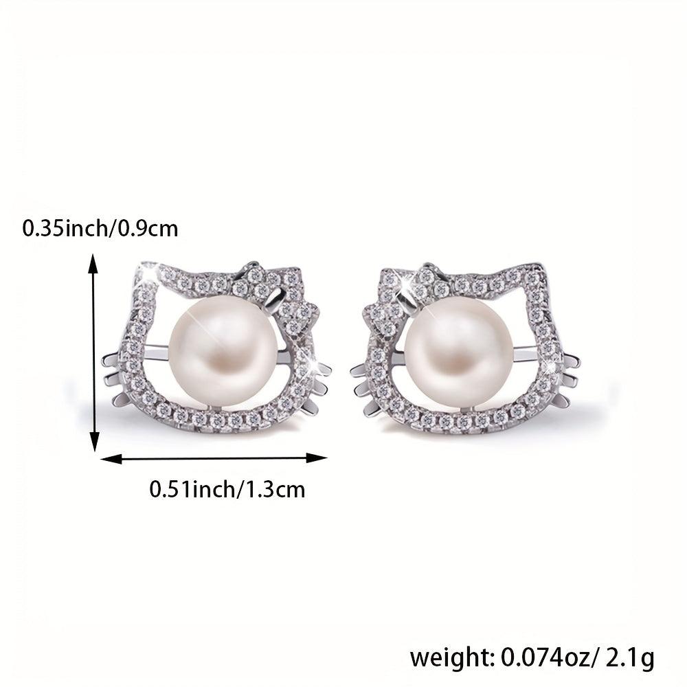 925 Sterling Silver Pearl Kitten Stud Earrings