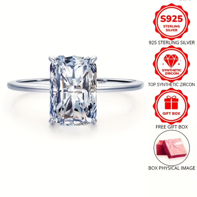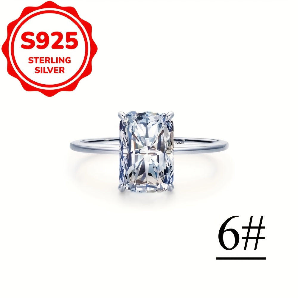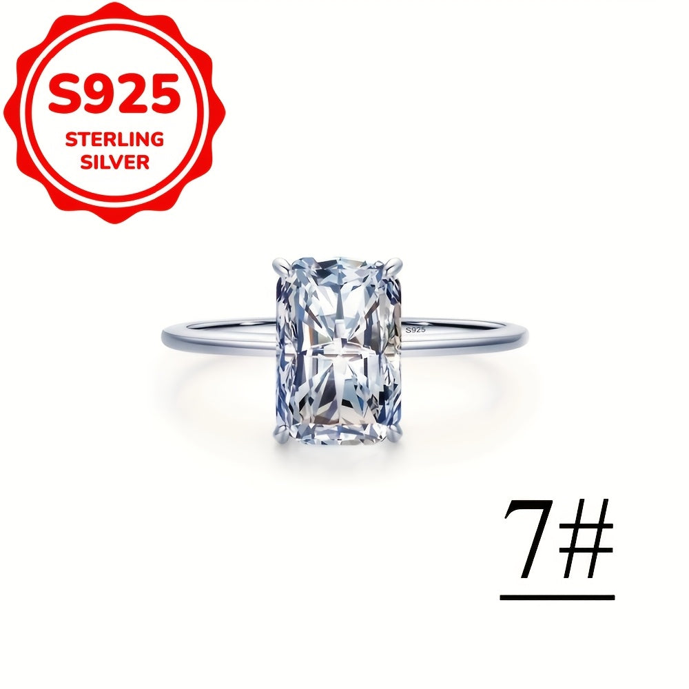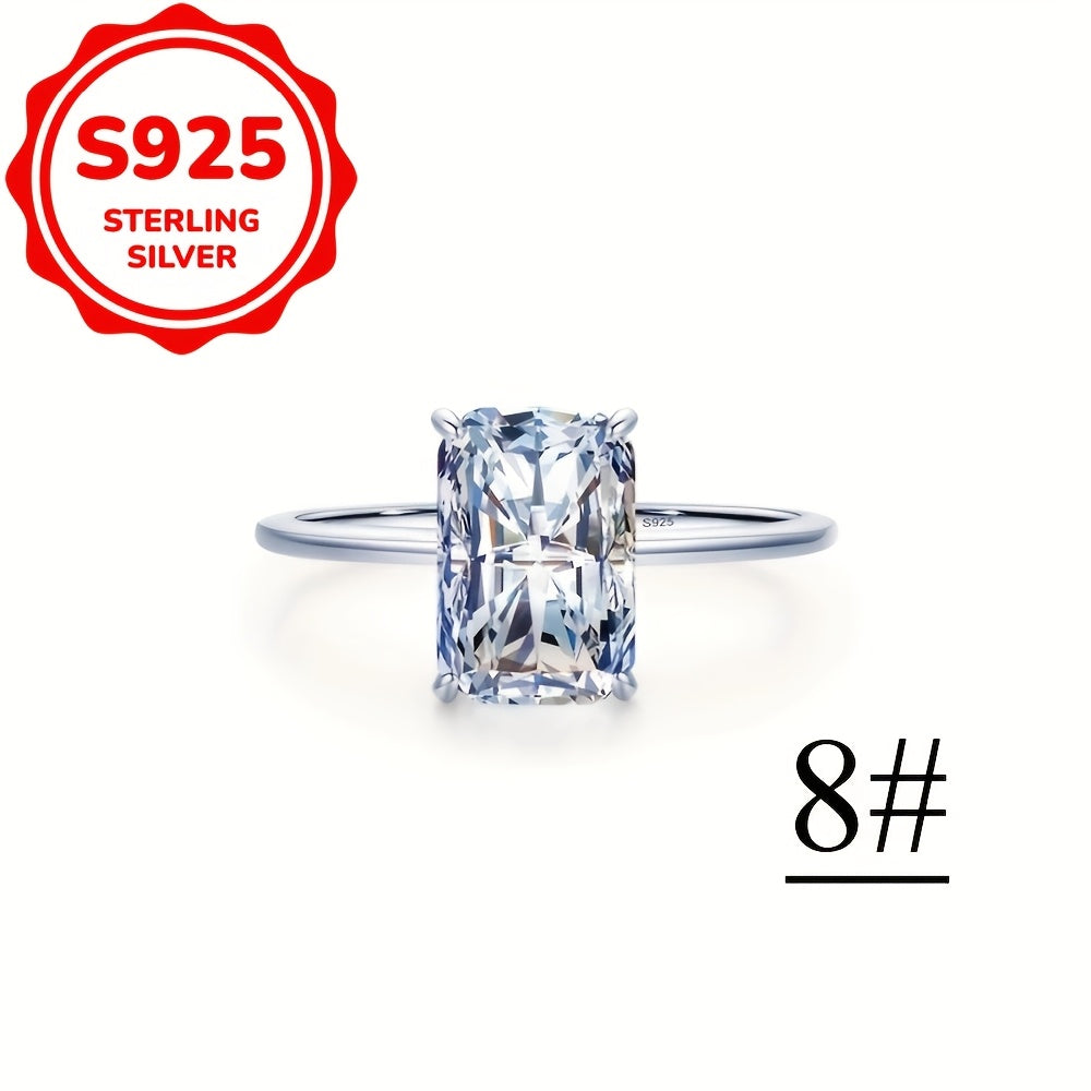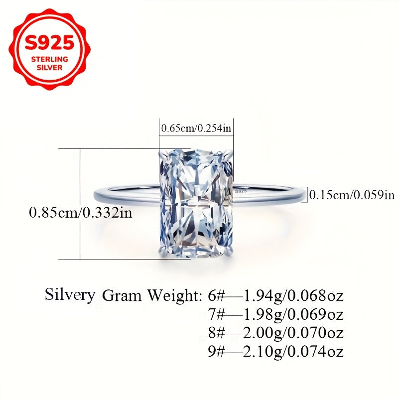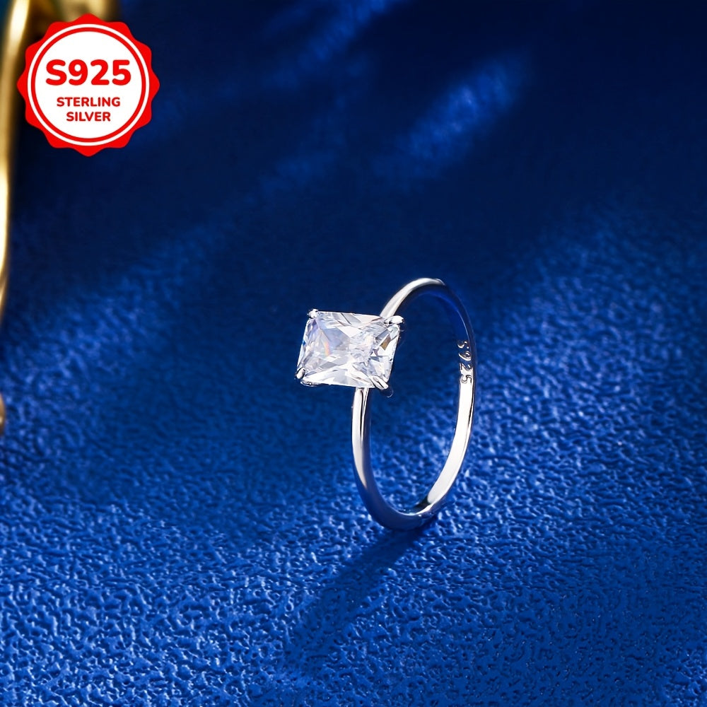 This minimalist women's ring features a single rectangular cut zirconia stone set in 925 sterling silver. The ring is hypoallergenic and perfect for engagement or promise.