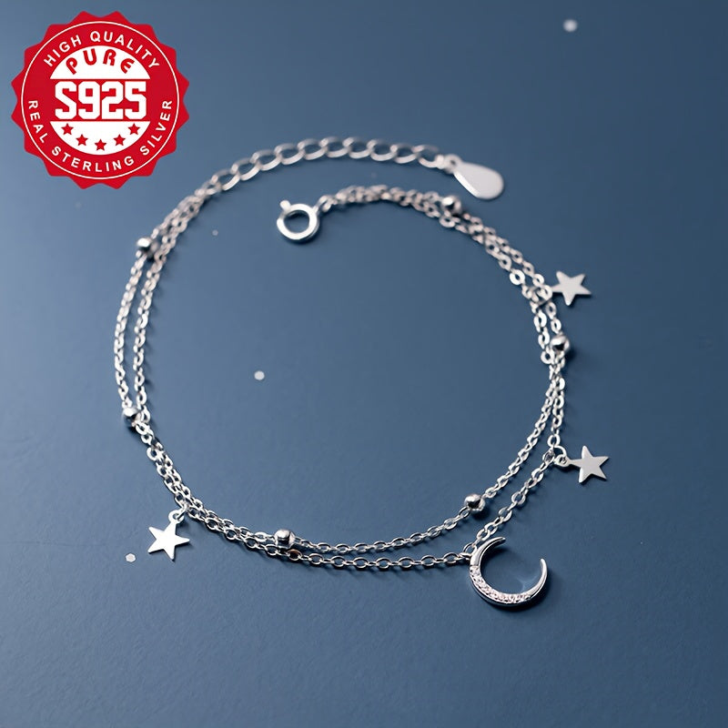 Elegant and stylish S925 silver bracelet featuring a star and moon design, perfect for daily wear. Ideal gift for friends and family. Embrace the starry night theme with this double layer bracelet.
