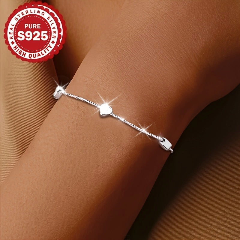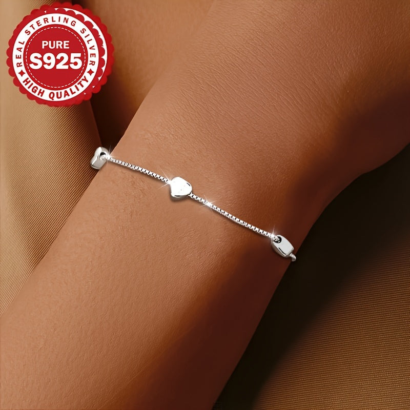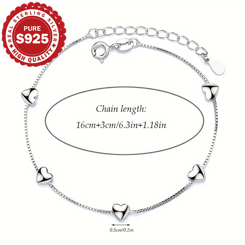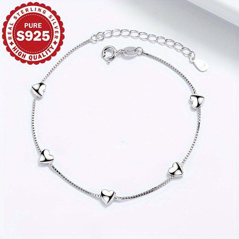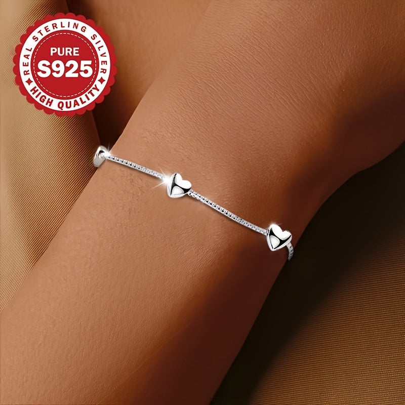 This elegant bracelet is made of S925 sterling silver with spaced hearts. It is suitable for everyday wear, lightweight, and hypoallergenic.