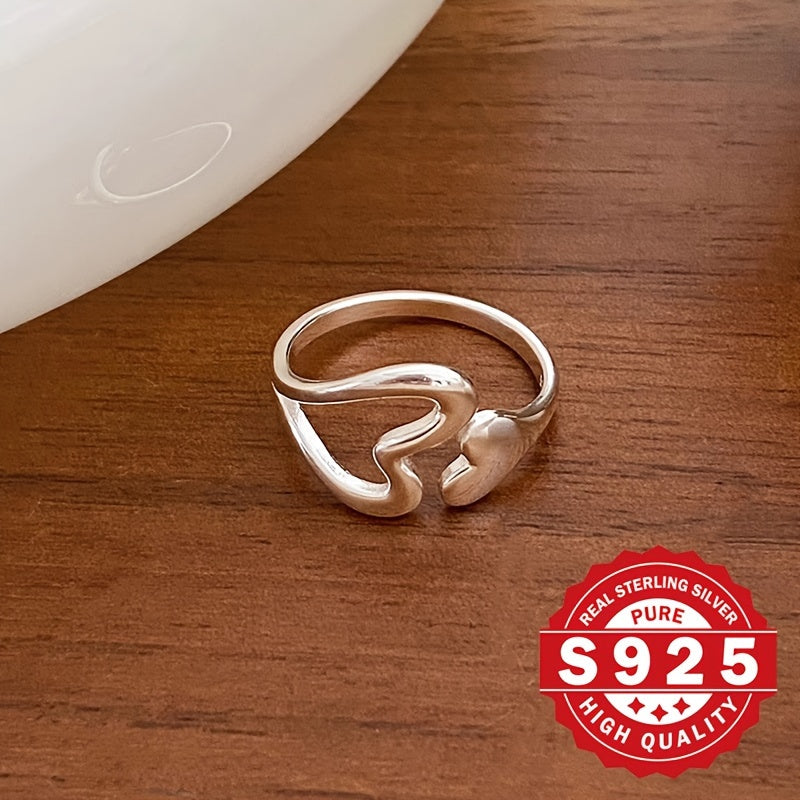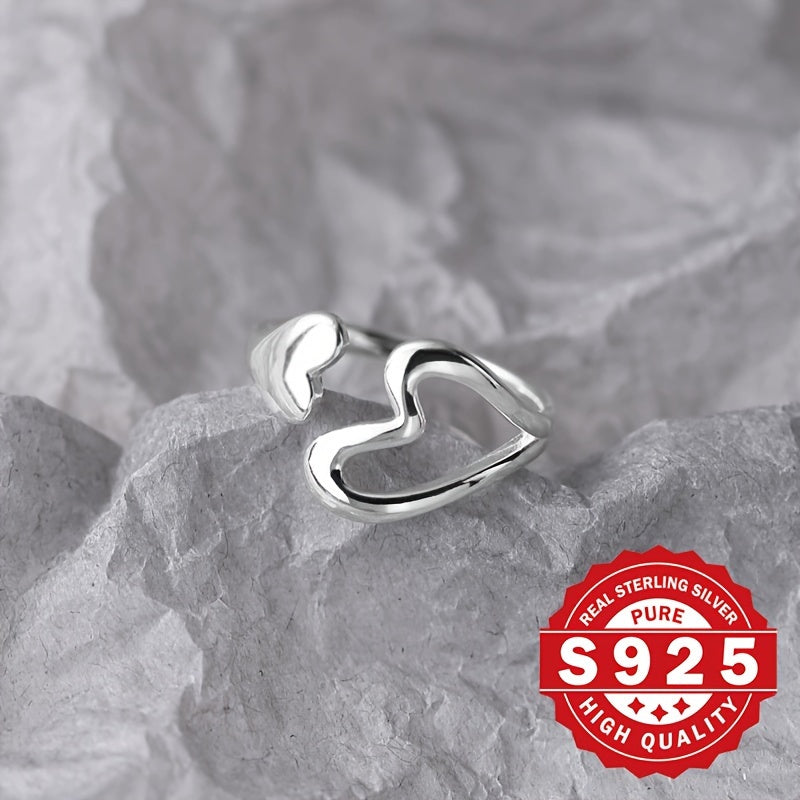 This stylish wide ring features a solid heart and a hollow heart design. Crafted from S925 sterling silver, it has a metallic feel and is adjustable for a perfect fit.