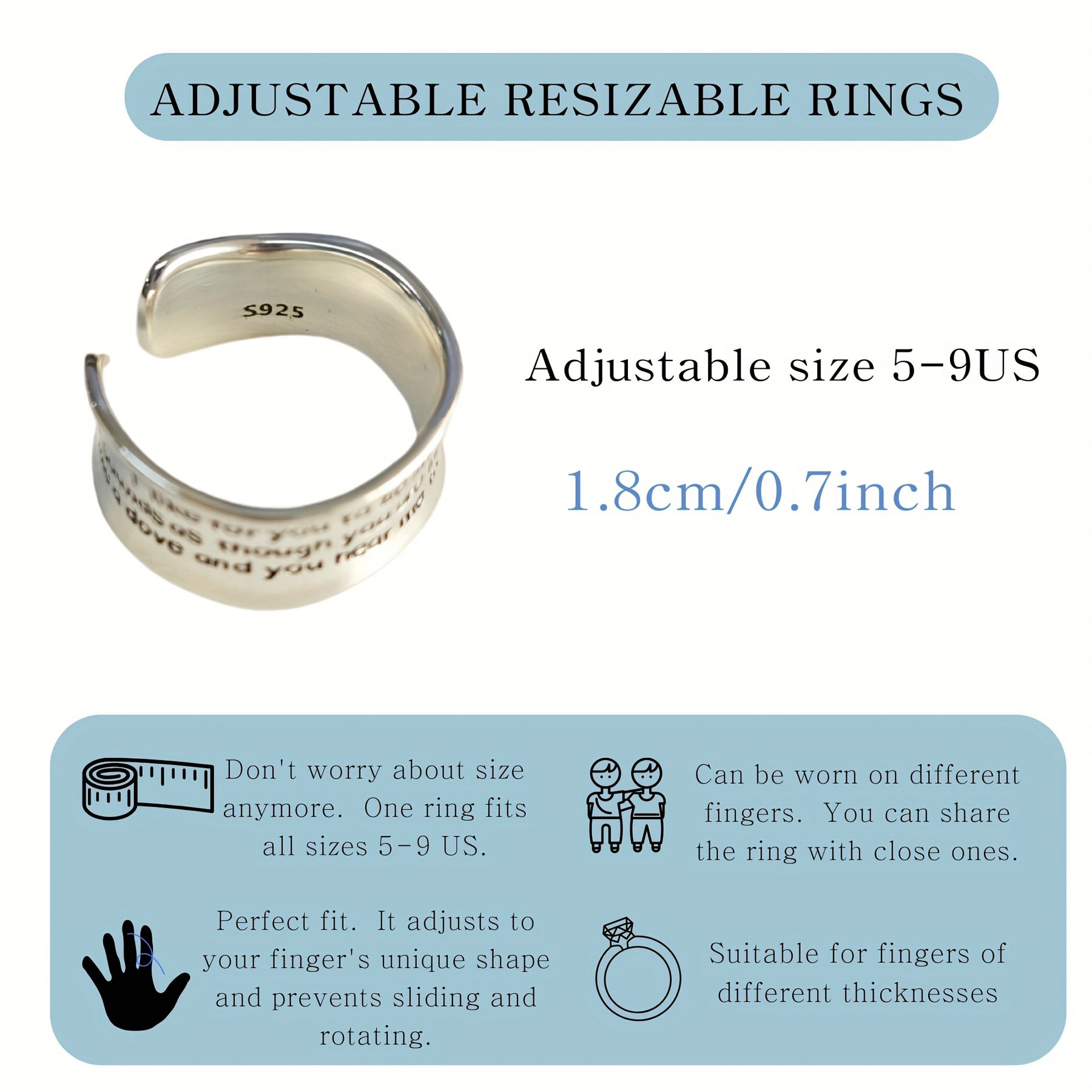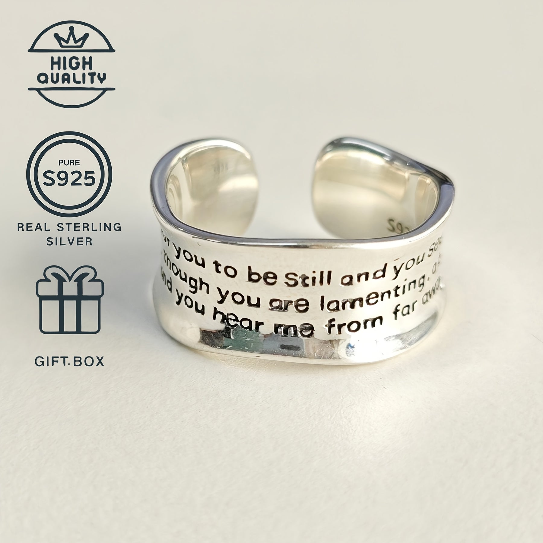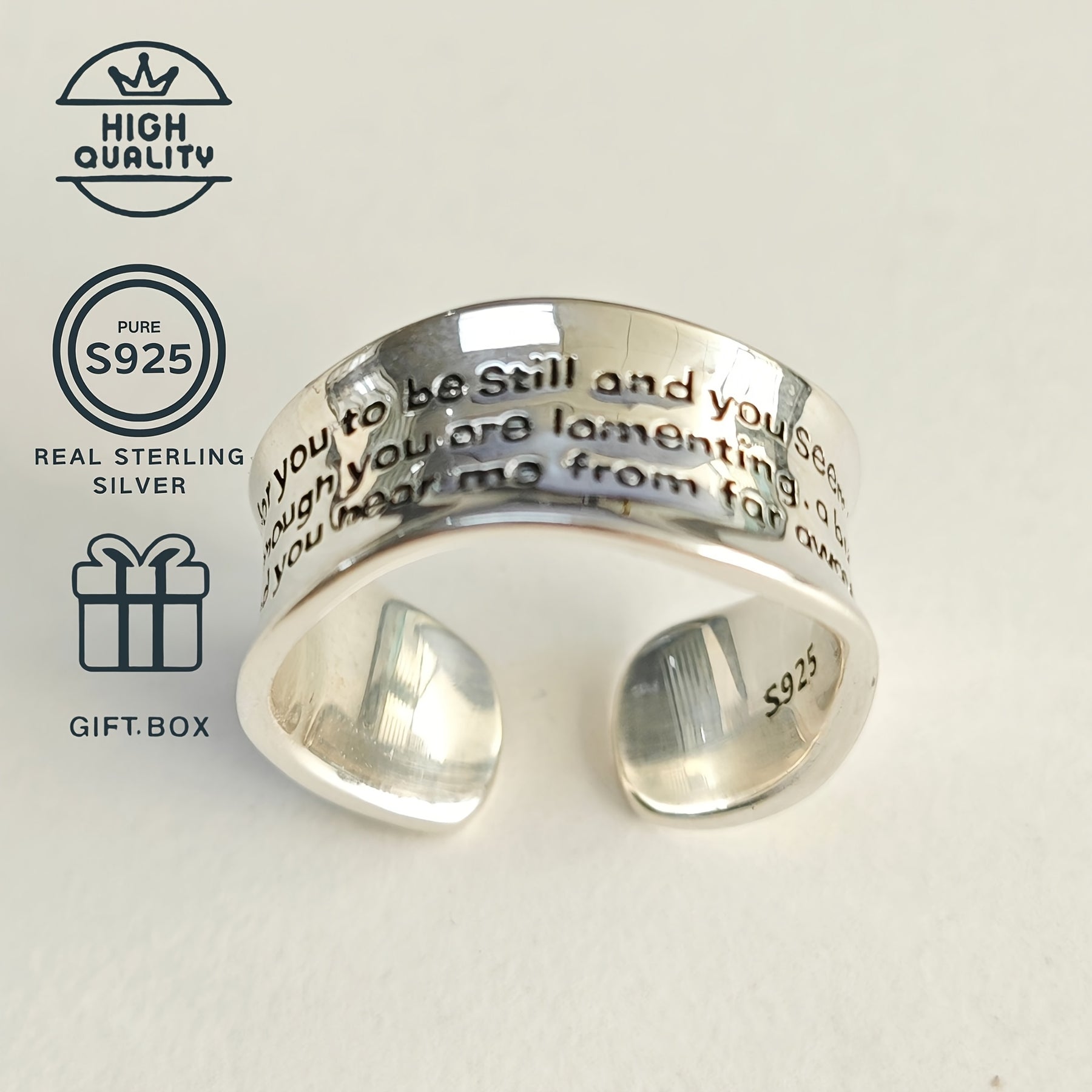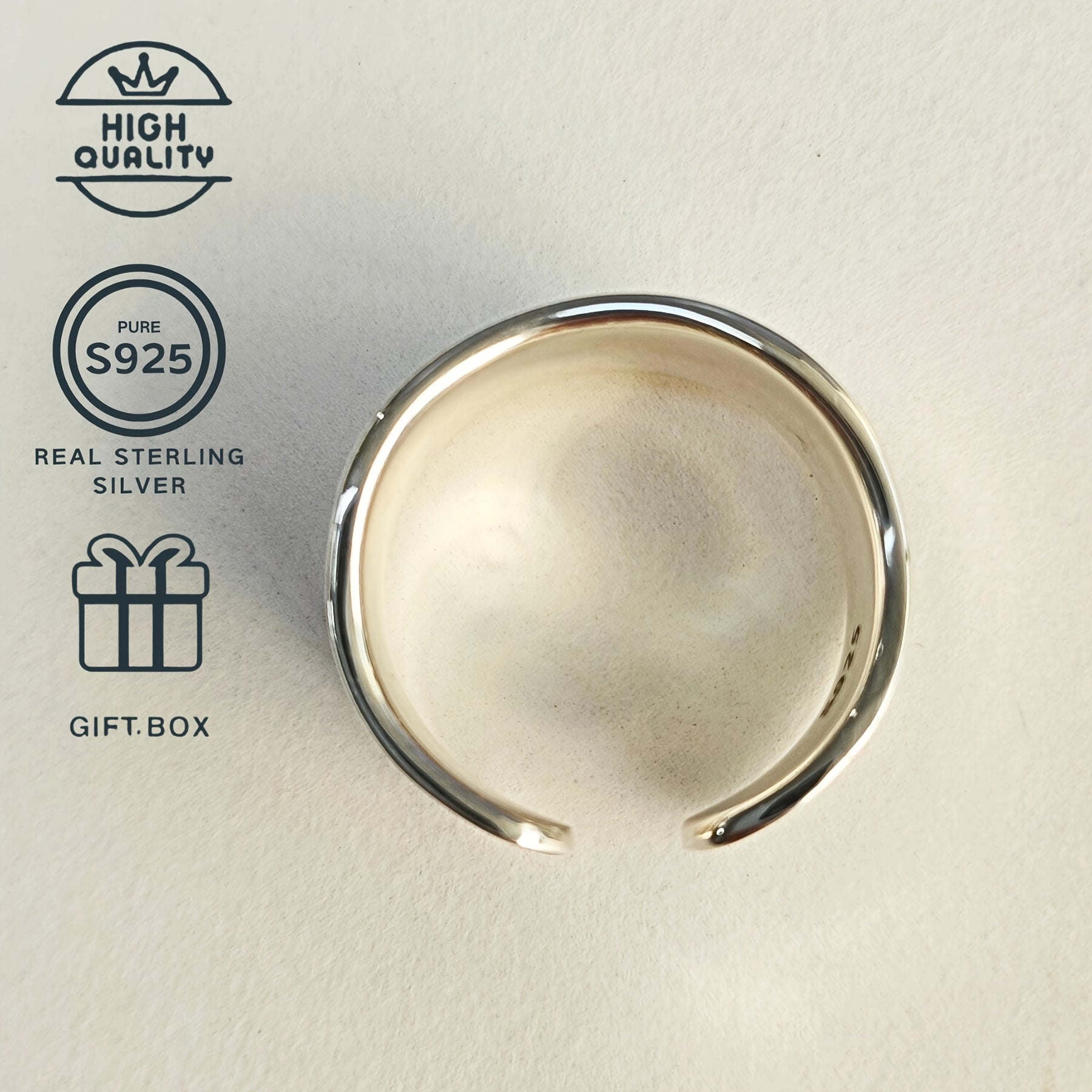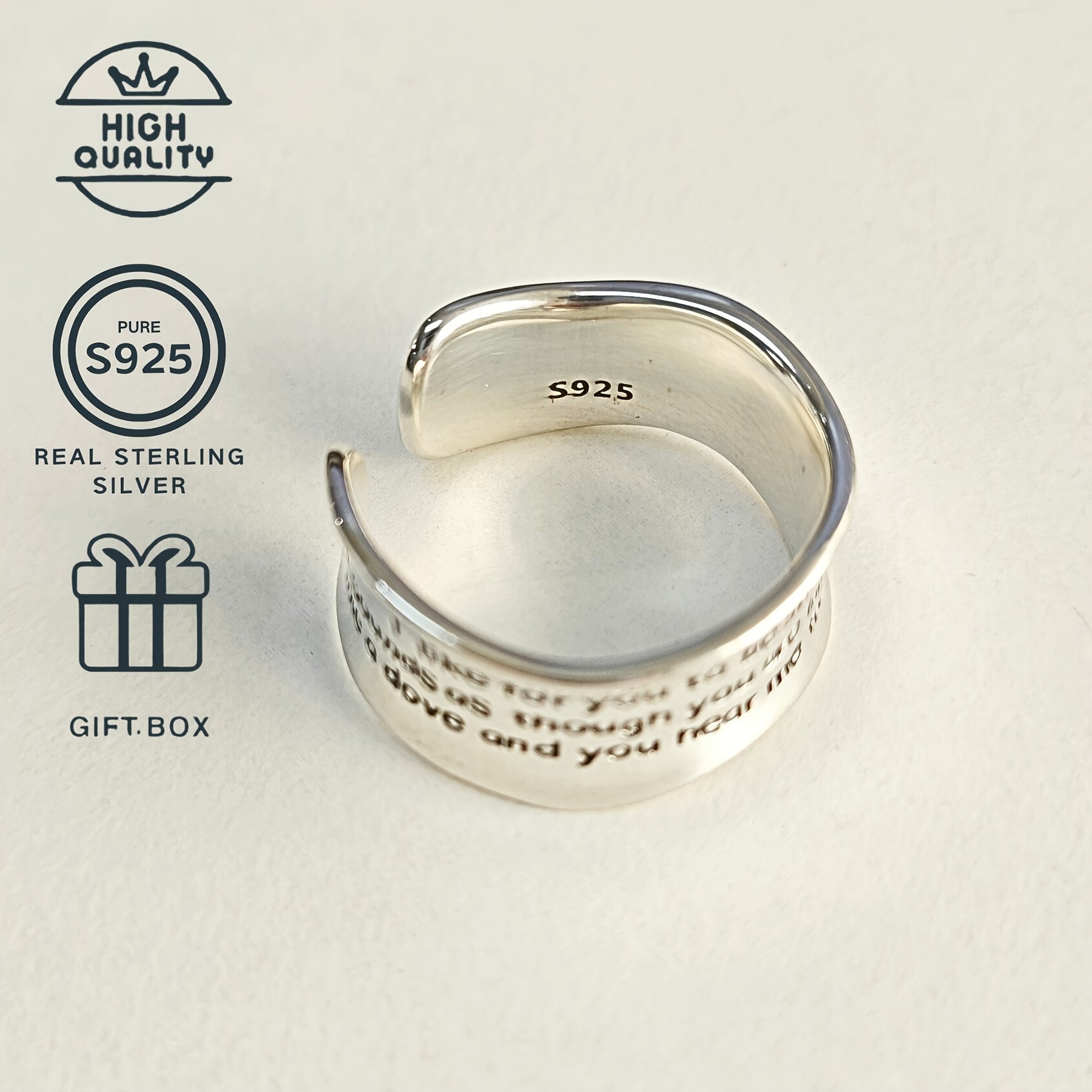 This ring is made of S925 sterling silver and features a wide design with letters. It is suitable for both men and women, adding a stylish touch to any outfit.