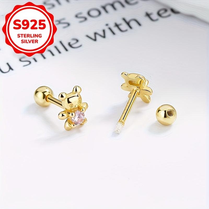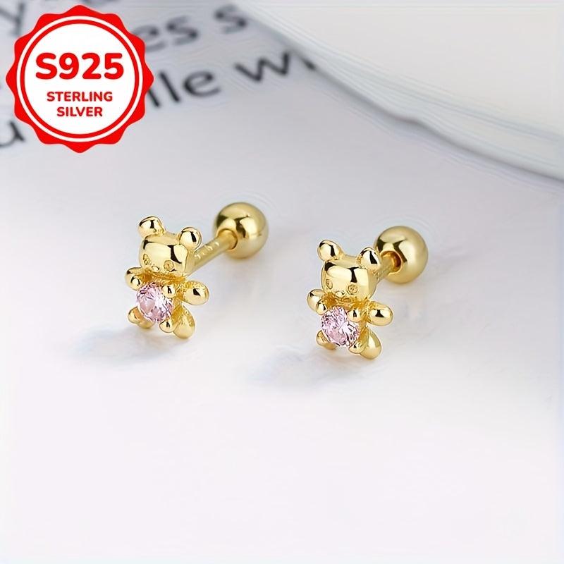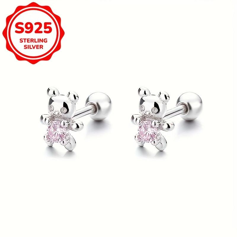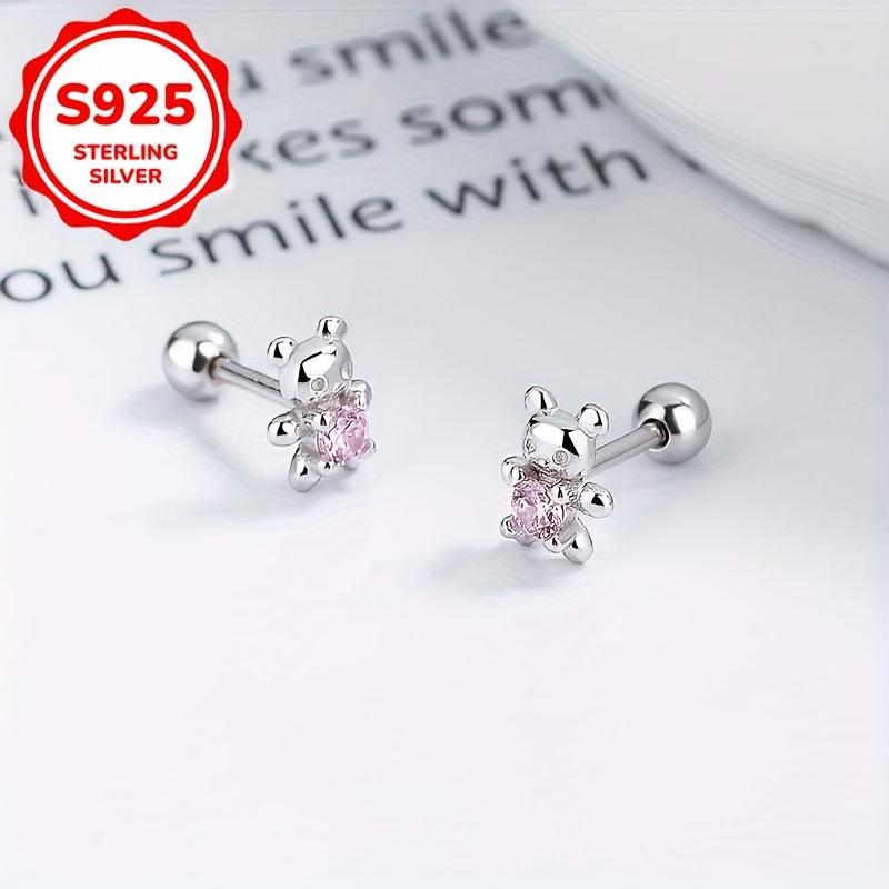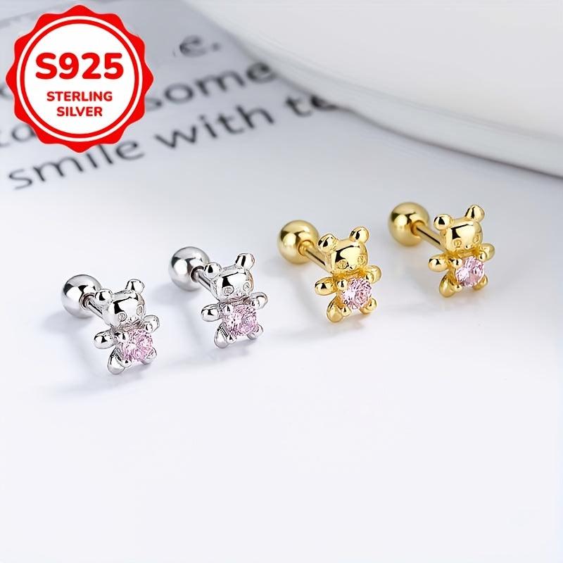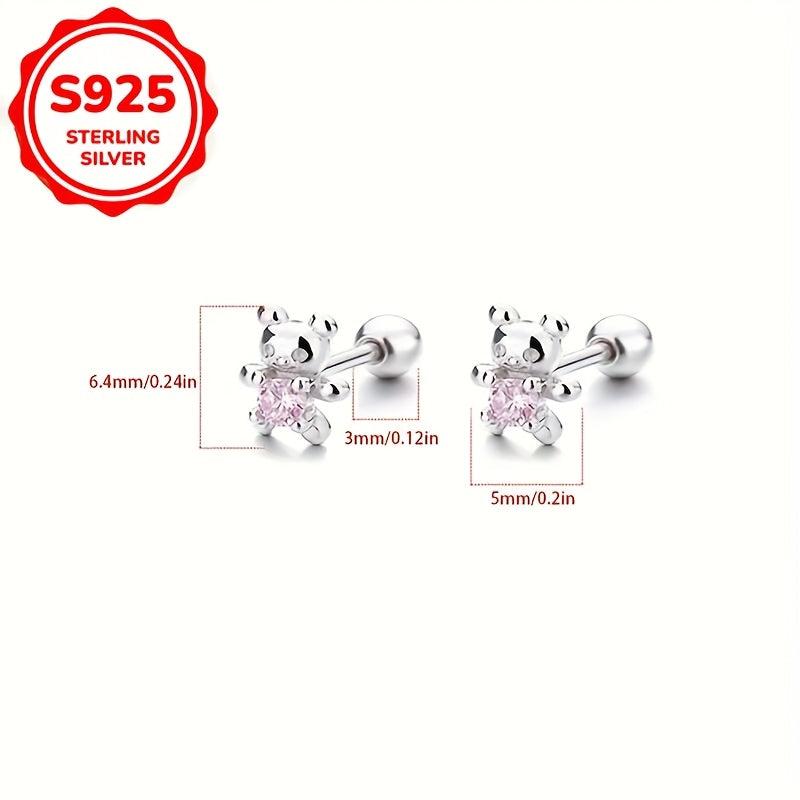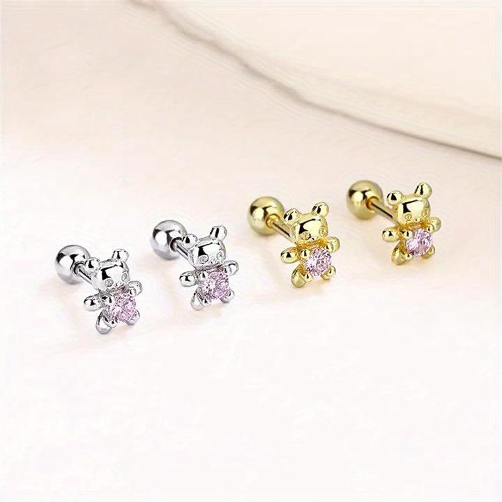 Silver Bear Stud Earrings Zirconia Hypoallergenic Japanese Style