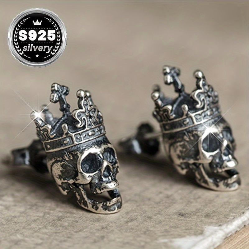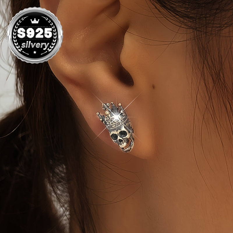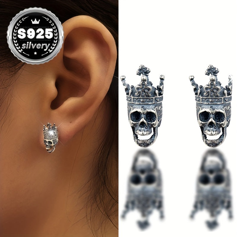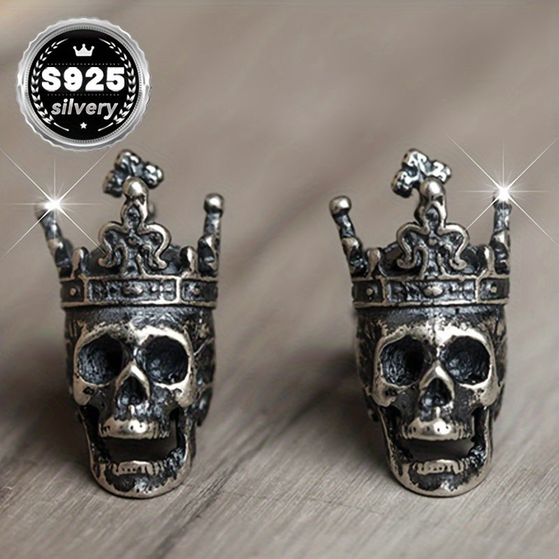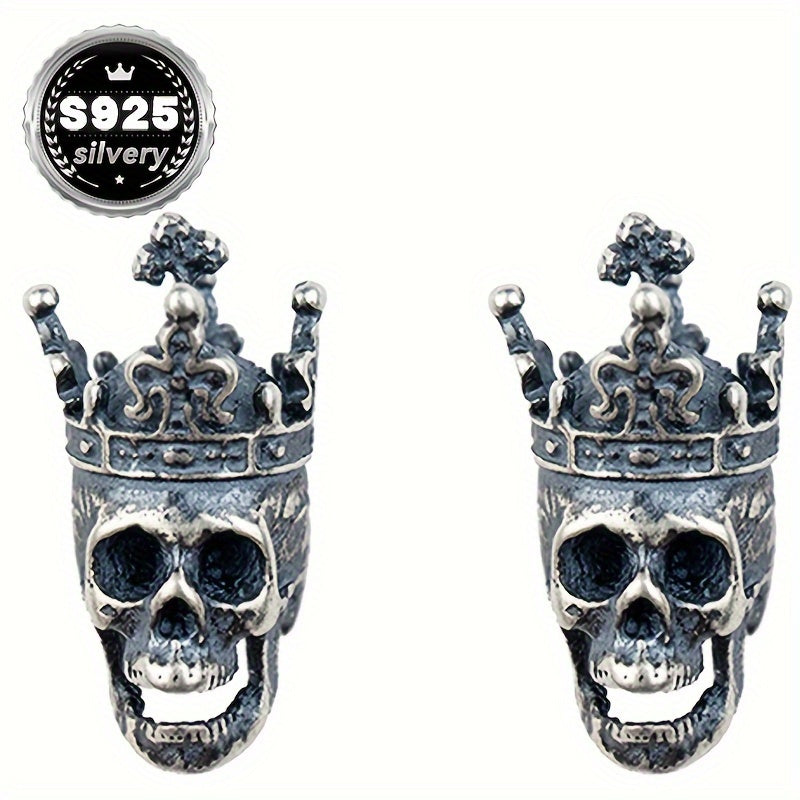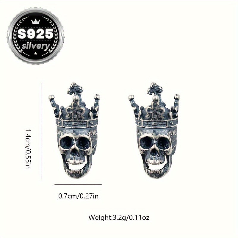 925 Pure Silvery, Weight 3.2g, Skull King Crown Earrings, Retro Gothic Punk Style, Halloween Party Ea