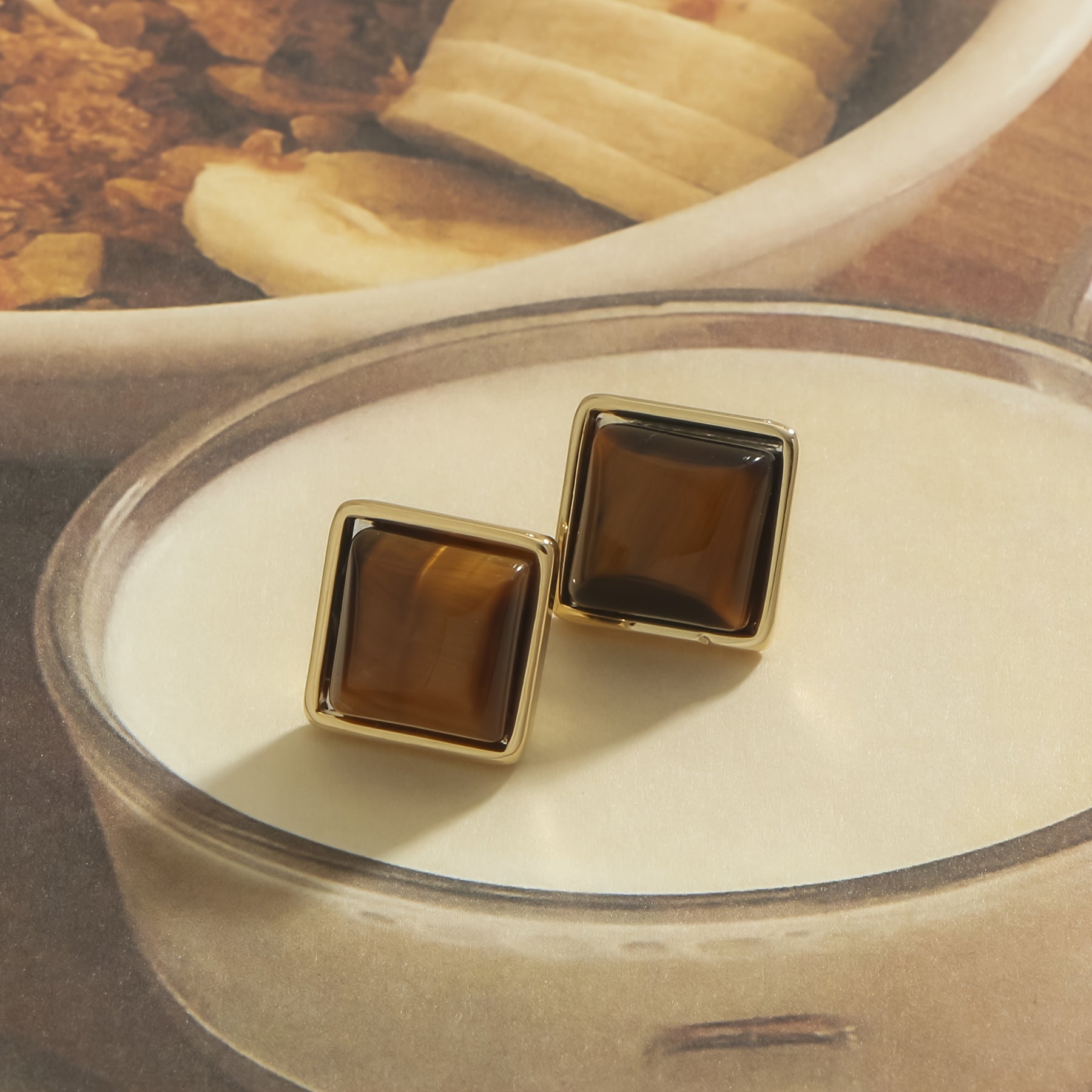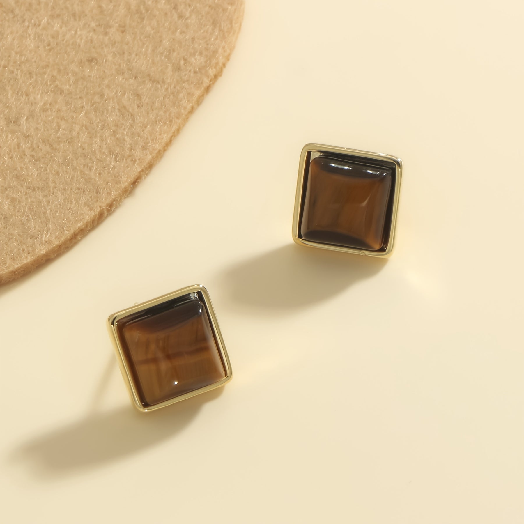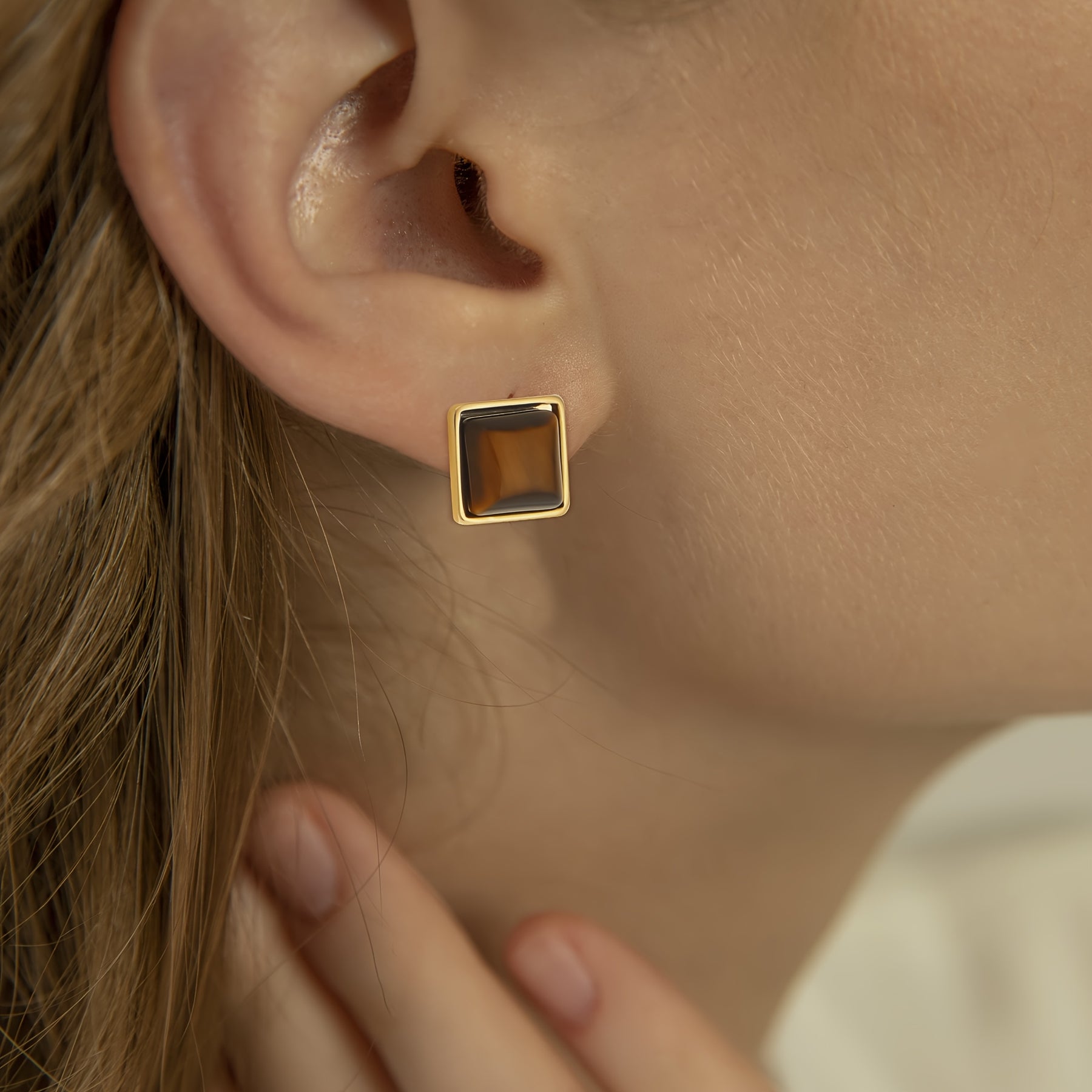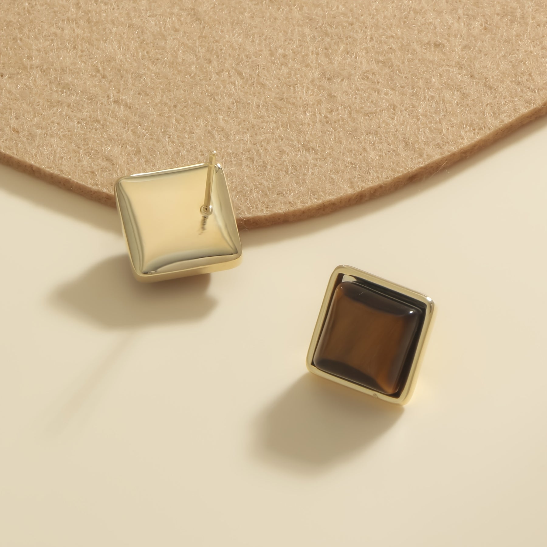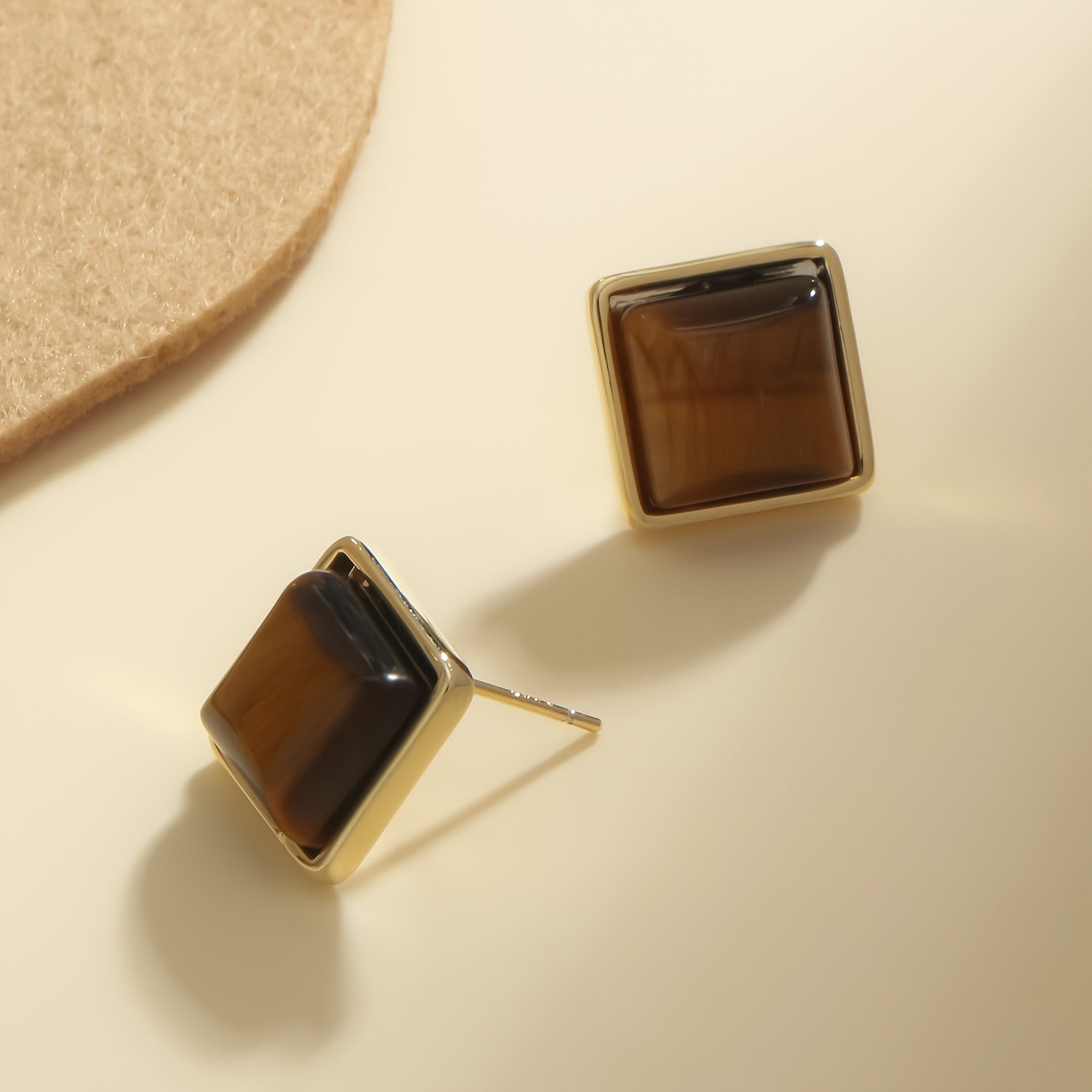 Chic square stud earrings made of copper with UV plating and 925 sterling silver posts. Hypoallergenic design with synthetic amber resin inlay for daily wear.