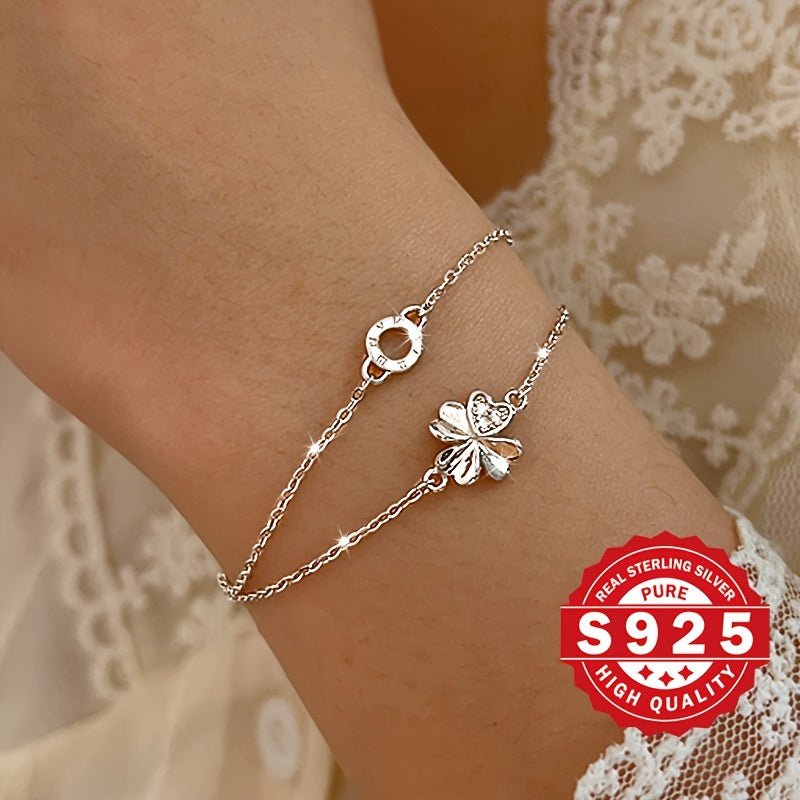 This elegant double-layer bracelet features a lucky four-leaf clover design in 925 silver. It is suitable for both high-end business and casual wear.
