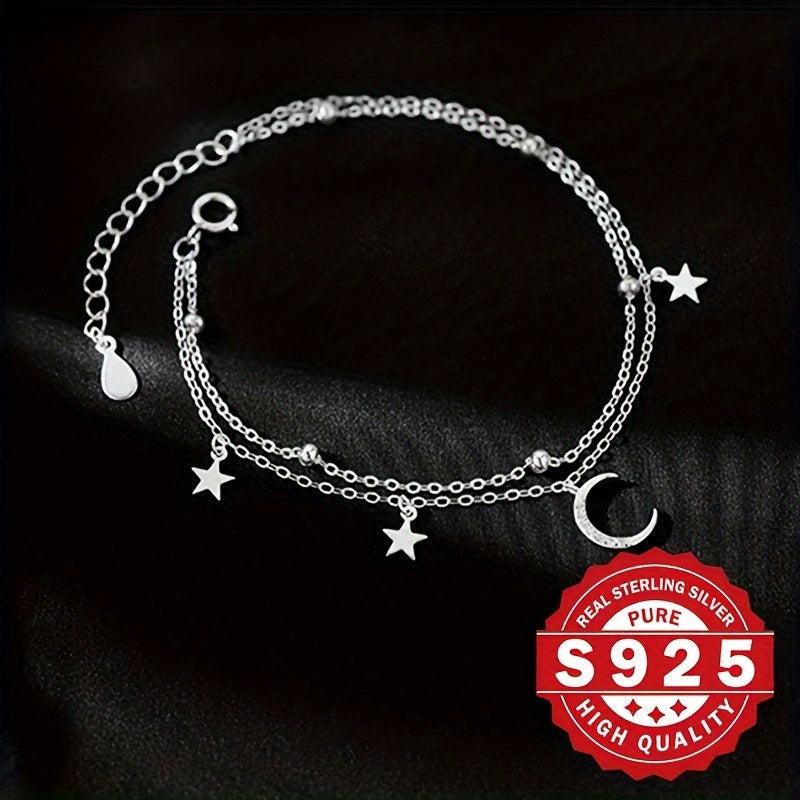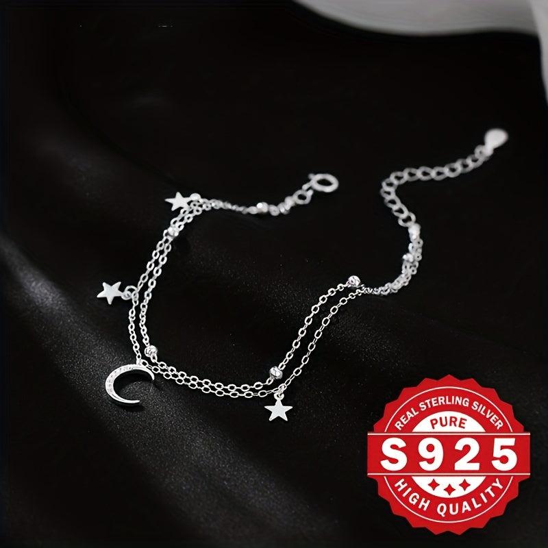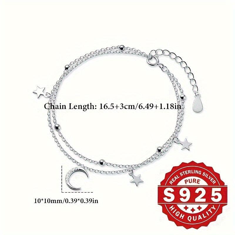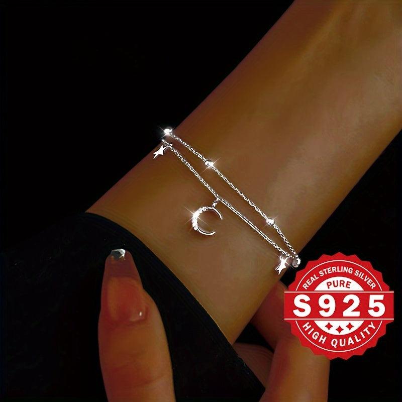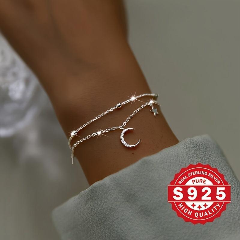 This charming bracelet features a double layer design with star and moon charms set in s925 silver. Adorned with artificial zirconia for added sparkle, this bracelet exudes a fresh forest style.