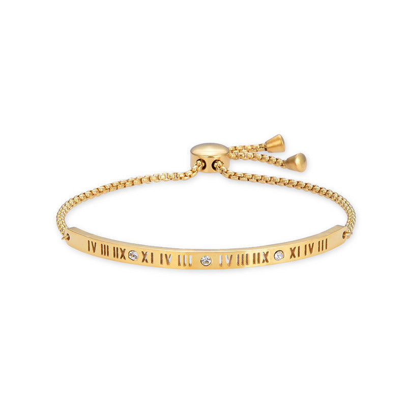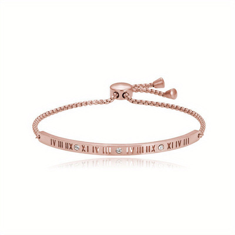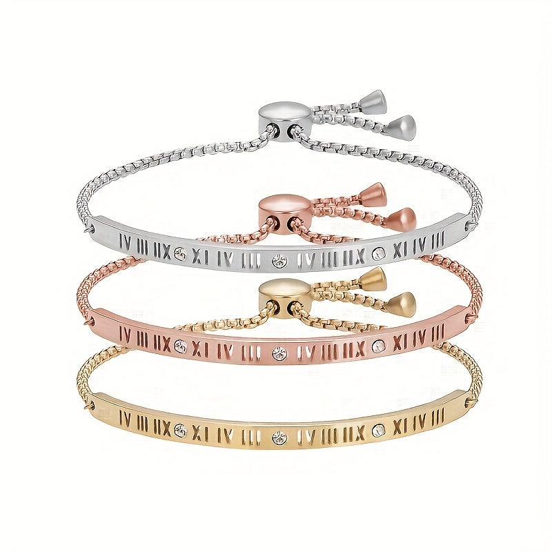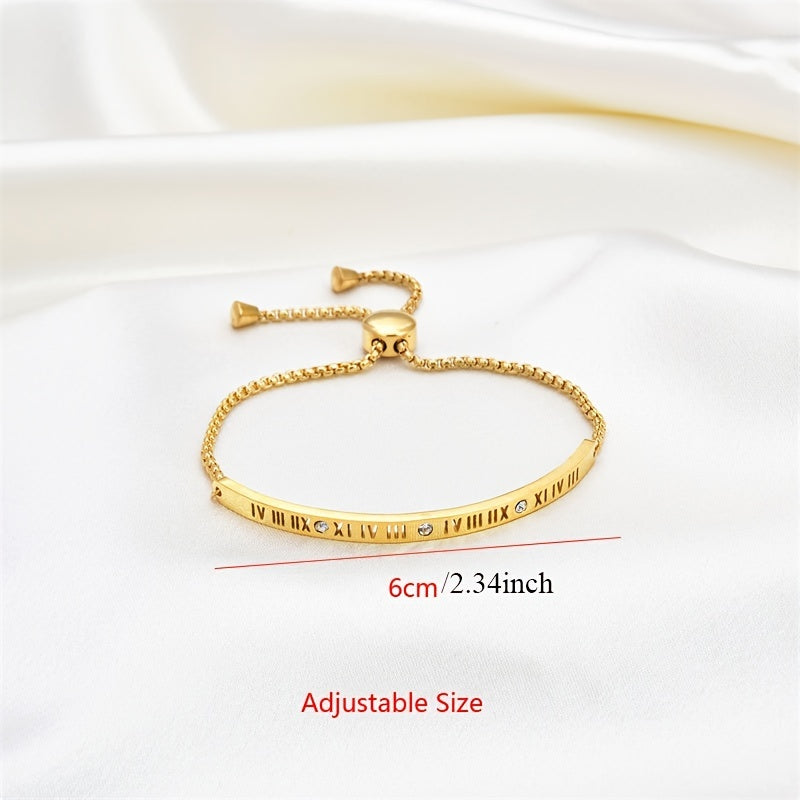 This stylish stainless steel bracelet features adjustable sizing and elegant Roman numerals design. Perfect for parties and other special occasions.