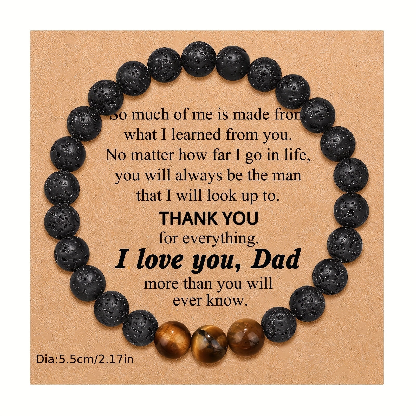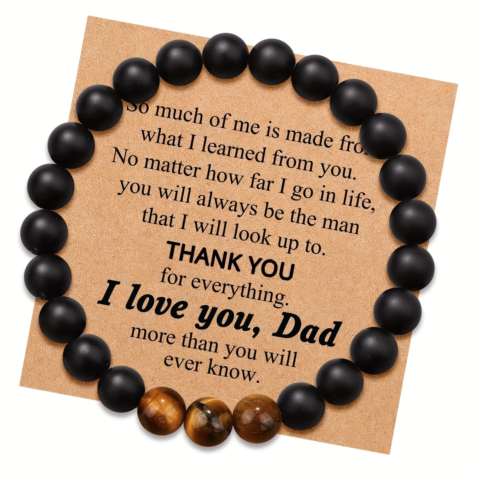 This frosted bracelet with agate, tiger eye, and volcanic stone is a perfect gift for fathers. Comes with a blessing card.