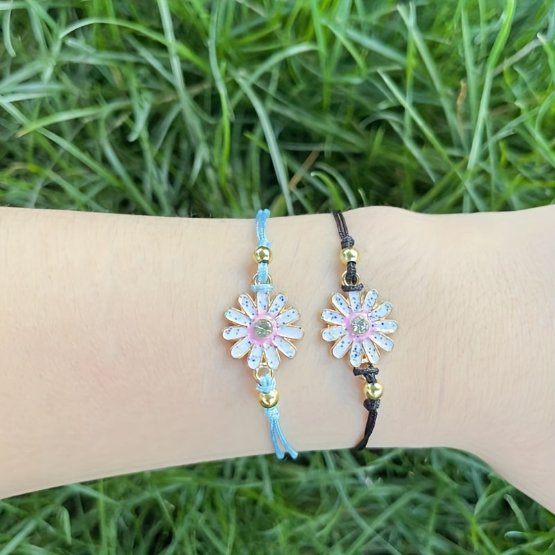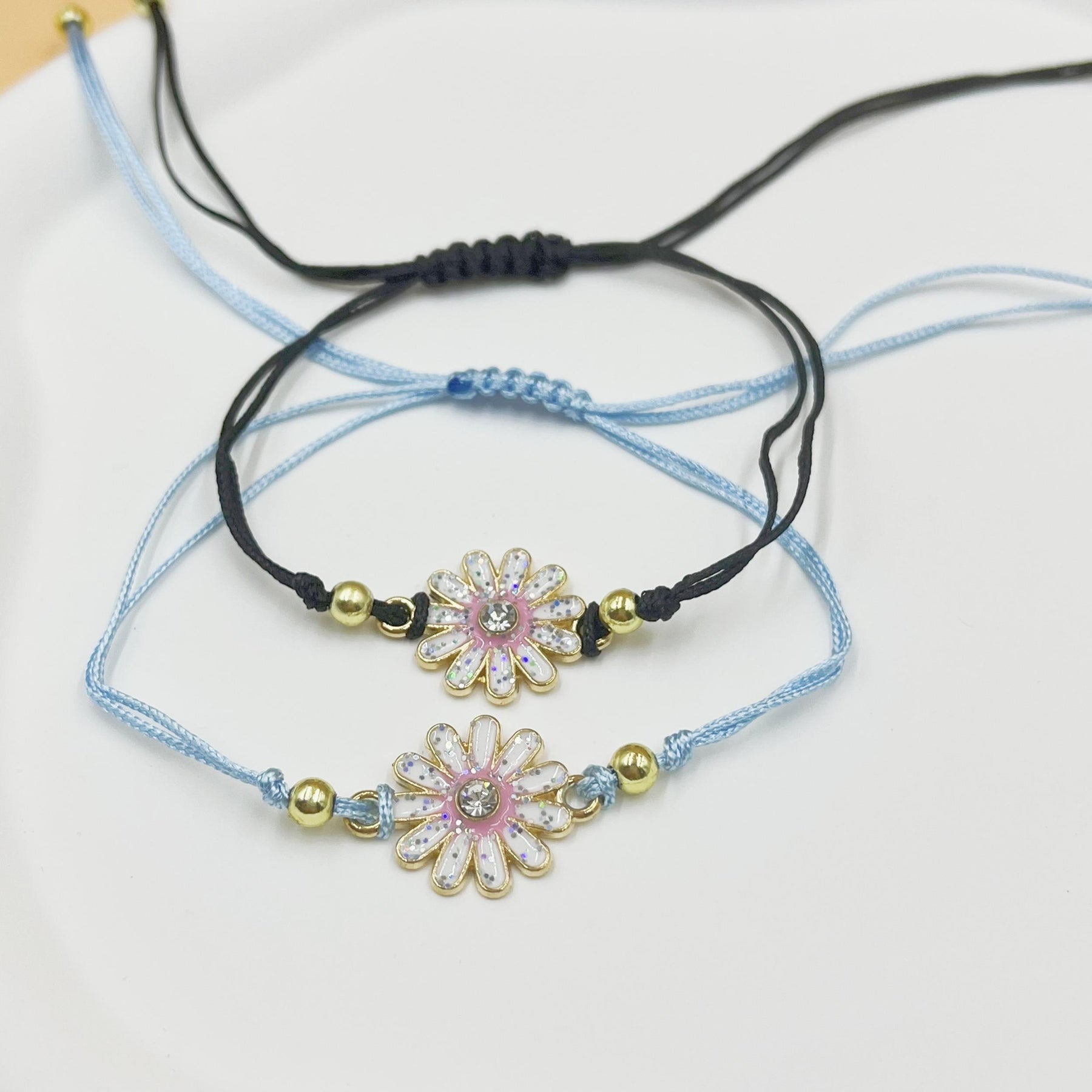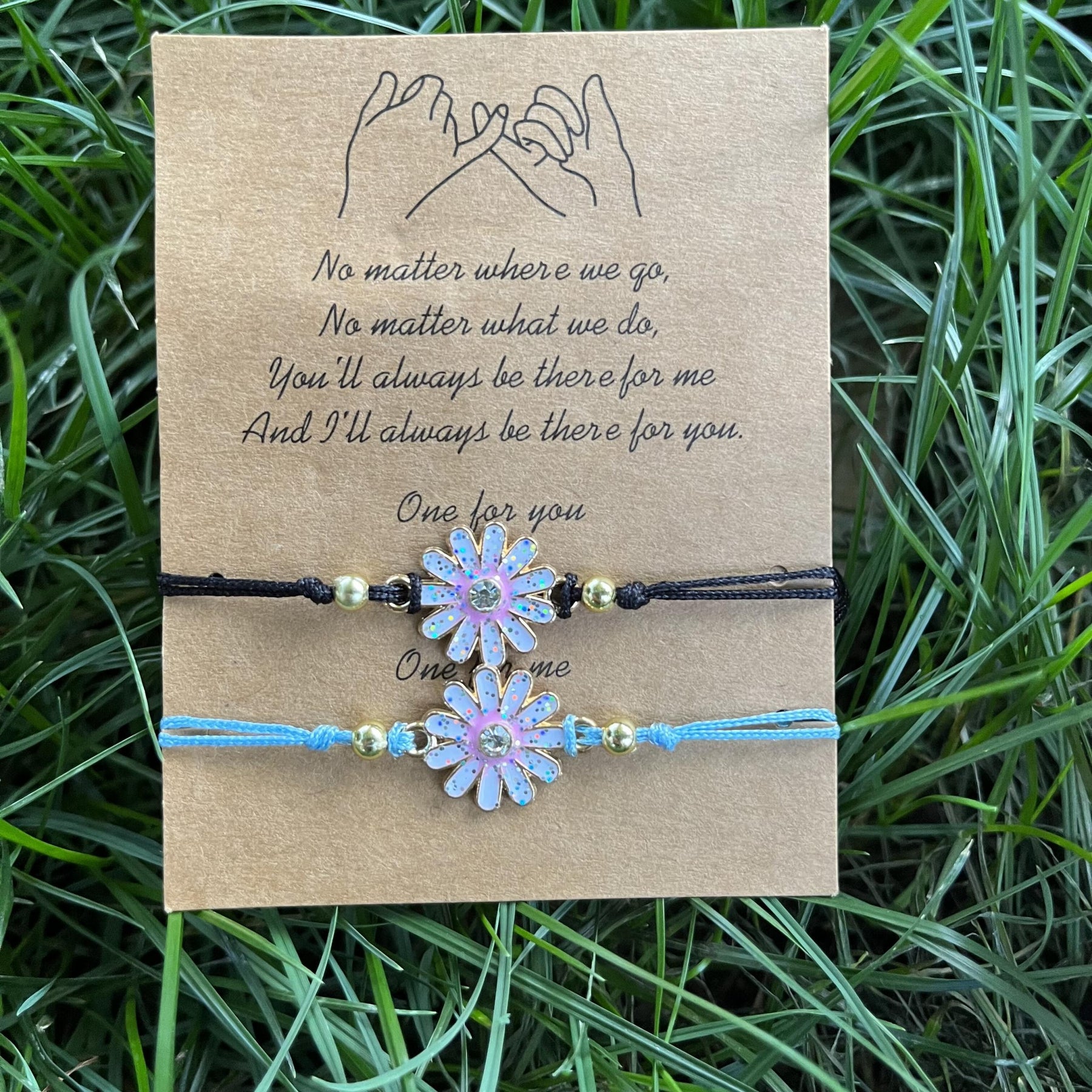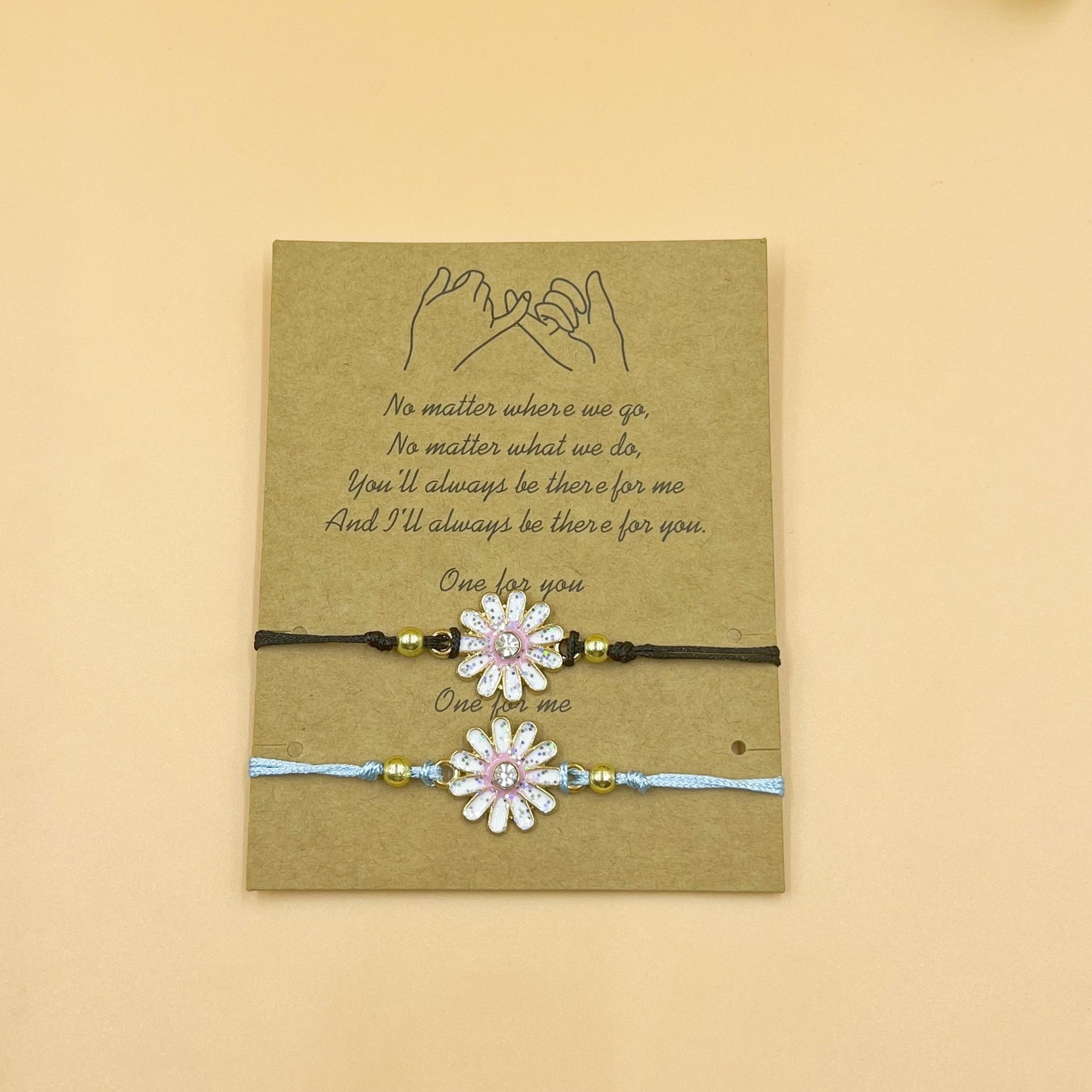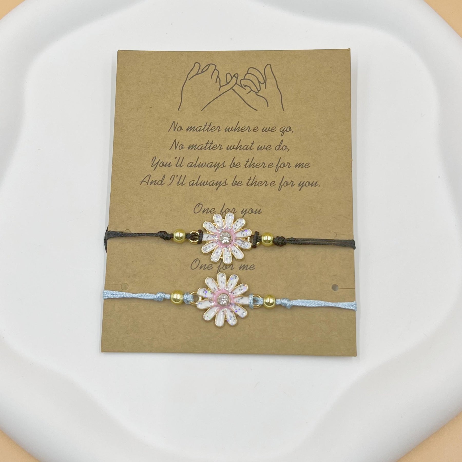 This set includes 2 bohemian style braided friendship bracelets adorned with colorful flowers. Comes with a blessing card for a special touch.