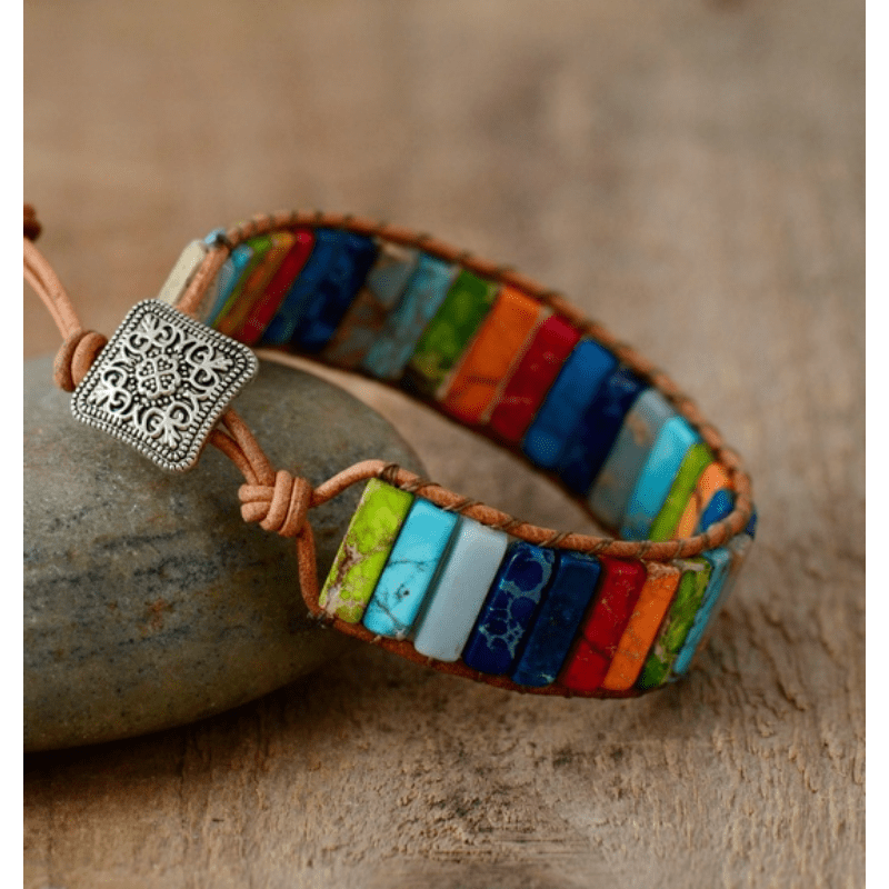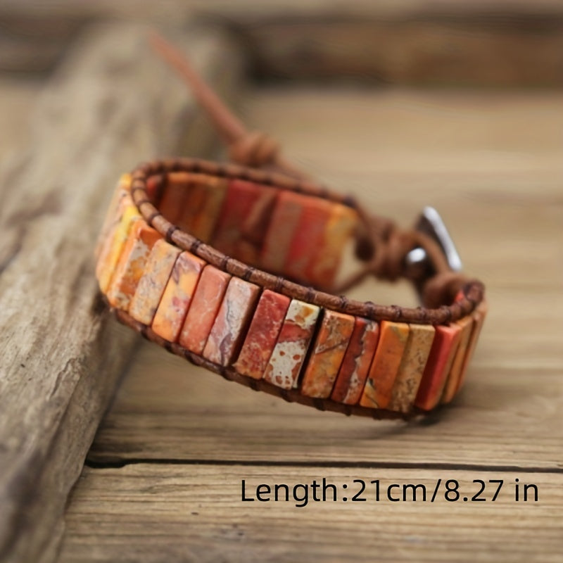 Add a touch of bohemian style to your look with this colorful woven stone bracelet designed for men.