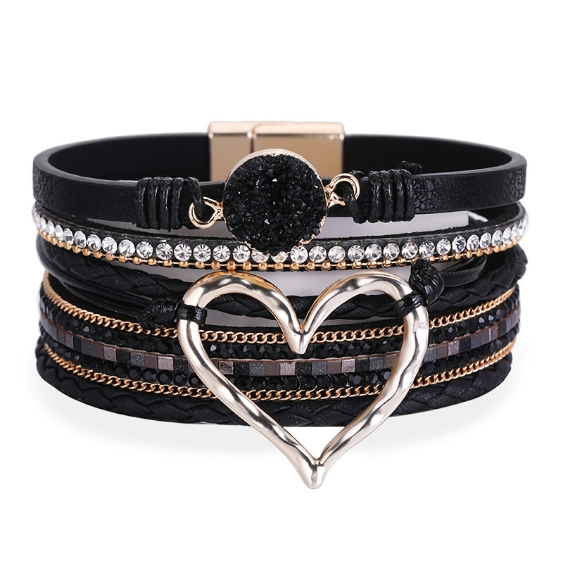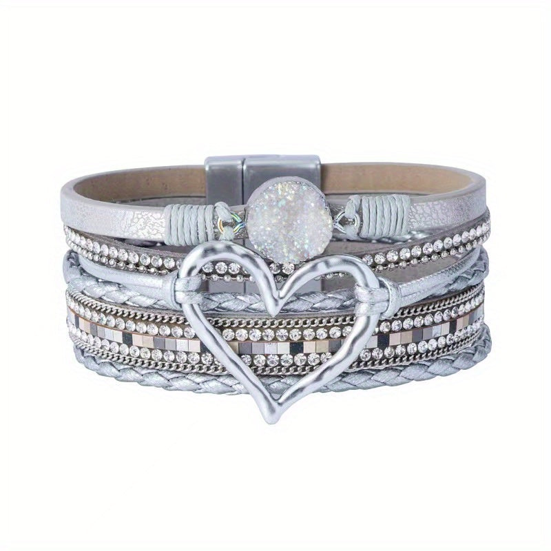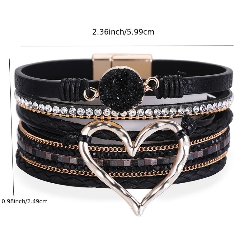 This multilayer wrap leather bracelet for women features a bohemian design with a heart-shaped magnetic clasp. It is a stylish cuff bangle that adds a touch of sophistication to any outfit.