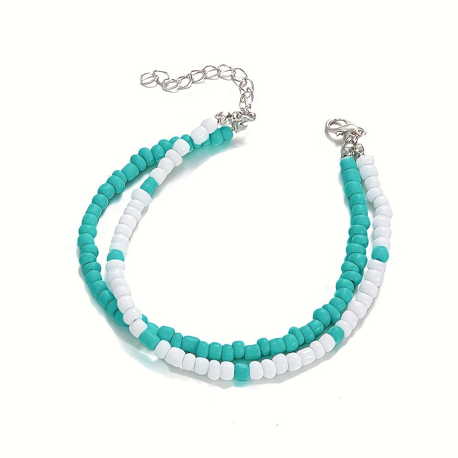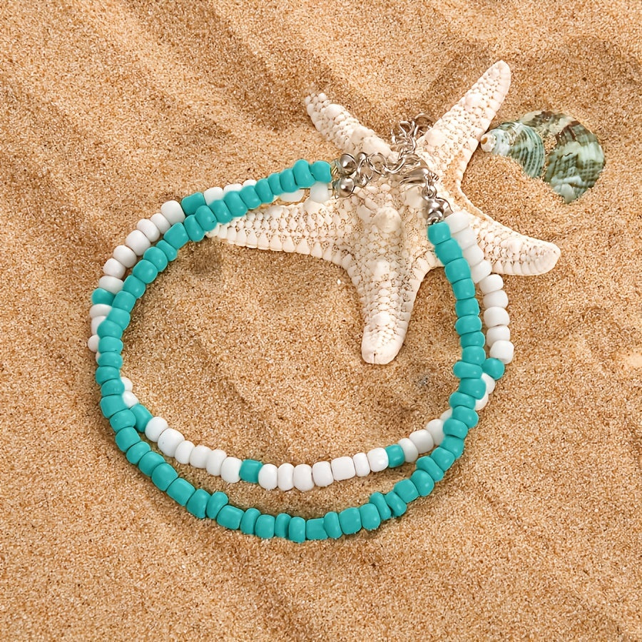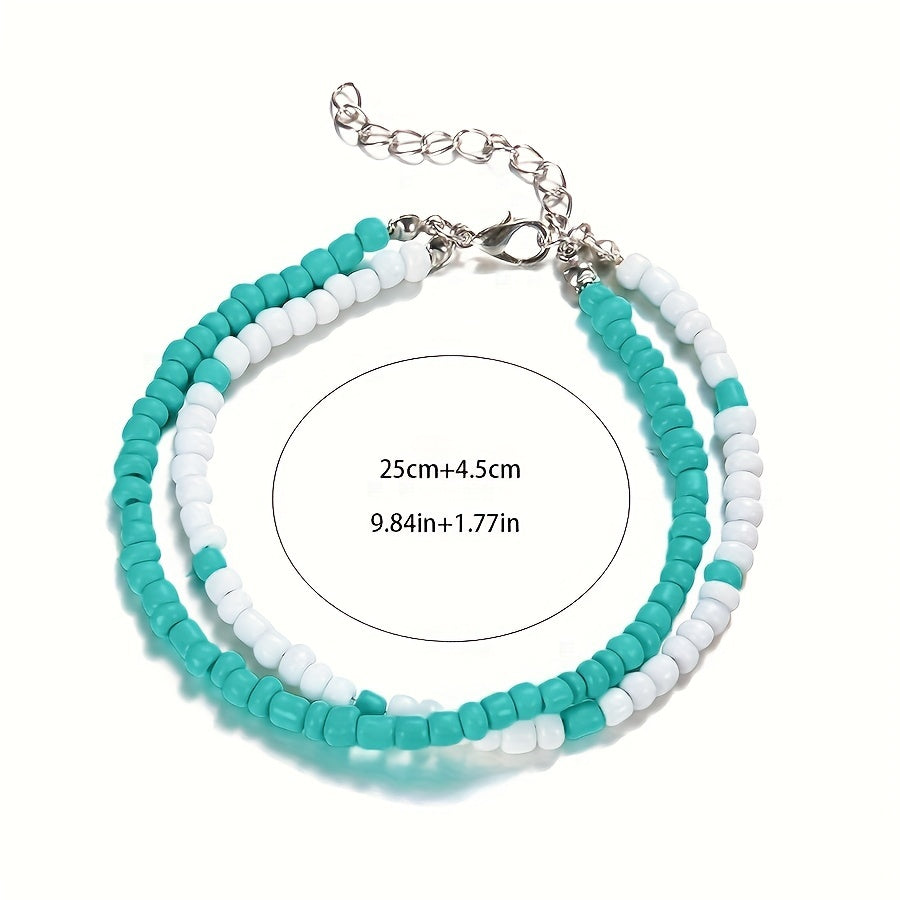 Elevate your boho style with this double layer beaded anklet featuring rice beads. Perfect for adding a touch of charm to your look.