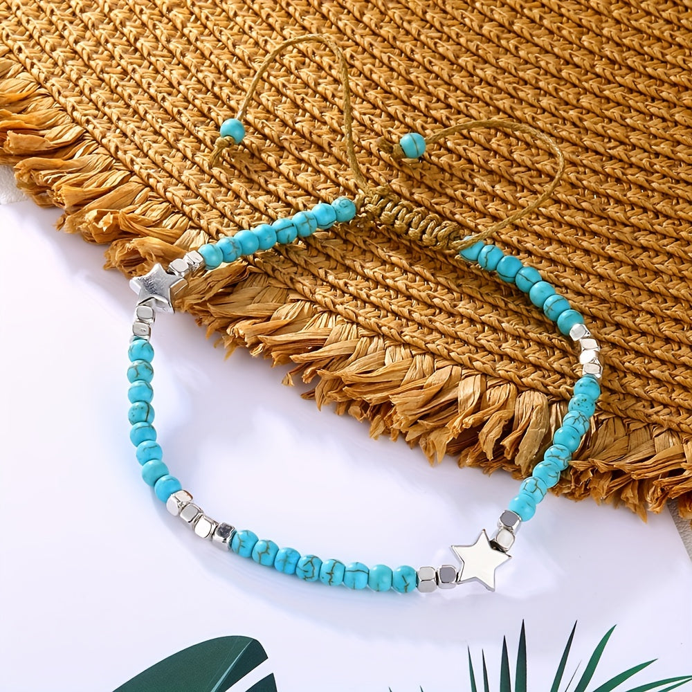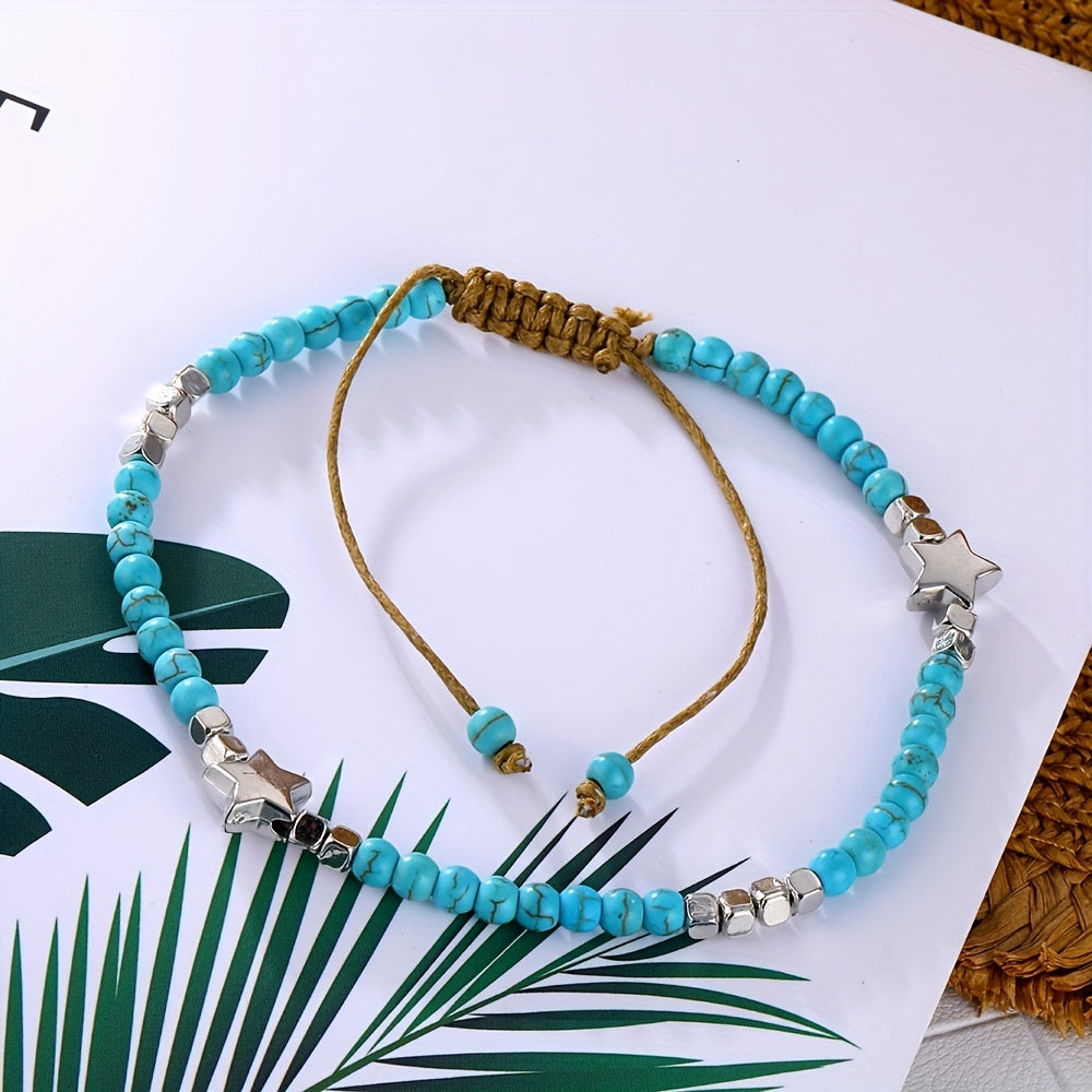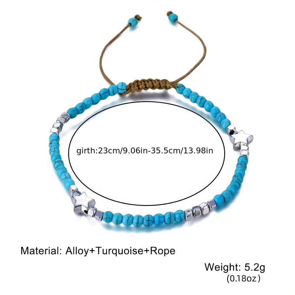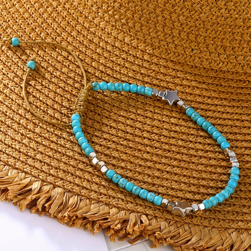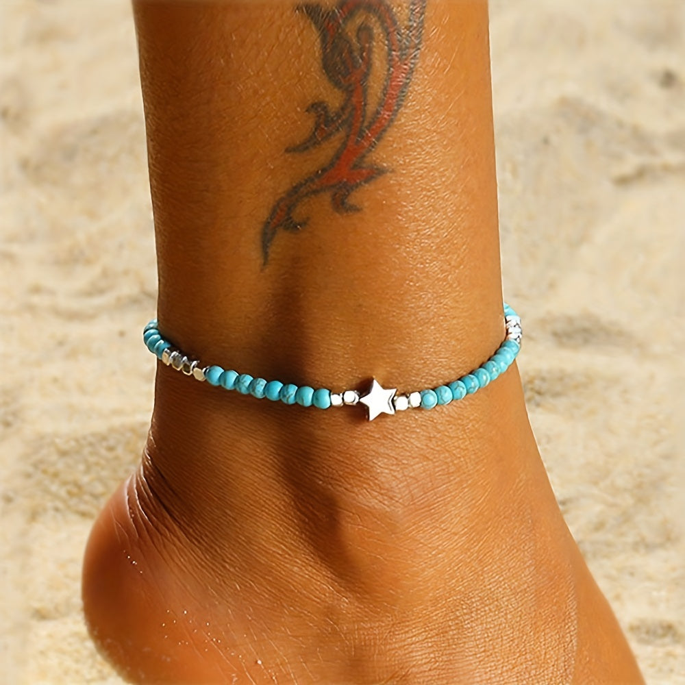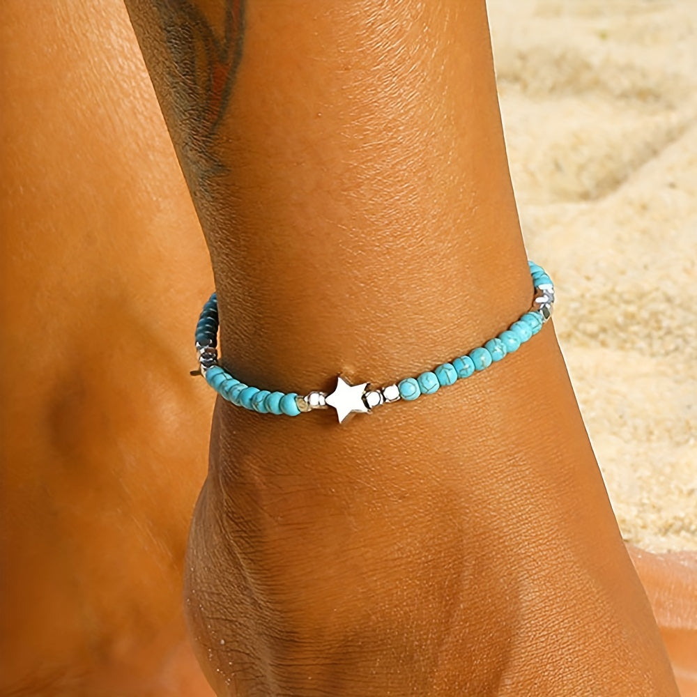 Elevate your ankle jewelry collection with this ocean boho style anklet featuring mini star and round turquoise beads. Embrace a vintage vibe with this charming ankle bracelet.